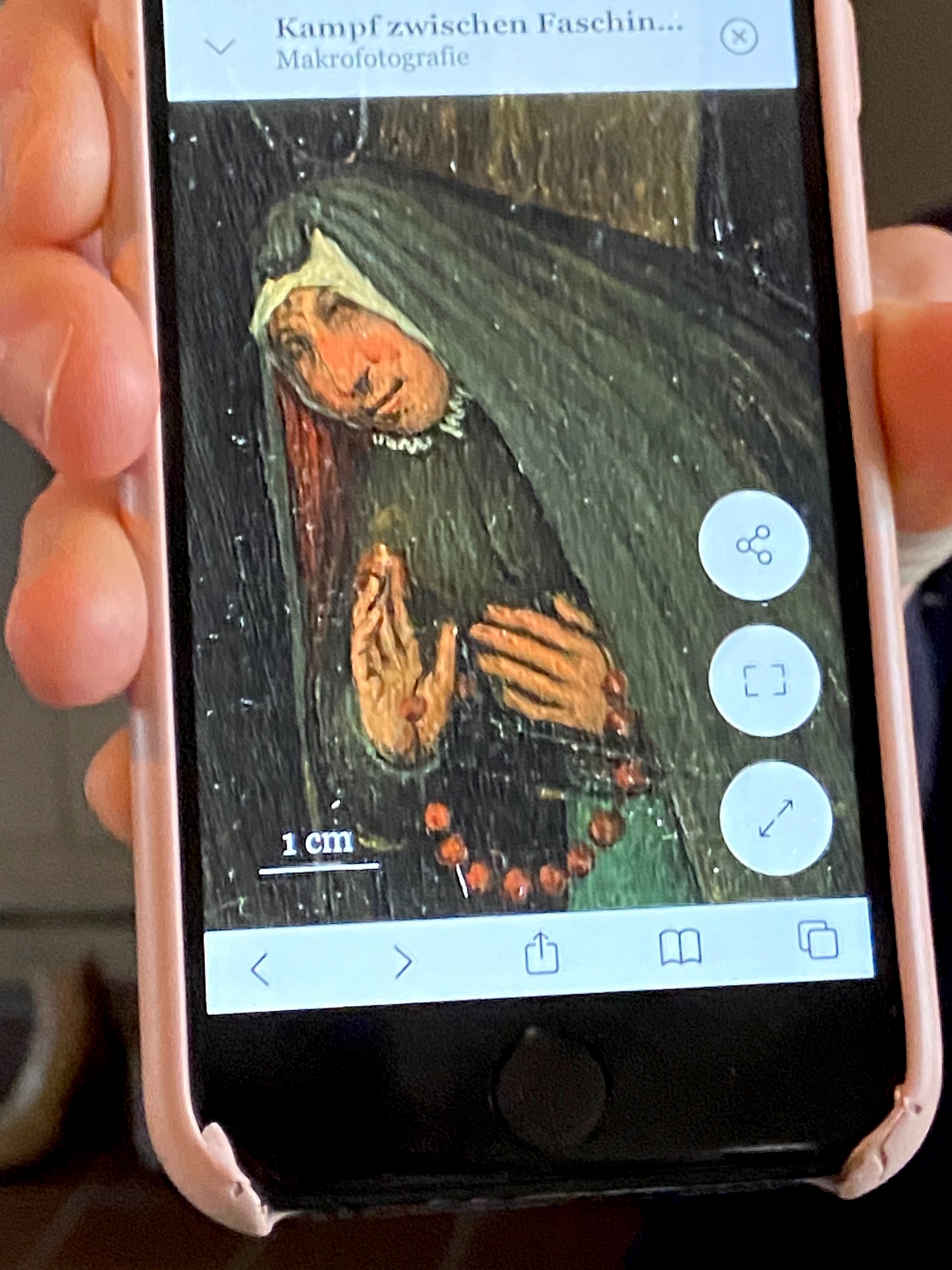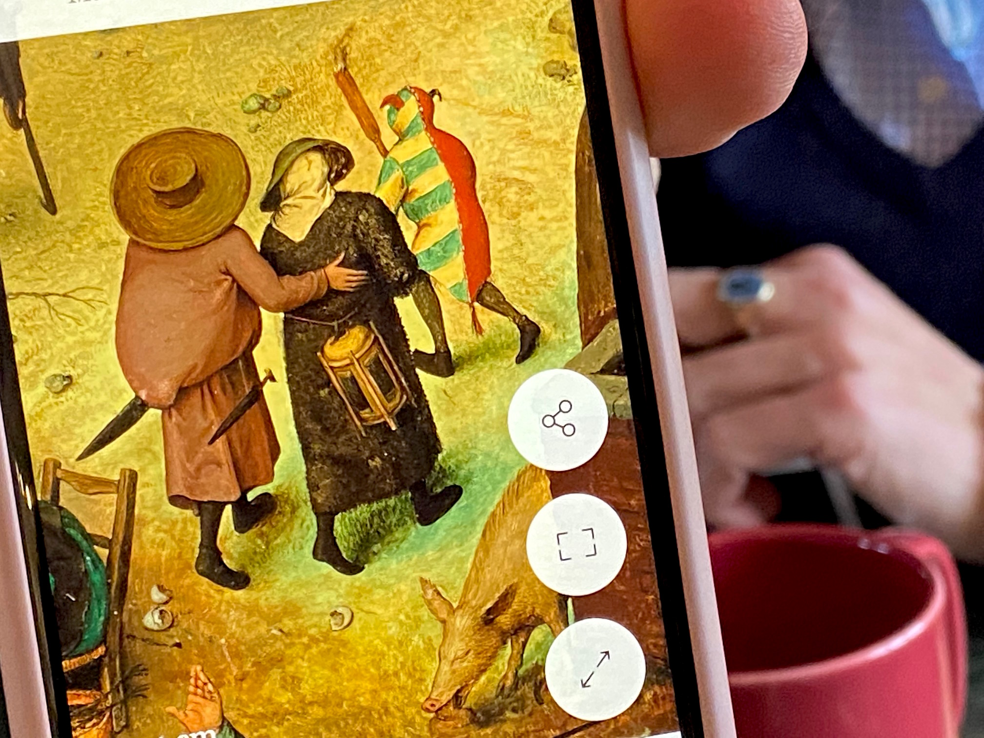 Alles ist gleich wichtig, alles wird gesehen und nebeneinander gestellt. Was für eine Revolution zu den vorherigen Kunstepochen, in denen das Höfische und Religiöse ausschließlich als erwähnenswert galt. Nun ist es das Volk, das Bruegel wie ein Chronist darstellt. Karen kann gar nicht aufhören, eine Szene nach der anderen zu beschreiben. Das I-Pad hat seinen Geist aufgegeben, das Handy tut es auch.