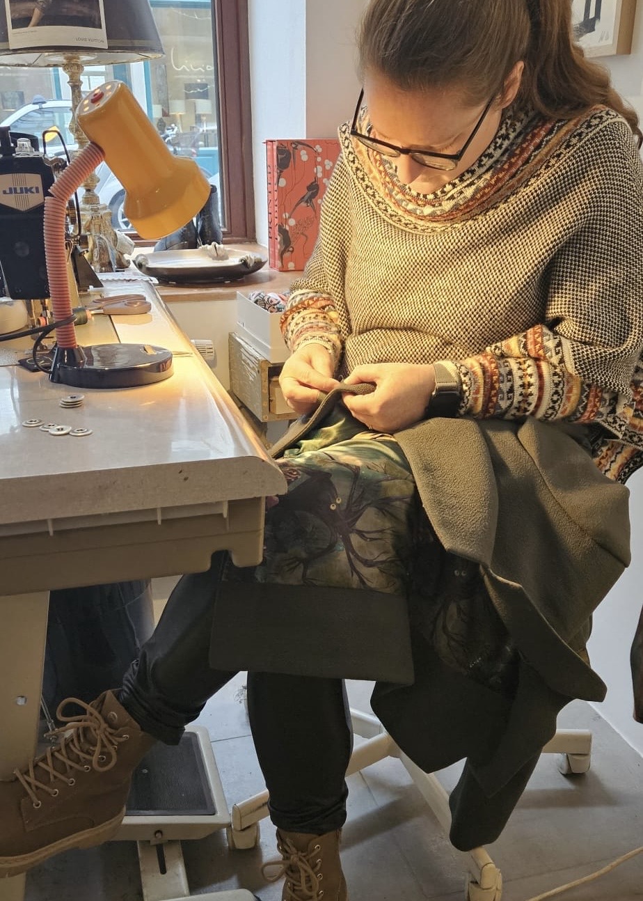 Leise surrt ihre Maschine, während neben mir aus dem Lautsprecher Jo Dassin singt. Ich mag so eine Atmosphäre, friedlich fühlt es sich an. Der Raum ist gefüllt mit kreativen und arbeitsamen Schwingungen. Ihr solltet mal vorbei schauen.