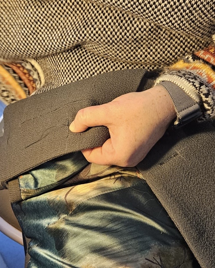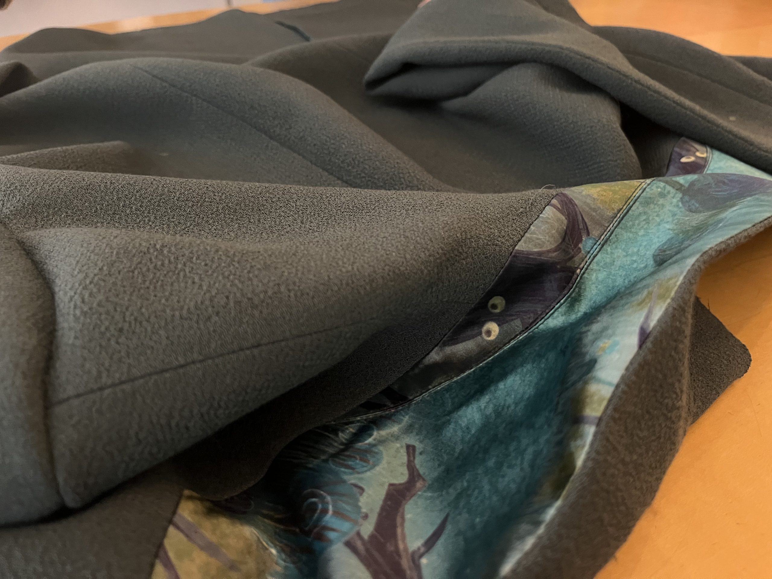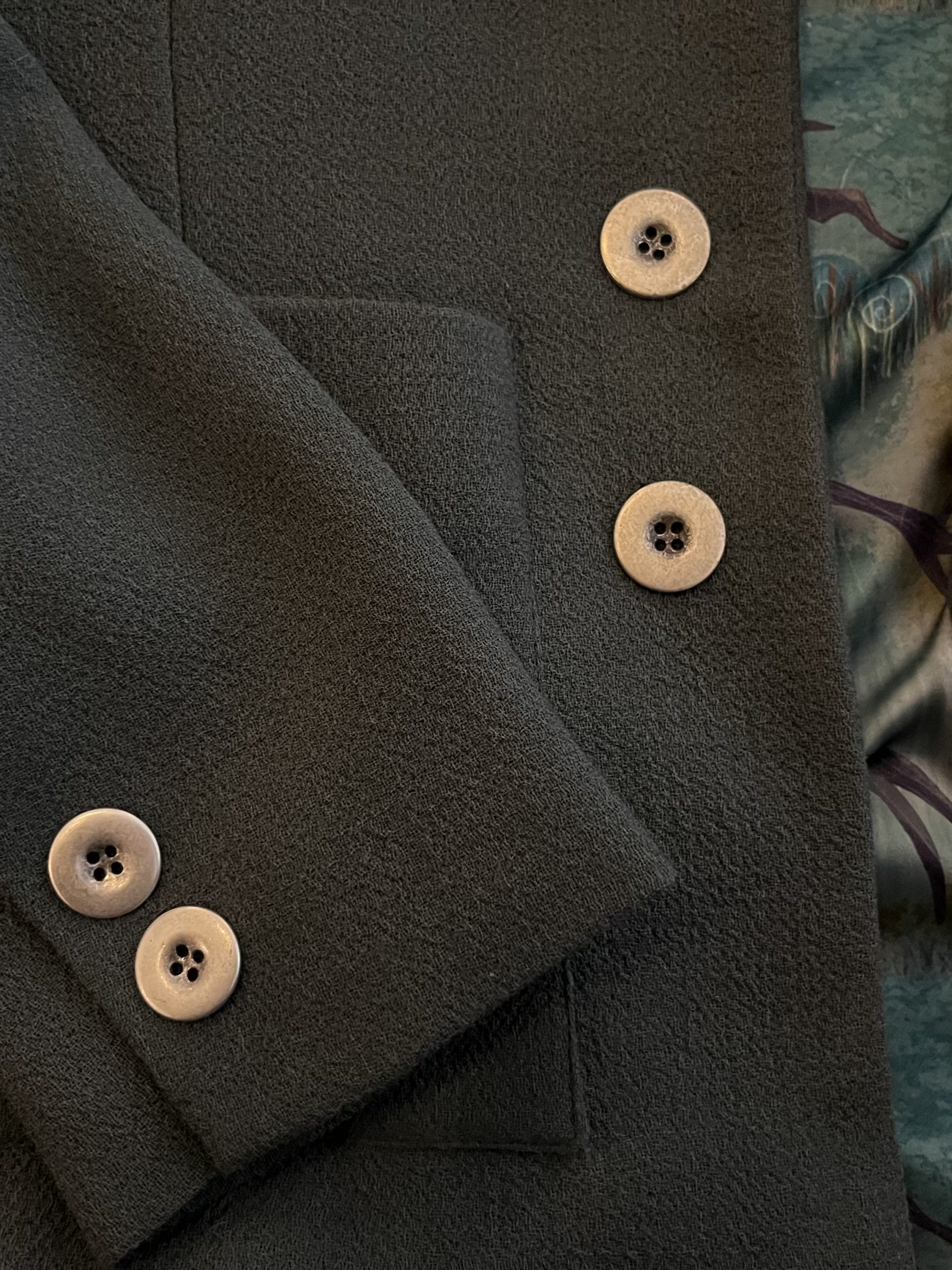 Mit Genuss schaue ich zu, wie sie still und konzentriert die einzelnen Elemente zuschneidet, den Kragen mit dem Childhood Futter verstürzt, den Ärmel einfügt, die Taschen mit Nadeln fixiert. Die Knopflöcher werden mit der Hand genäht.