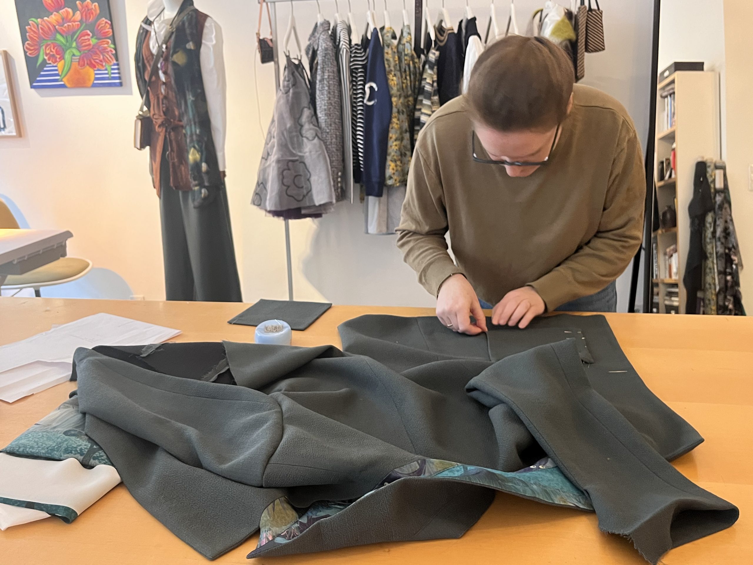 Ihre erste Arbeit ist der neue Blazer. Ein ähnliches Modell gab es schon in der Muschel-Kollektion. Wir passten den Schnitt an den aktuellen Wollcrêpe Stoff an. Melle, die Atelier-Chefin, und Anne diskutieren die Abläufe. Sie haben unterschiedliche Ausbildungen. Melle ist Industrie-Scheiderin, ihr geht es darum, die serielle Fertigung zu systematisieren und zeitlich zu optimieren. Bei Anne wird sehr viel mit der Hand gemacht und individualisiert. Da ticken die Uhren langsamer.