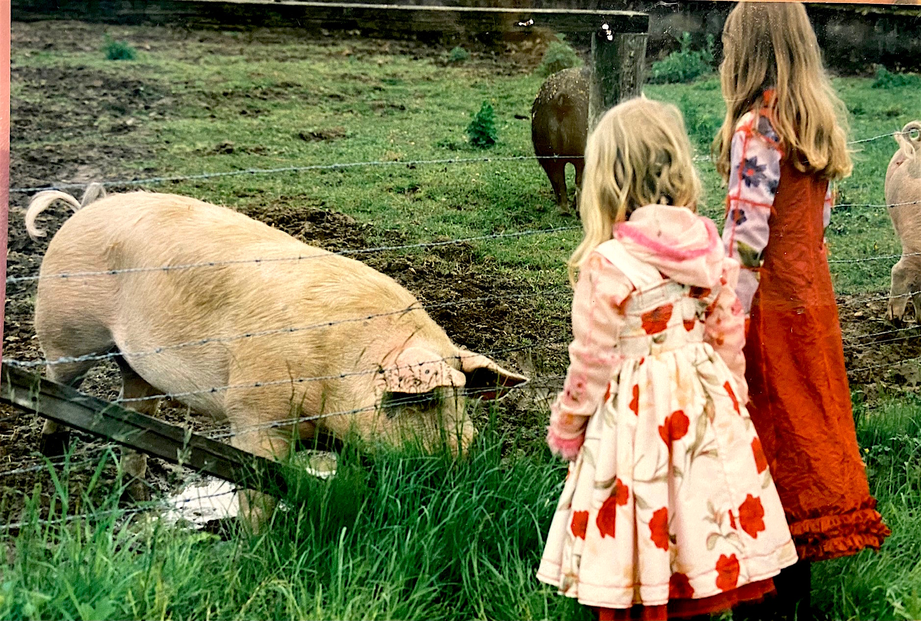 Abb: Roma und Toska in den ersten Kleidchen auf dem Land zwischen Blumenwiesen und ihren Lieblingsschweinchen. (2001)
