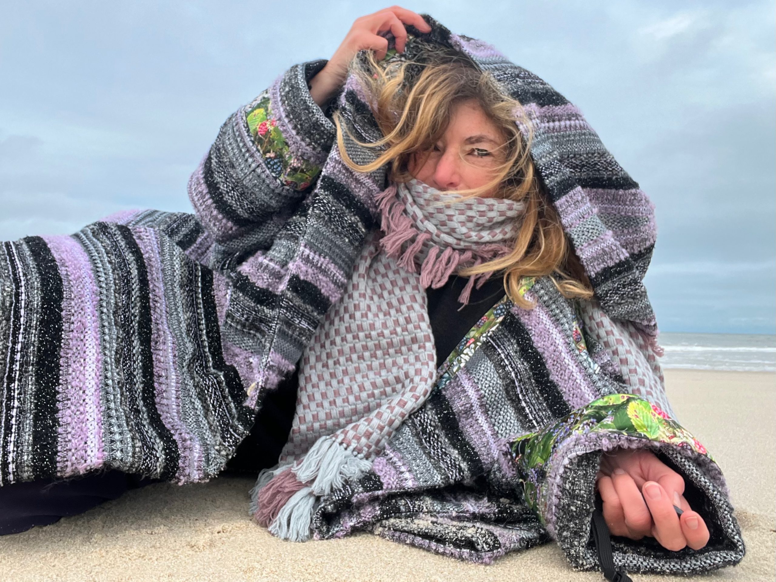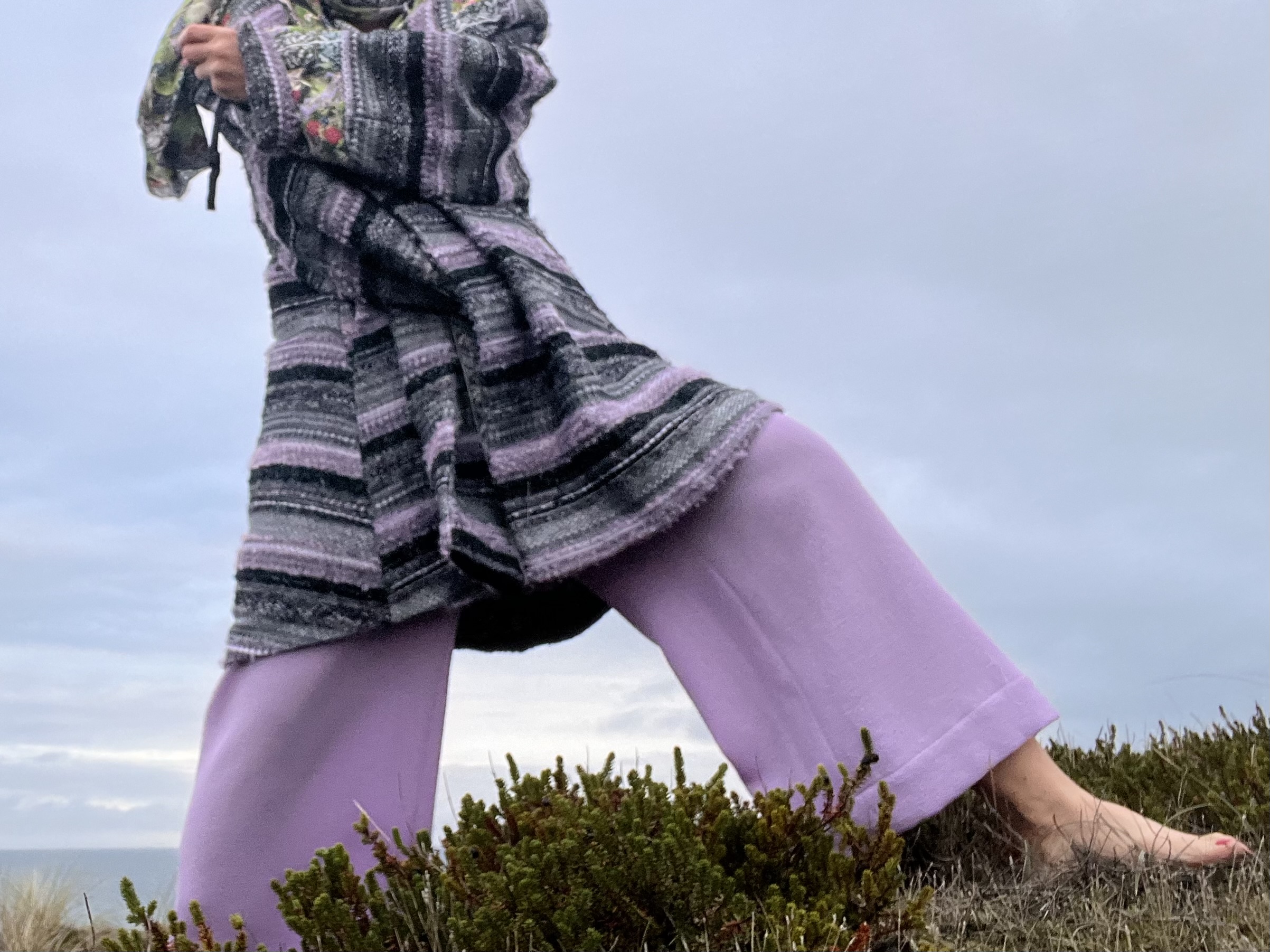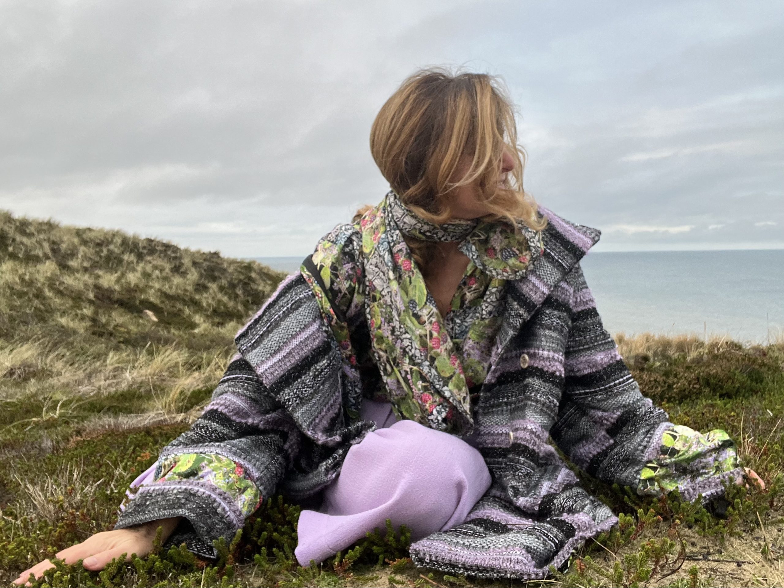 Verblüffend, wie sich das Melange der Bouclé-Garne von Schwarz, Flieder, Grau und Silber in diese herbe Landschaft aus Dünengras, Sand, Moos und Heide, Hagebutten-Sträuchern und Meer einfügt. Hell und dunkel haben sich gefunden.