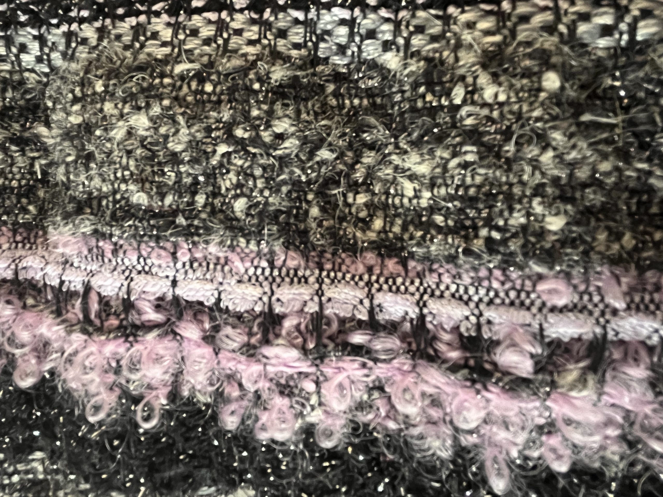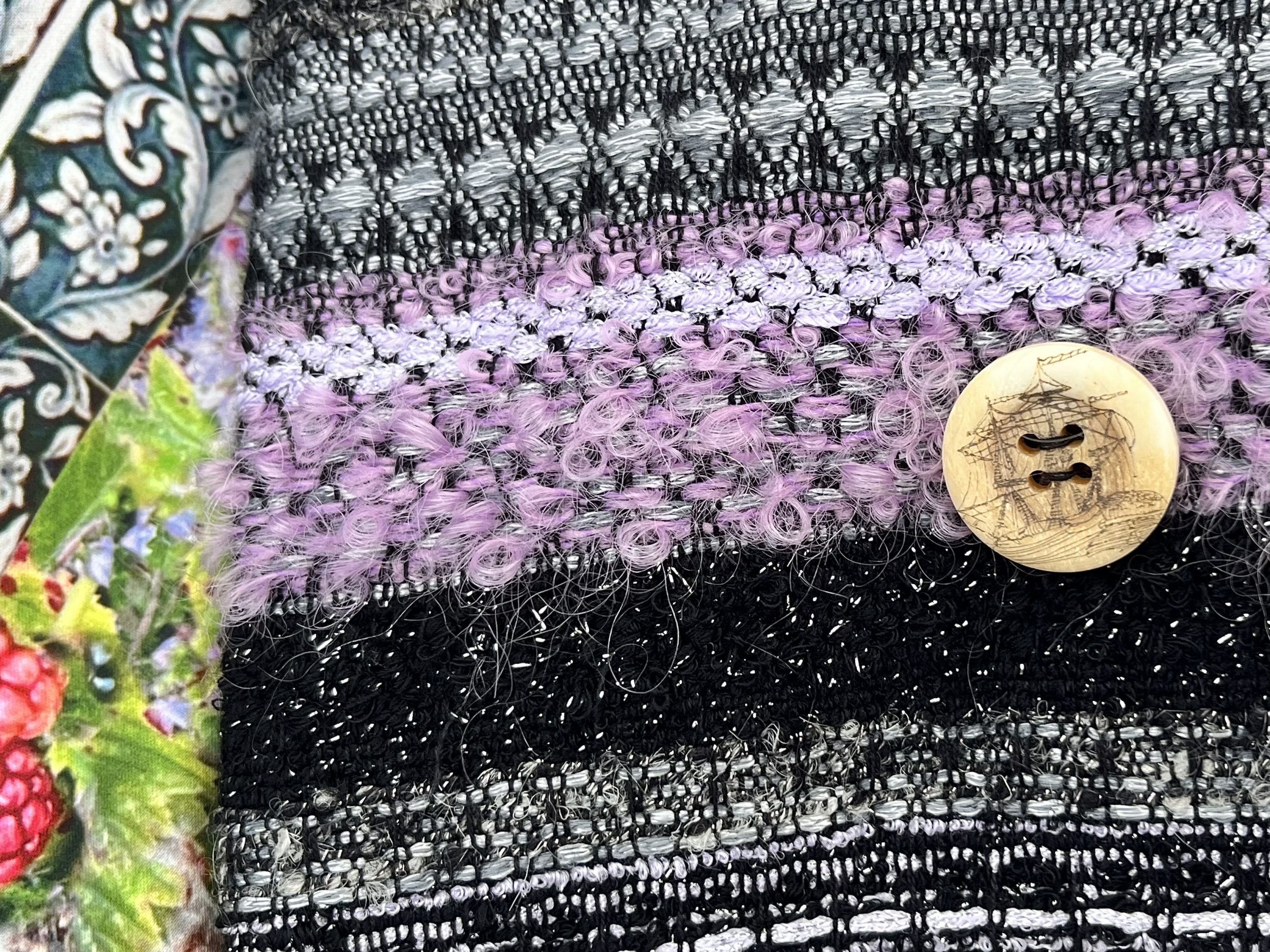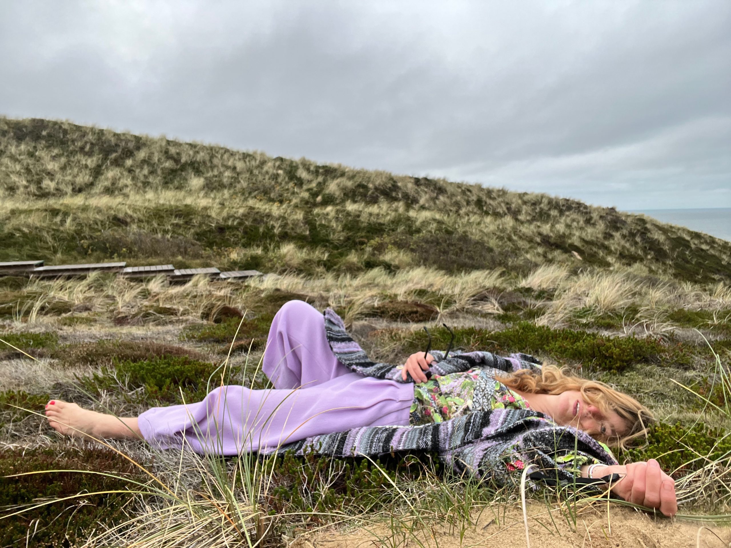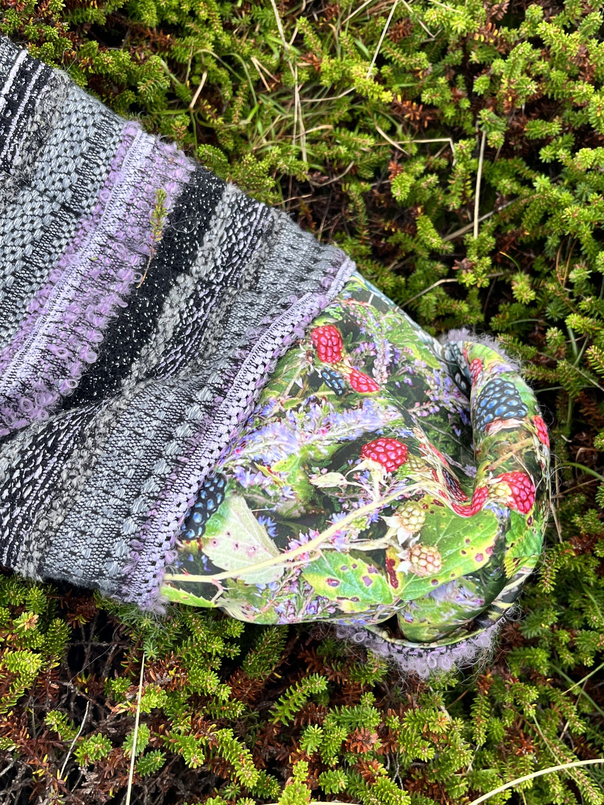 Verblüffend, wie sich das Melange der Bouclé-Garne von Schwarz, Flieder, Grau und Silber in diese herbe Landschaft aus Dünengras, Sand, Moos und Heide, Hagebutten-Sträuchern und Meer einfügt. Hell und dunkel haben sich gefunden.