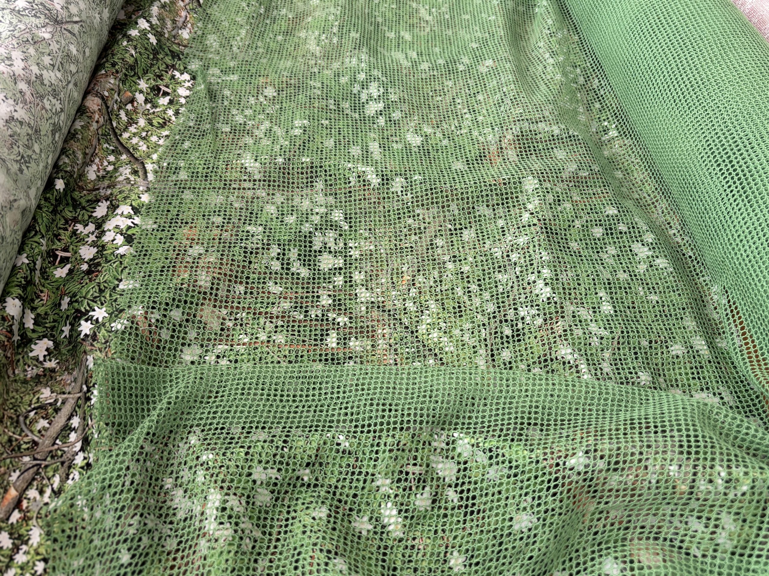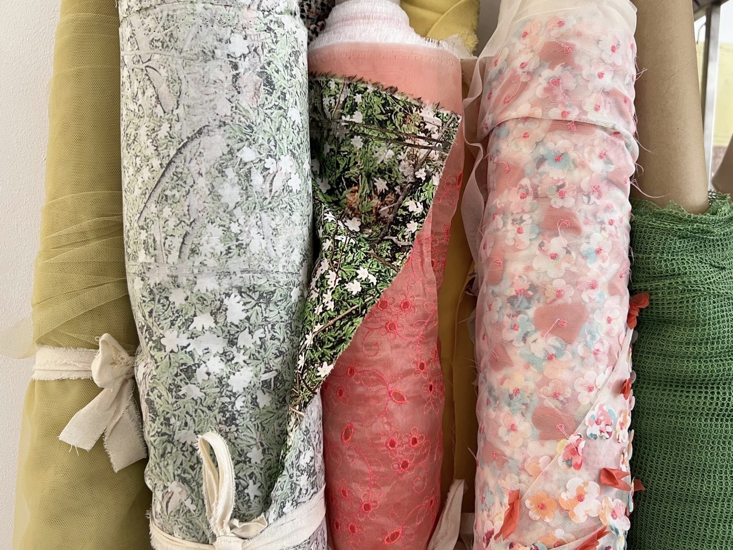 Womit beginnen? Vielleicht mit dem Waldblumen-Cotton und dem gewebten Tüll aus Paris, gefertigt von Sophie Hallette, der berühmten Haute Couture Manufaktur. Anne und ich entscheiden, dass wir beide Material überlagern könnten, was einen besonderen Effekt ergibt, ähnlich wie wir ihn in der Natur finden mit den Spinnweben, die über den Gräsern liegen.