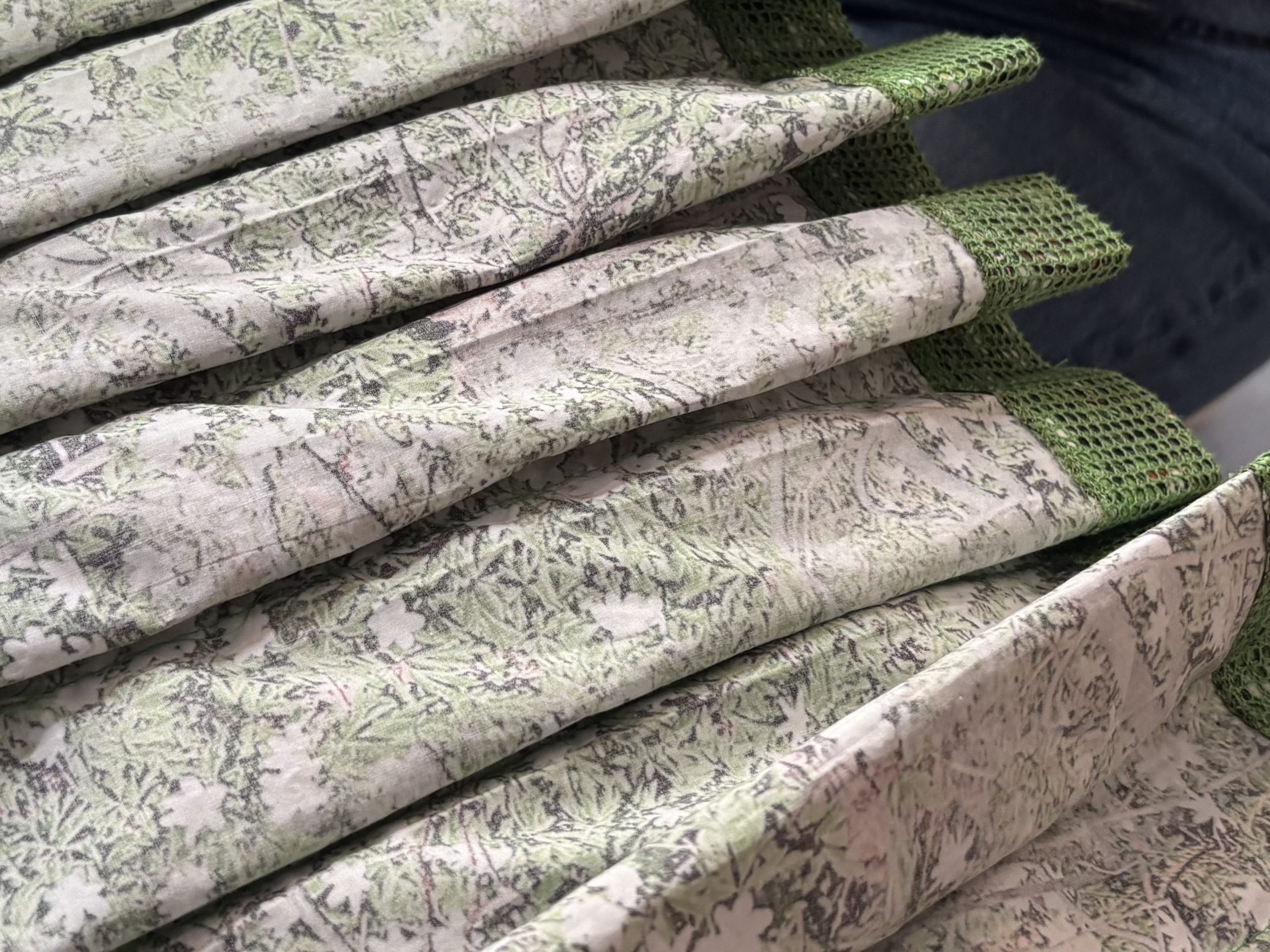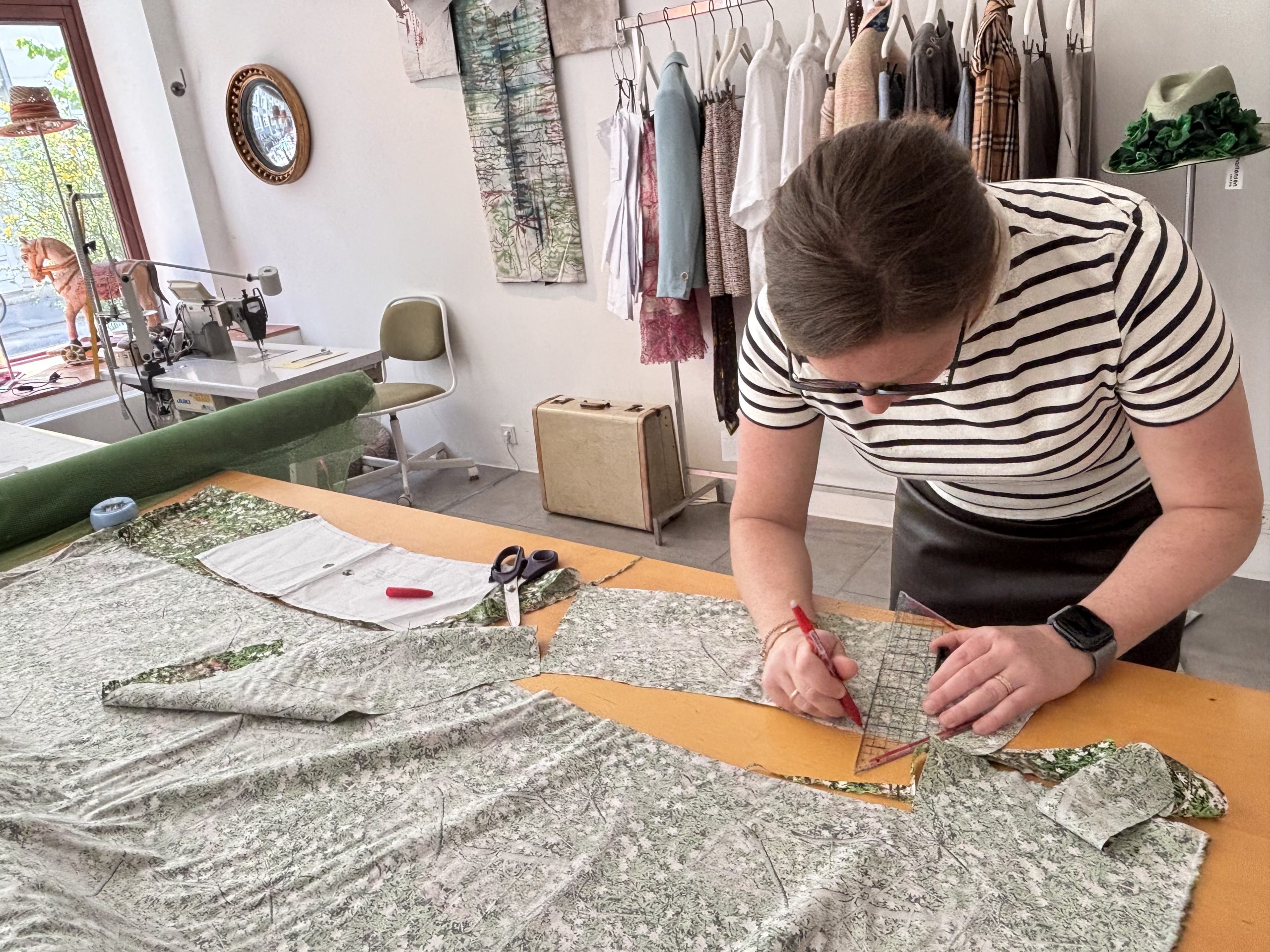 Sorgfältig markiert sie die Falten, um sie dann mit großen Stichen zu fixieren. Und so entsteht Stunde über Stunde der Wiesenblumen-Faltenrock, dessen Länge wir nach Wunsch variieren können. Federleicht ist er, so wie der Duft der Wiesen im Morgentau.