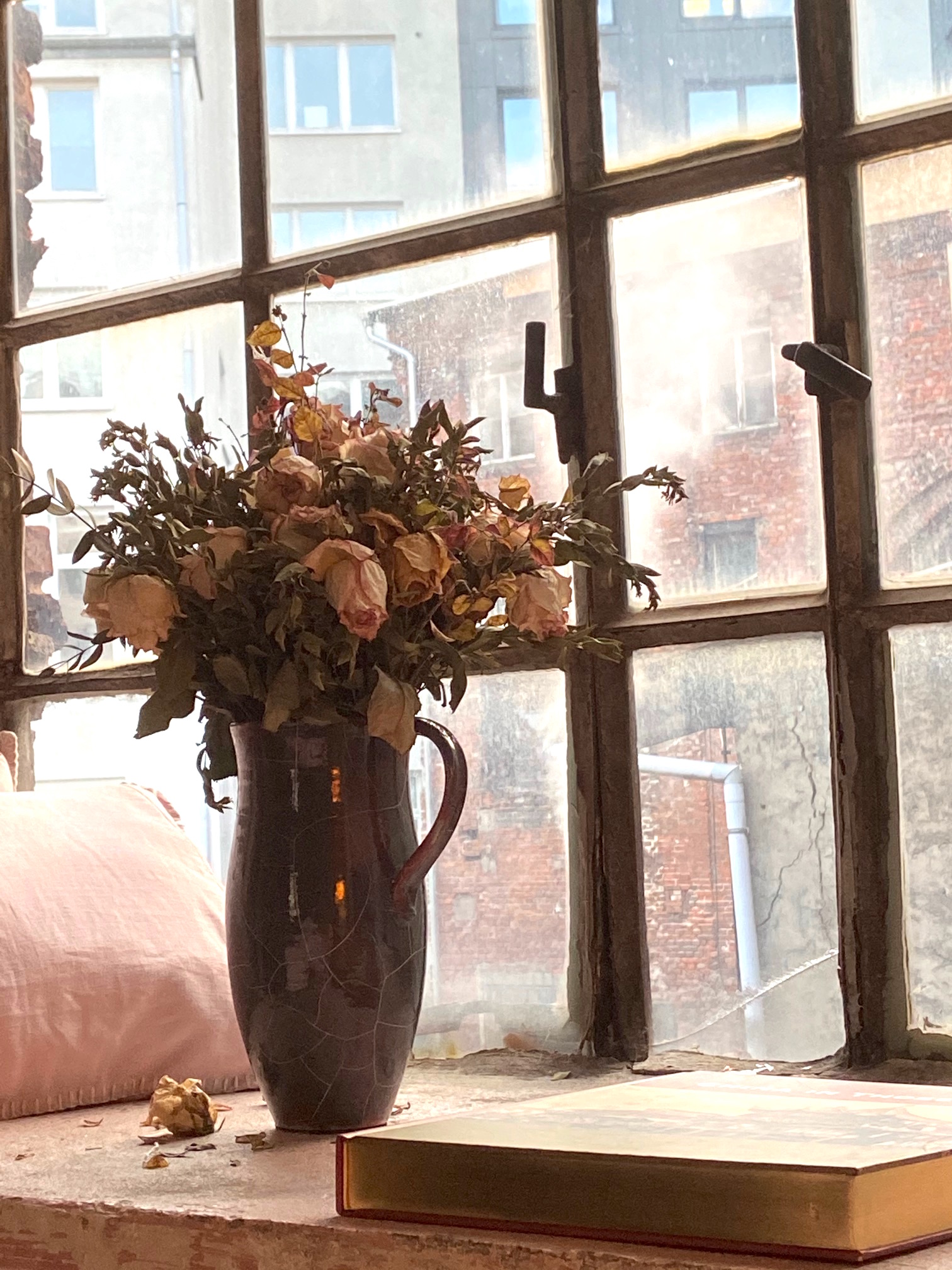 “Sieht aus, als sei der Tempel jetzt in Jerusalem. Als sei der dorthin gebeamt”, schrieb das Cousinchen auf meine SMS. Ein Nachtgruß. Heute morgen schaue ich aus dem Fenster, viel kann man nicht sehen, der Blumenstrauß von der Einweihung im vergangenen Oktober steht noch poetisch getrocknet dort, ein Buch, der Rauch vom Schornstein der Autowerkstatt.