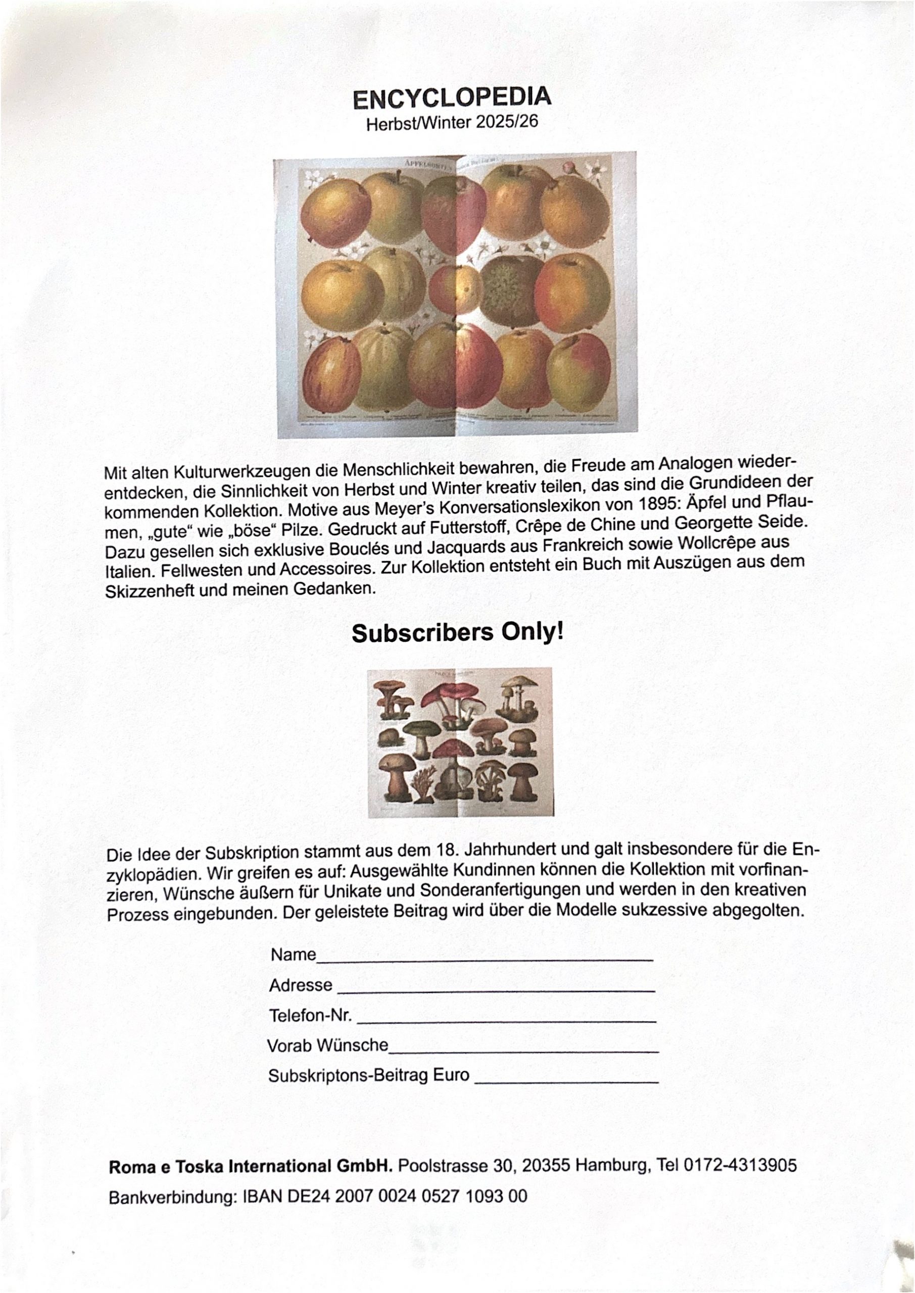 Die Kollektion “Encyclopedia” beginnt mit den Buchstaben A (Äpfel, Arctic Fauna) und P (Pilze) und umfasst damit die Themen von Flora, Fauna, Funga. Für mehr Informationen schreibt mir oder ruft mich an (0172-4313905).