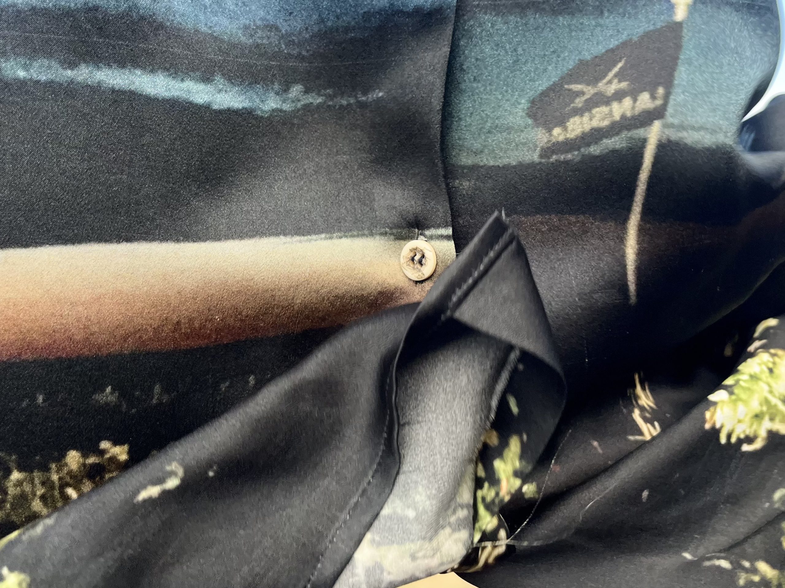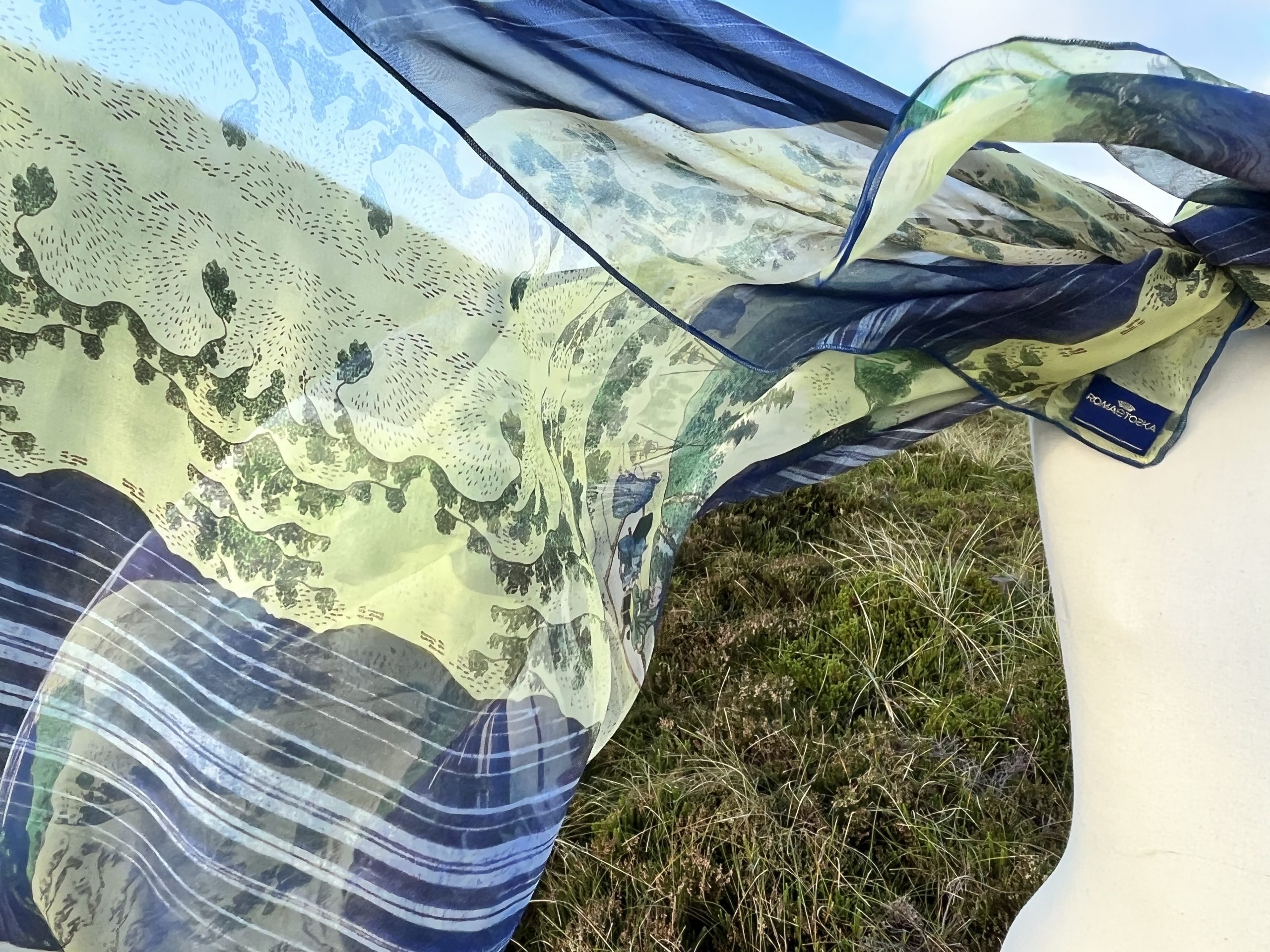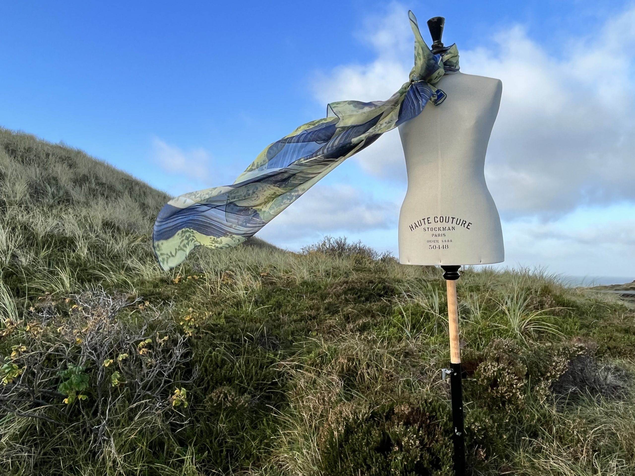 Oben, gleich hinter der Uwe Düne, finde ich halbwegs ruhiges Plätzchen, um die Puppe erneut aufzustellen. Ein Windhauch entfaltet das Seidenchiffon Tuch aus der “East-Meets-West” Kollektion mit dem Wasserfall des japanischen Künstlers Hokusai.