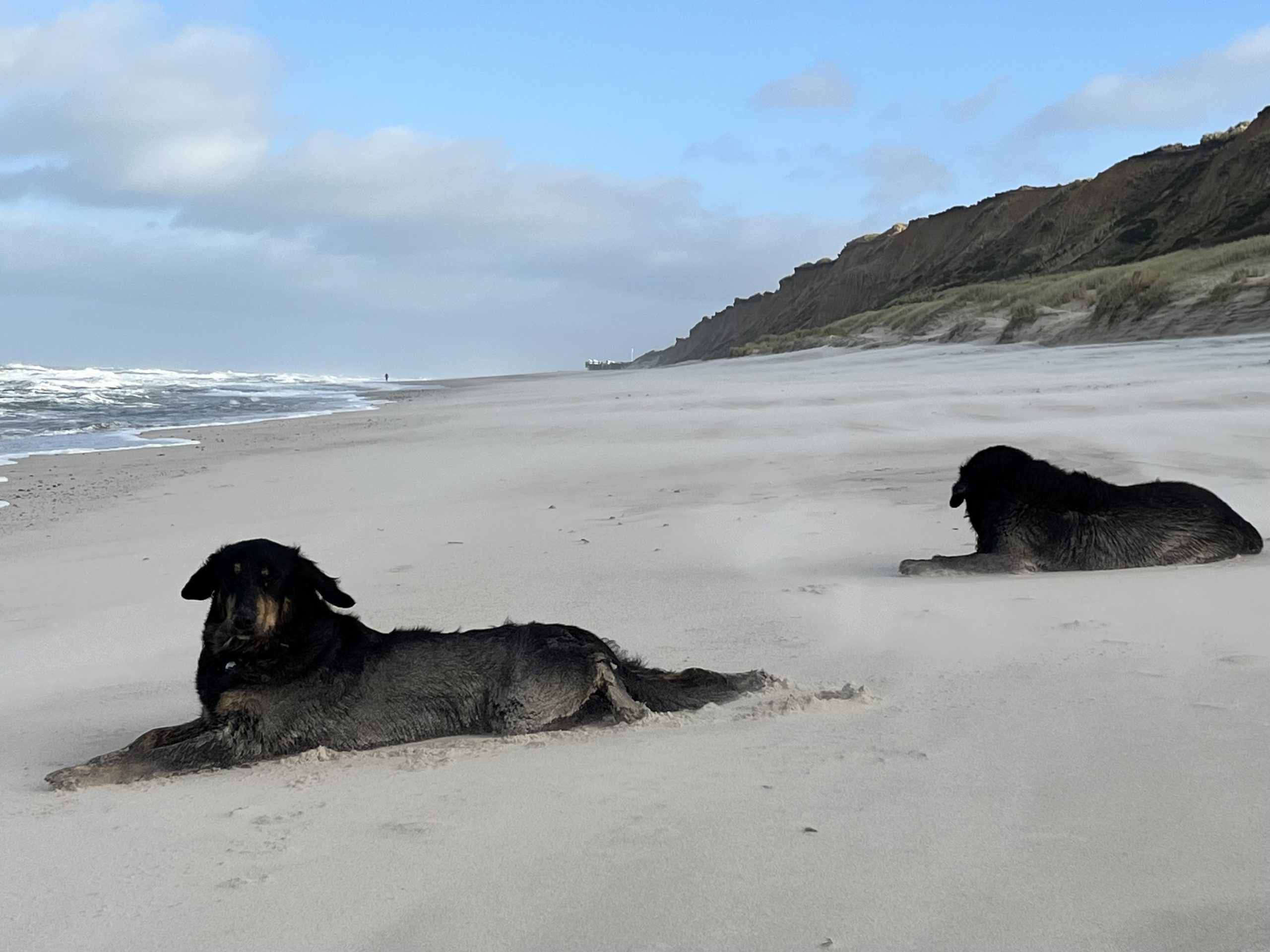 Die Hunde sind schon ganz eingesandet, und auch ich fühle überall den Sand auf der Haut und in den Haaren. Kalt ist es nicht, und so genieße ich das Herumgepuzzele und jede neue Inszenierung mit den Objekten.