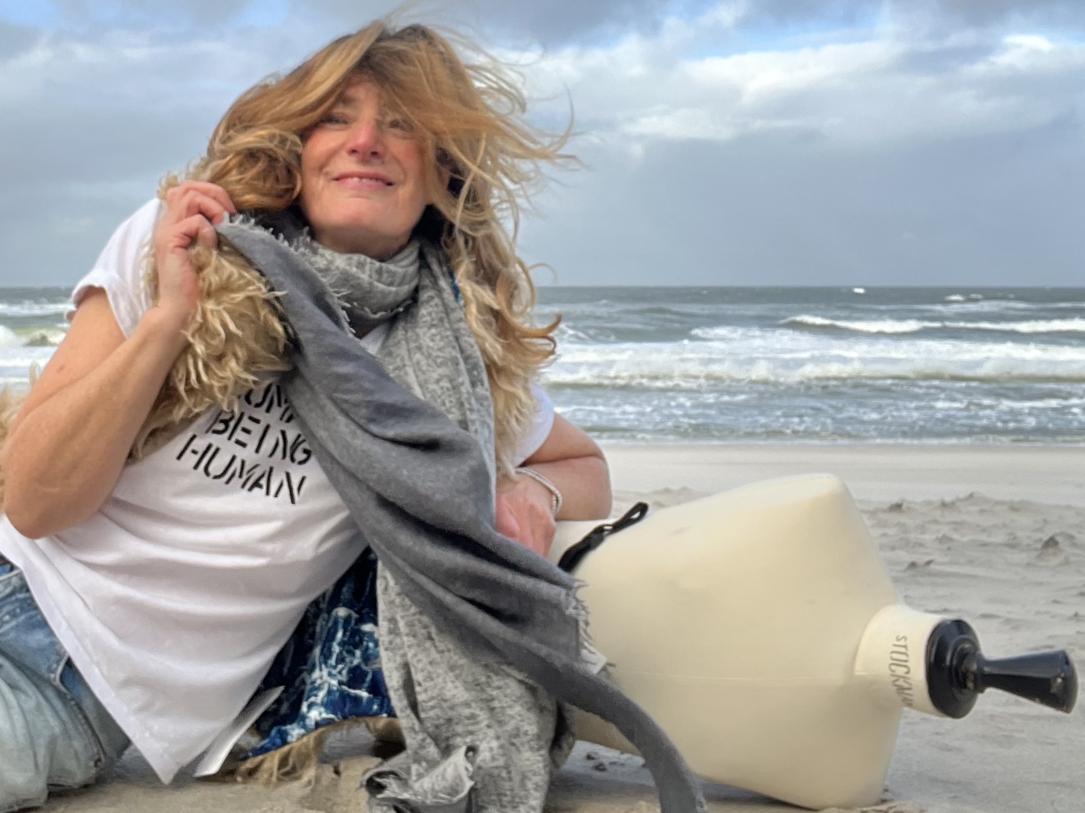Im Strandgras verankere ich notdürftig die Puppe mit der Seidensatin Bluse aus der Sansibar-Edition. Es war ein kleine exklusive Produktion für Herbert Seckler und sein Restaurant. Das Foto dafür habe ich gemacht im Sonnenuntergang. Der Prototyp ist geblieben und kann jetzt gekauft werden.