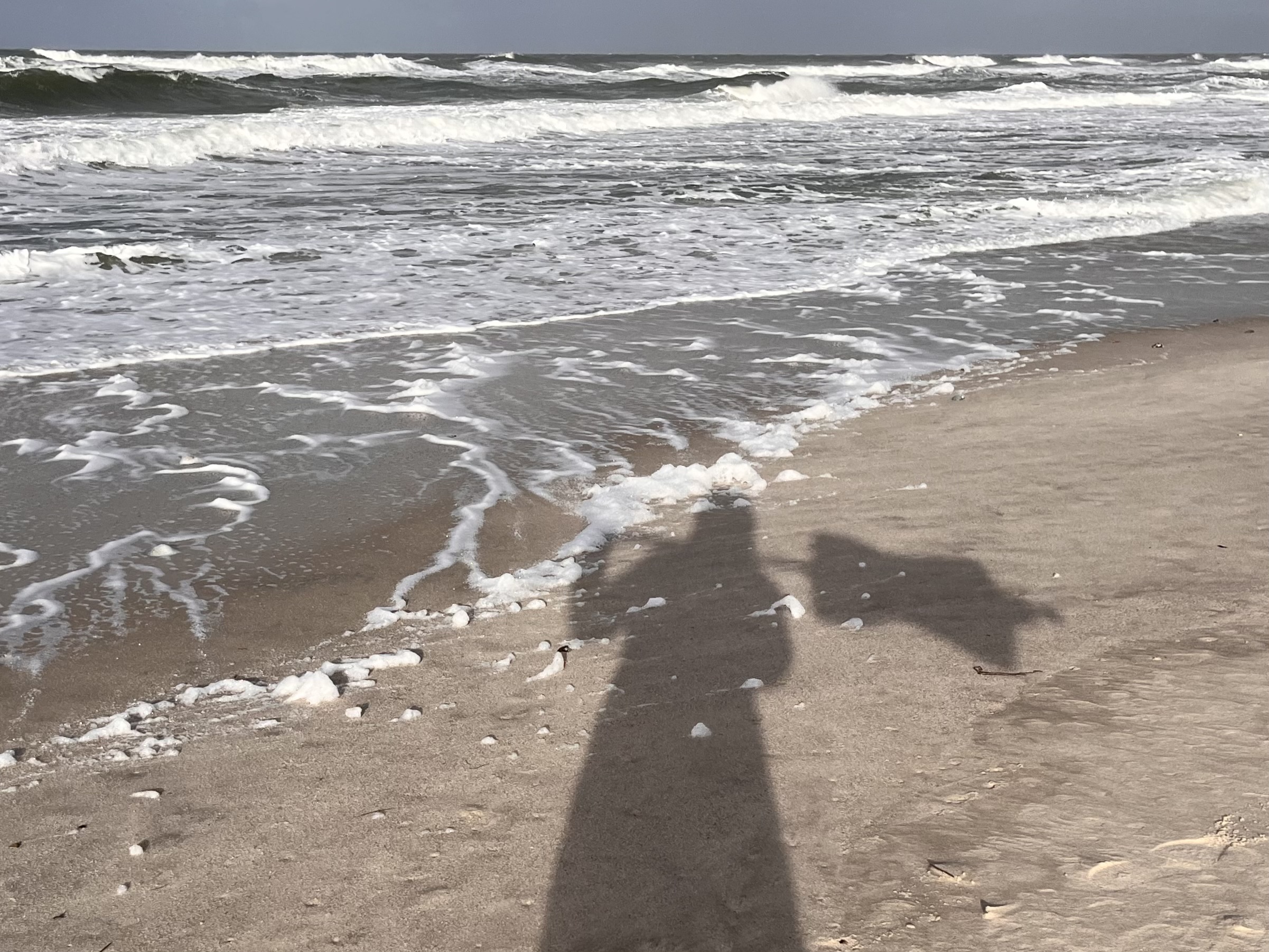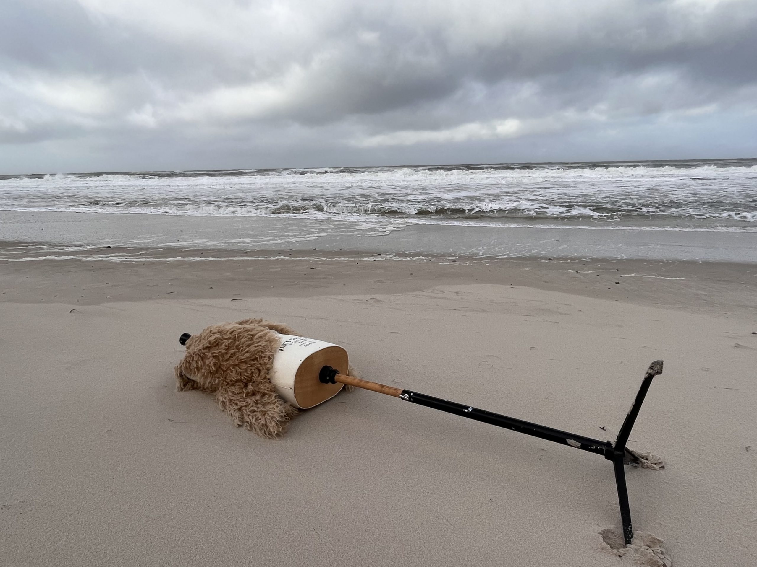 Anschließend geht es runter zum Meer. Hui, weht hier der Wind. Unmöglich, die Puppe zum Stehen zu bringen. Düstere Wolken mischen sich mit ein paar optimistischen Sonnenstrahlen.