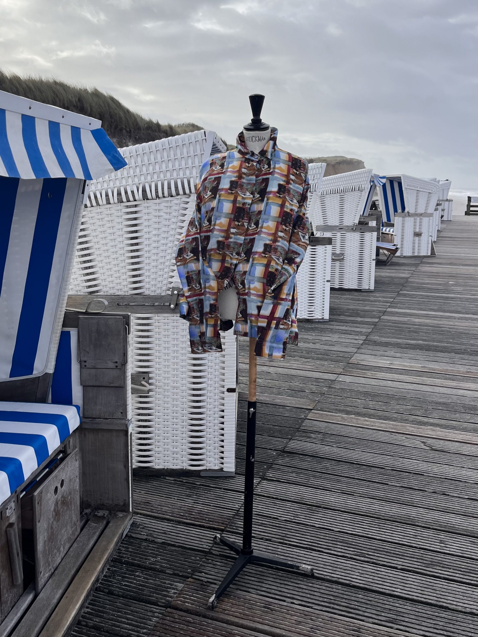 Und so ziehe ich los heute morgen und erweitere meine Boutique für ein Outdoor-Happing. Über der Schulter die Couture Puppe von Stockman aus Paris, die einst für den legendären Christian Dior entwickelt wurde. Nun muss sie dem steifen Nordsee-Wind trotzen.