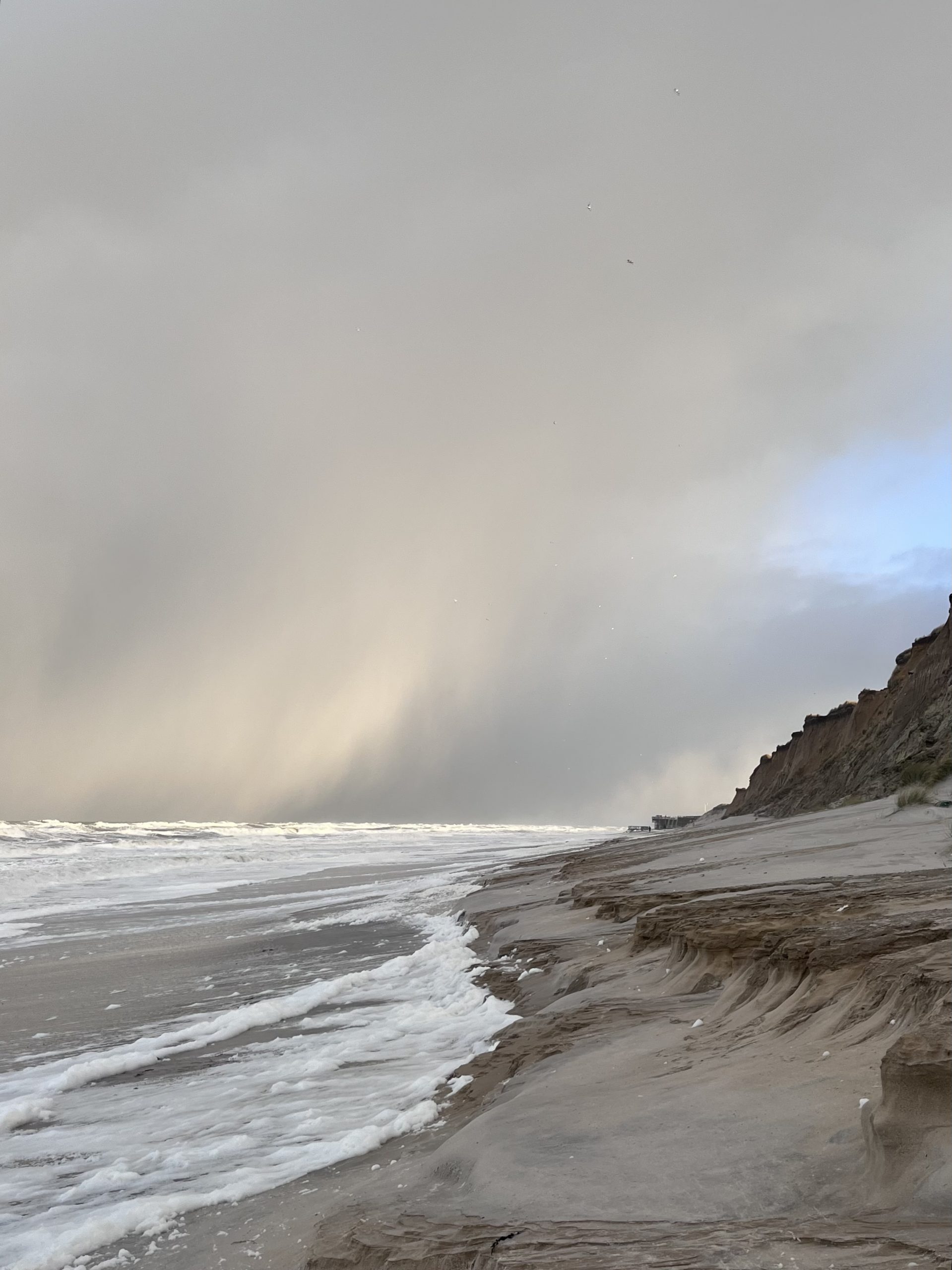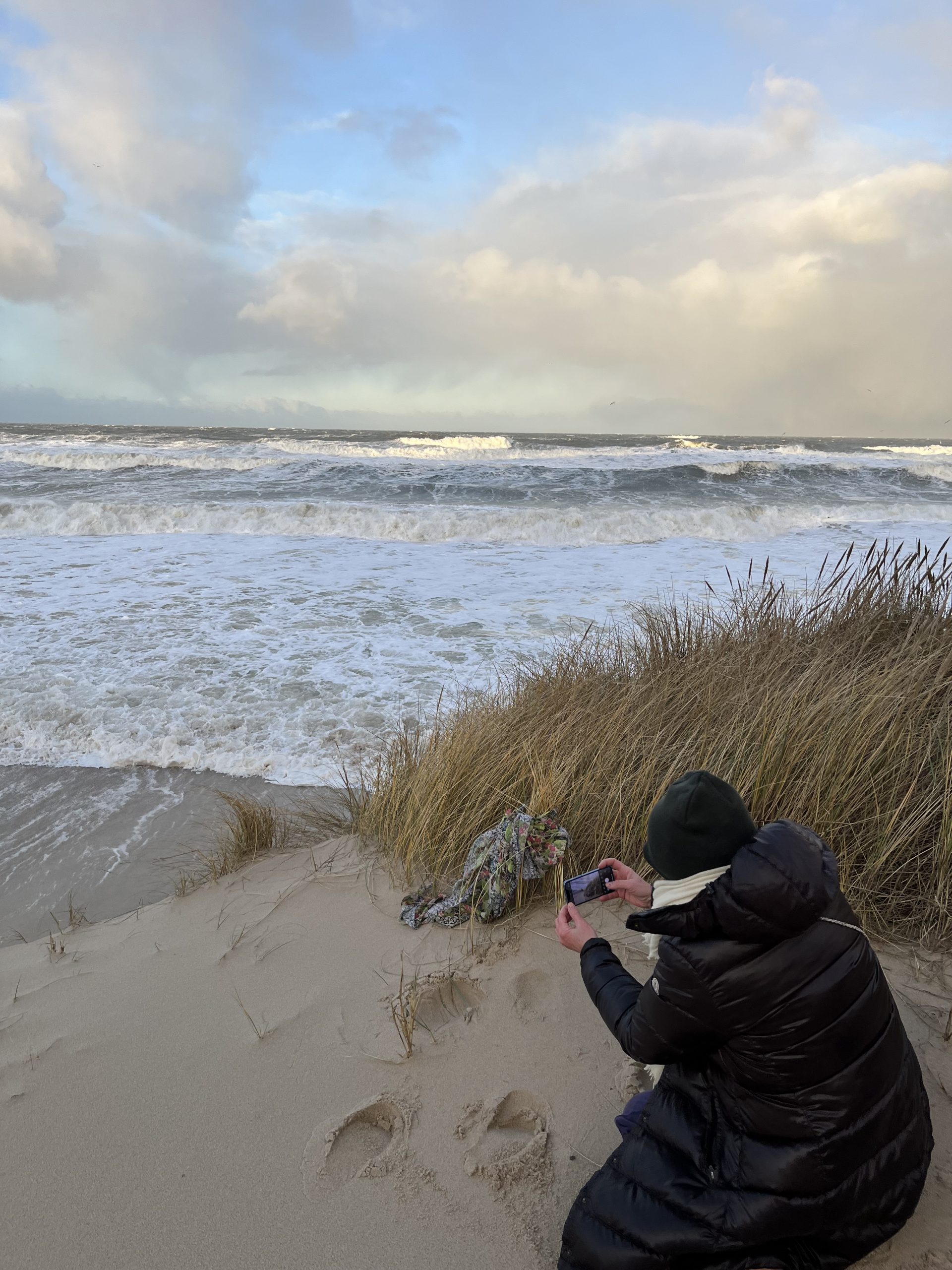 Orkan fegt über die Insel. Die Wellen schlagen so hoch, dass vom Strand kaum etwas übrig bleibt. Keine Menschenseele weit und breit. Nur genug Meer und Wind, um ganz und gar mit sich beschäftigt zu sein. Mühselig klettere ich immer wieder rauf zum Kliff, durch das kniehohe Schilfgras, um nicht in das gurgelnde Wasser unter mir abzuglitschen. Wie ich das liebe, meine Sylter aufgewühlte Gegenwart. Zufall, nicht geplant, als ich vor Jahren auf die Insel kam.