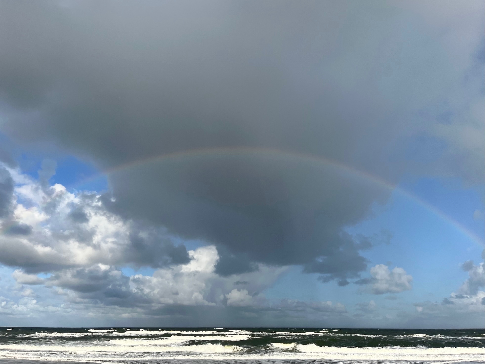 Ungeduldig warten wir in Hamburg auf den Stoff aus Oberitalien. Aus den ersten Andrucken der XXL Miesmuscheln, die Alexander von Humboldt (1759 – 1859) seinerzeit zeichnete, hat Melle, die Atelier-Chefin, eine erste Prototyp-Bluse genäht. Und ich habe nichts Eiligeres zu tun, als mich damit am Strand zu fotografieren. Das Wetter ist ideal: Sonne, Regen, Regenbogen und ein aufgepeitschtes Meer.