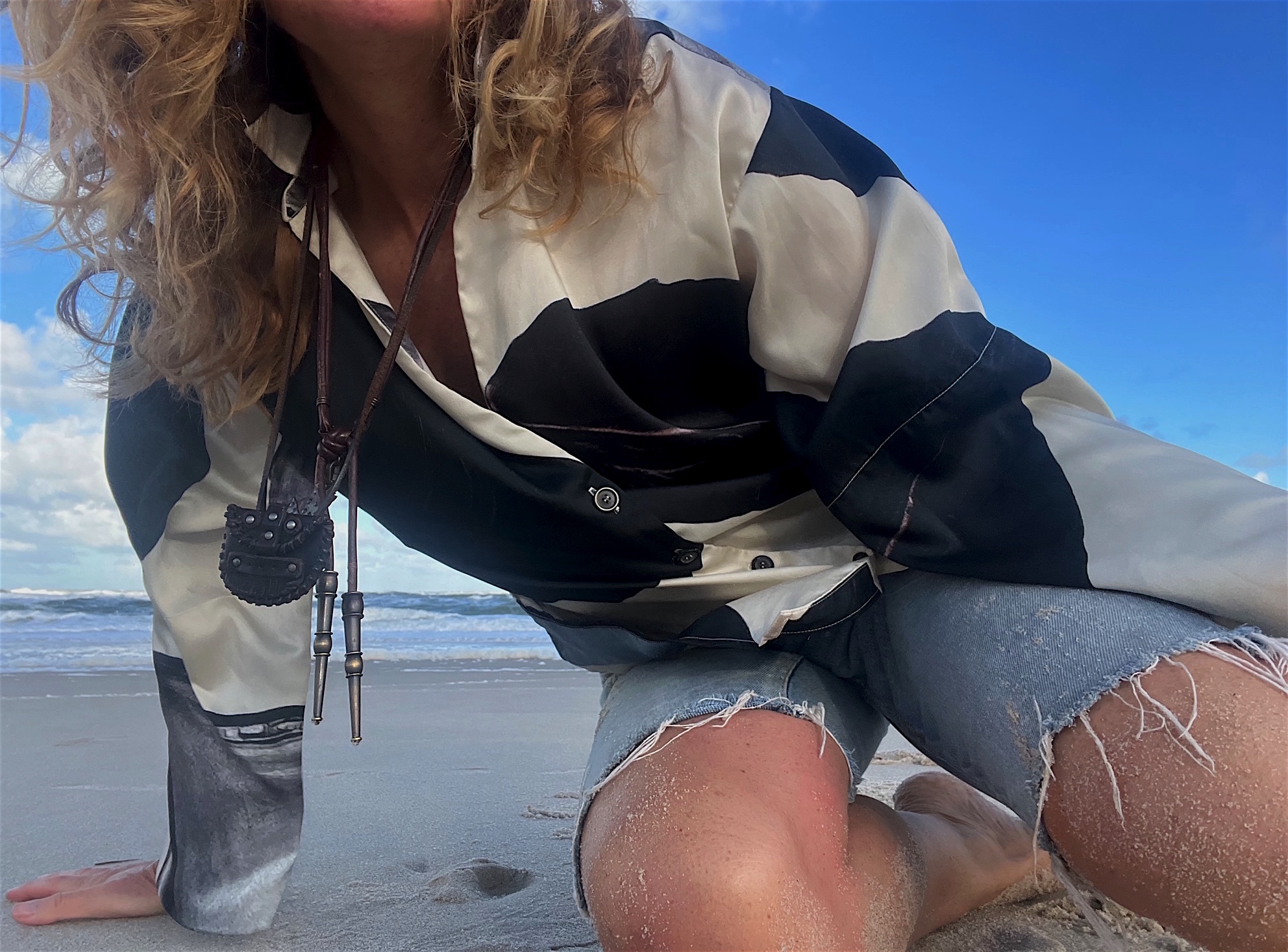 Nun brauche ich nur noch eine Muscheln, um sie in der Hand zu halten, aber der Strand ist leergefegt von der Flut. Und doch … da ist sie, die eine, die richtige unter tausenden von Muscheln, als hätte sie nur auf mich und meine Bluse gewartet.