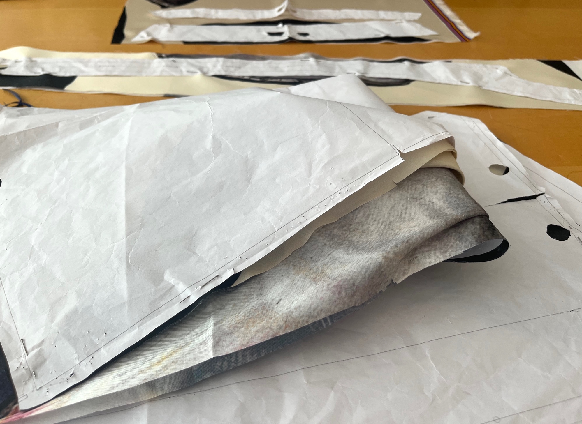 Beim Zuschnitt haben wir bewusst nicht darauf geachtet, wie sich die Formen von schwarz-grau-perlmutt über die Bluse verteilen. Somit wird jede ein wenig einzigartig sein. Vielleicht sollten wir sie numerieren, eine gute Idee.