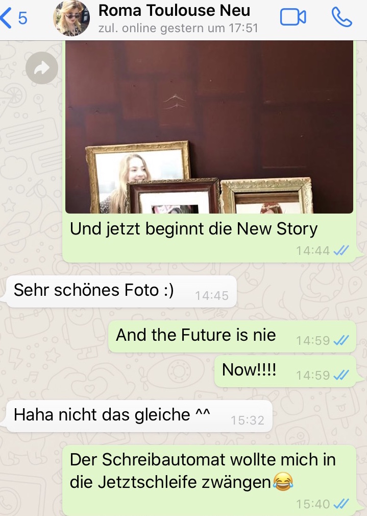 Meiner Tochter Roma schicke ich gestern das Titel-Foto mit der Unterschrift: “The Future is Now”, das Schreibprogramm machte daraus: “The Future is nie”, und wollte mich wohl unbewusst in dem Jetzt behalten. Aber da bin ich schon einen Sprung weiter. Wir, Mutter und Tochter, mussten herzlich lachen. Das Neue wartet.