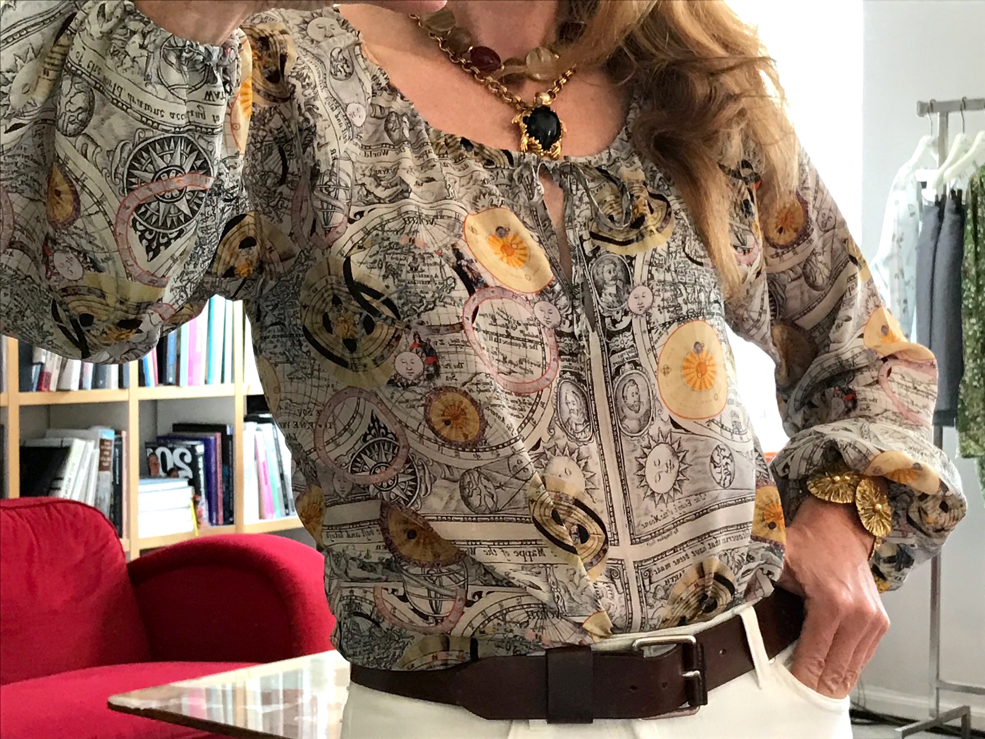 Abb: Rüschenbluse Kopernikus, Crêpe de Chine Seite (€ 398), Vintageleder Gürtel braun (€ 189), Vintage Yves Saint Laurent Schmuck
