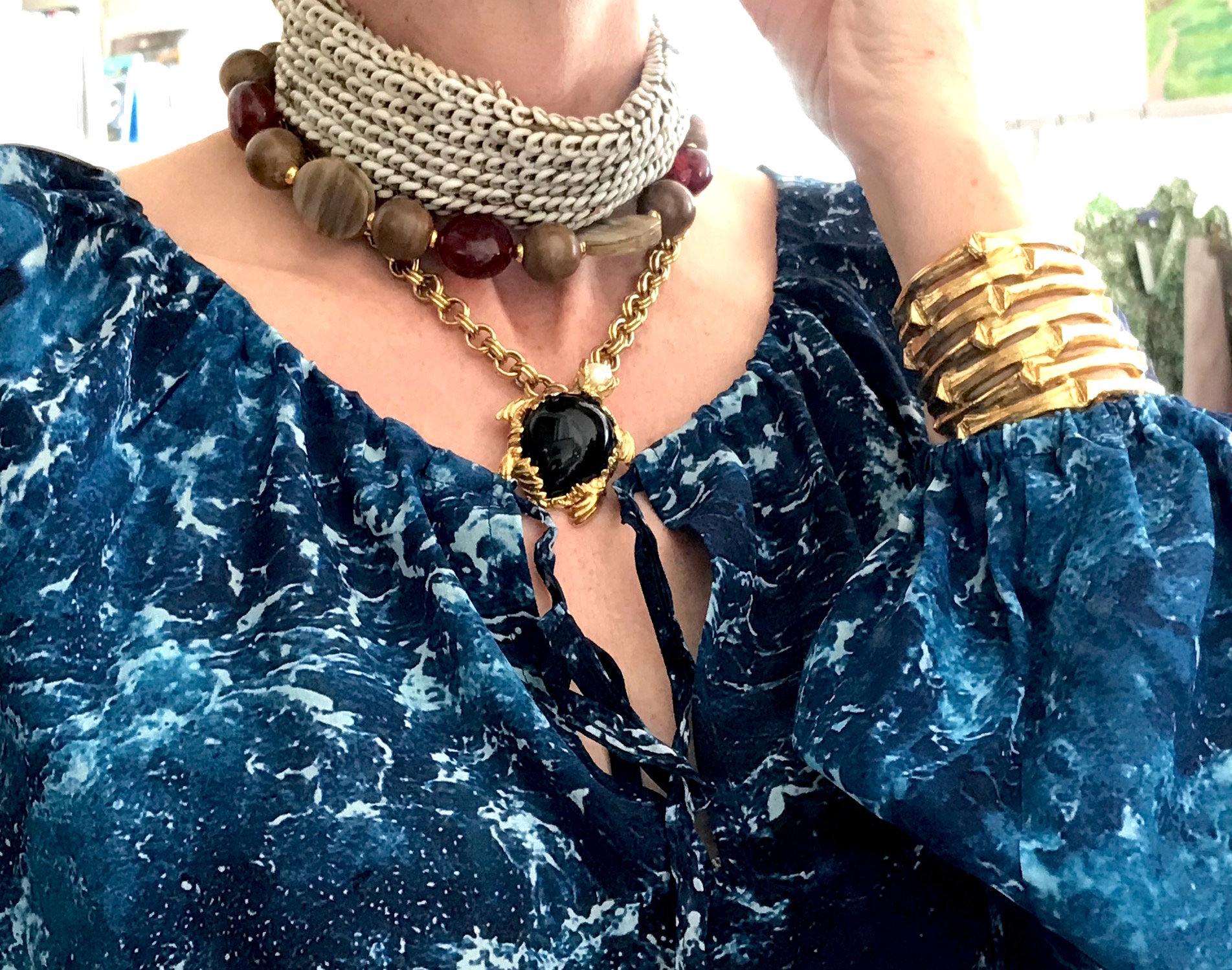 Abb: Rüschenbluse Waterscape, Crêpe de Cine Seite (€398) in den Größen S, M, L. Schmuck Yves Saint Laurent Vintage