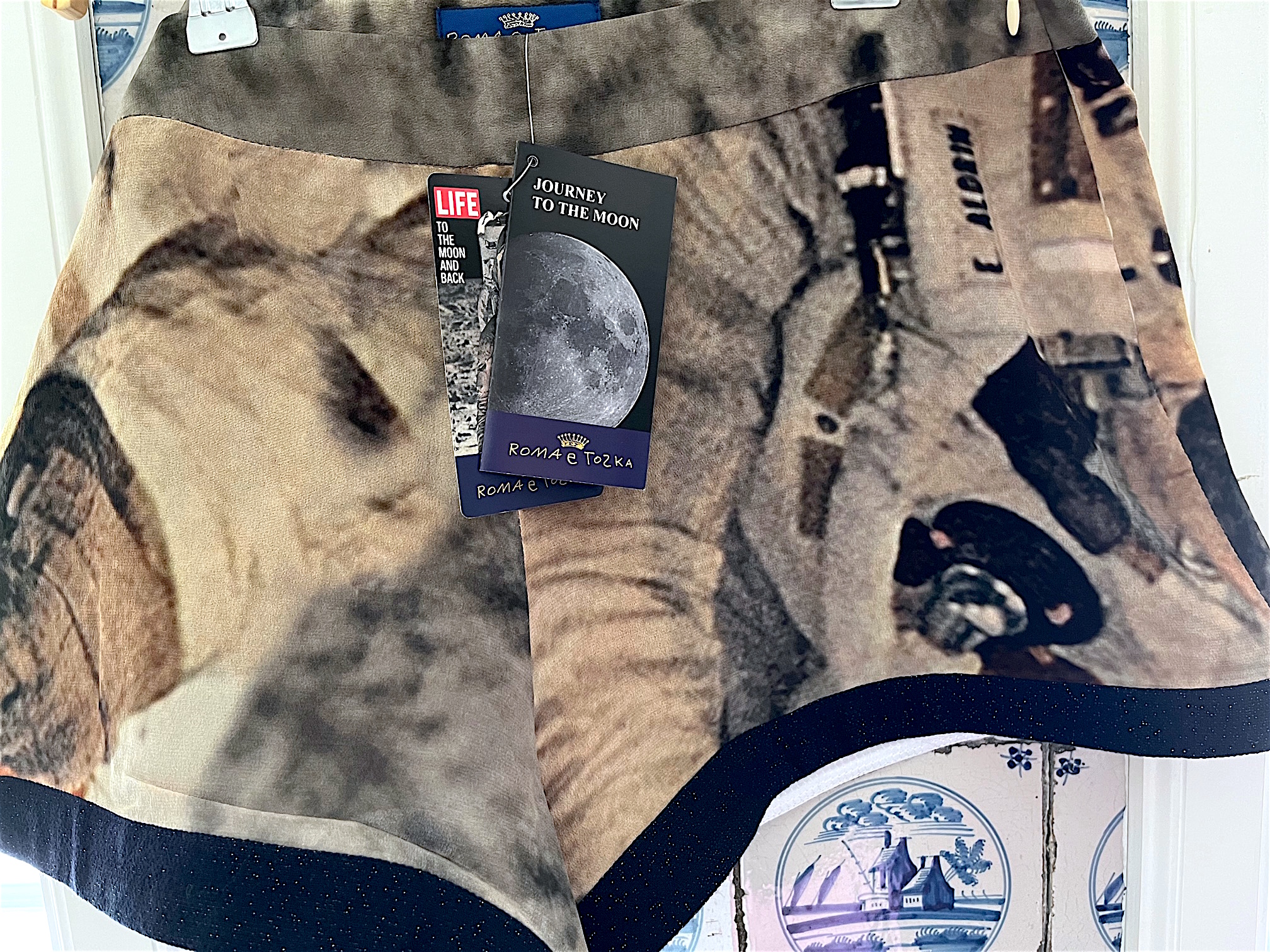 Beim Aufräumen hatte ich den Karton gefunden mit den Teilen aus der Zeit, als Roma e Toska noch eine Teenager Kollektion war. Die kurzen flattrigen Hosen sind aus robuster Seide, besitzen ein geformtes Bündchen, so dass sie gut auf der Hüfte liegen, unten teilweise mit einem Wolljacquard-Saum versehen, hinten mit einer kleinen Tasche, seitlicher Reißverschluss.