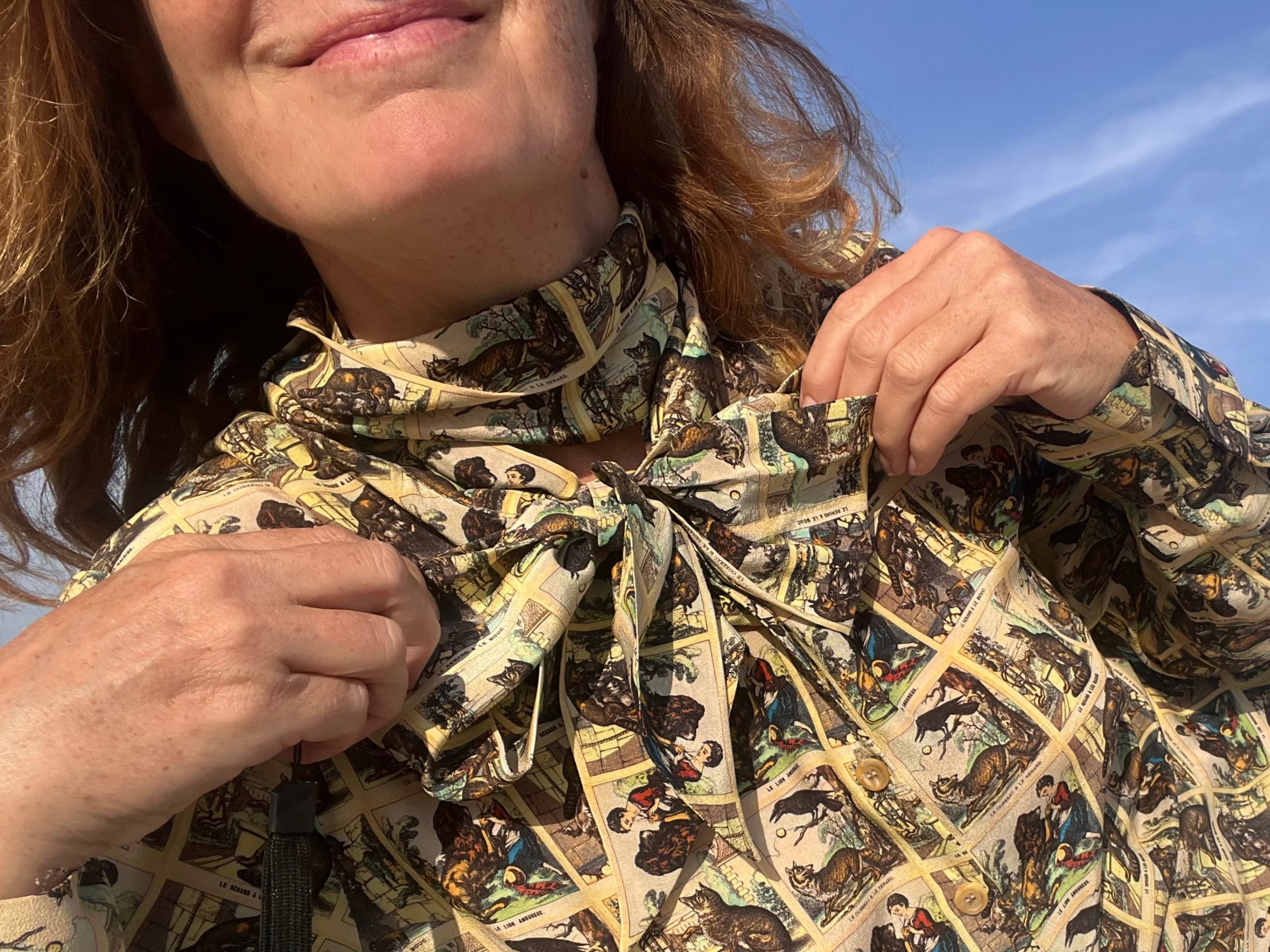 Das Childhood Motiv aus Crêpe de Chine Seide ist die Vorgabe des Materials. Aber Ihr könnt Euch Euer Lieblings-Modell aussuchen. Und wir nähen daraus die Bluse im Einzelzuschnitt, “bespoke”, wie man in London sagt, in XS, S, M oder L.