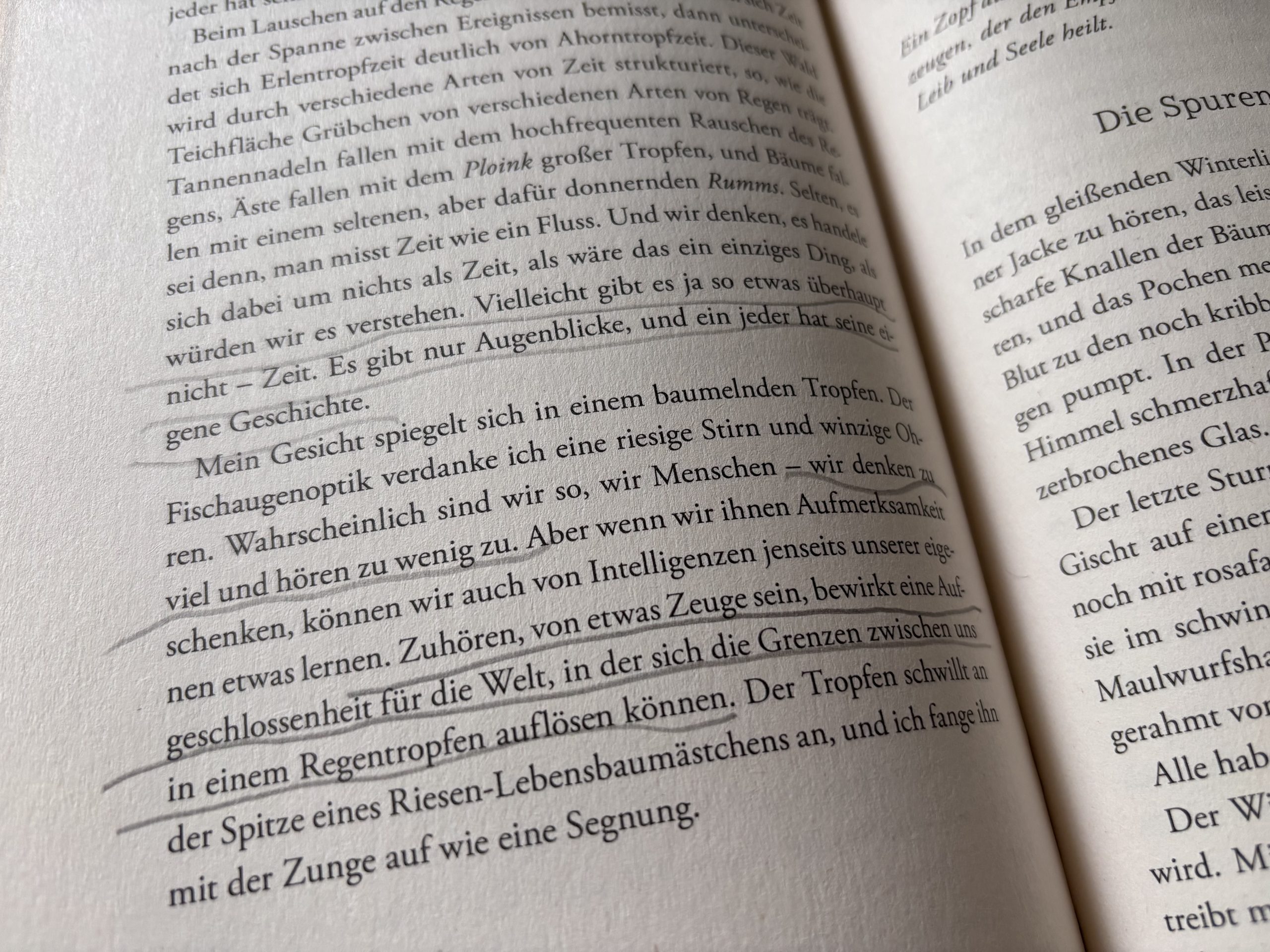 Vergessen ist alles rundherum, dass der Regen langsam durch meine Jacke dringt, dass ich doch eilen wollte. “Bin nur kurz eine Runde und gleich zurück”, höre ich mich sagen. Und dann vergesse ich die Zeit. “Vielleicht gibt es ja so etwas überhaupt nicht – Zeit.” Schreibt Robin Wall Kimmerer in ihrem Buch Geflochtenes Süßgras. “Es gibt nur Augenblicke, und ein jeder hat seine eigene Geschichte.”
