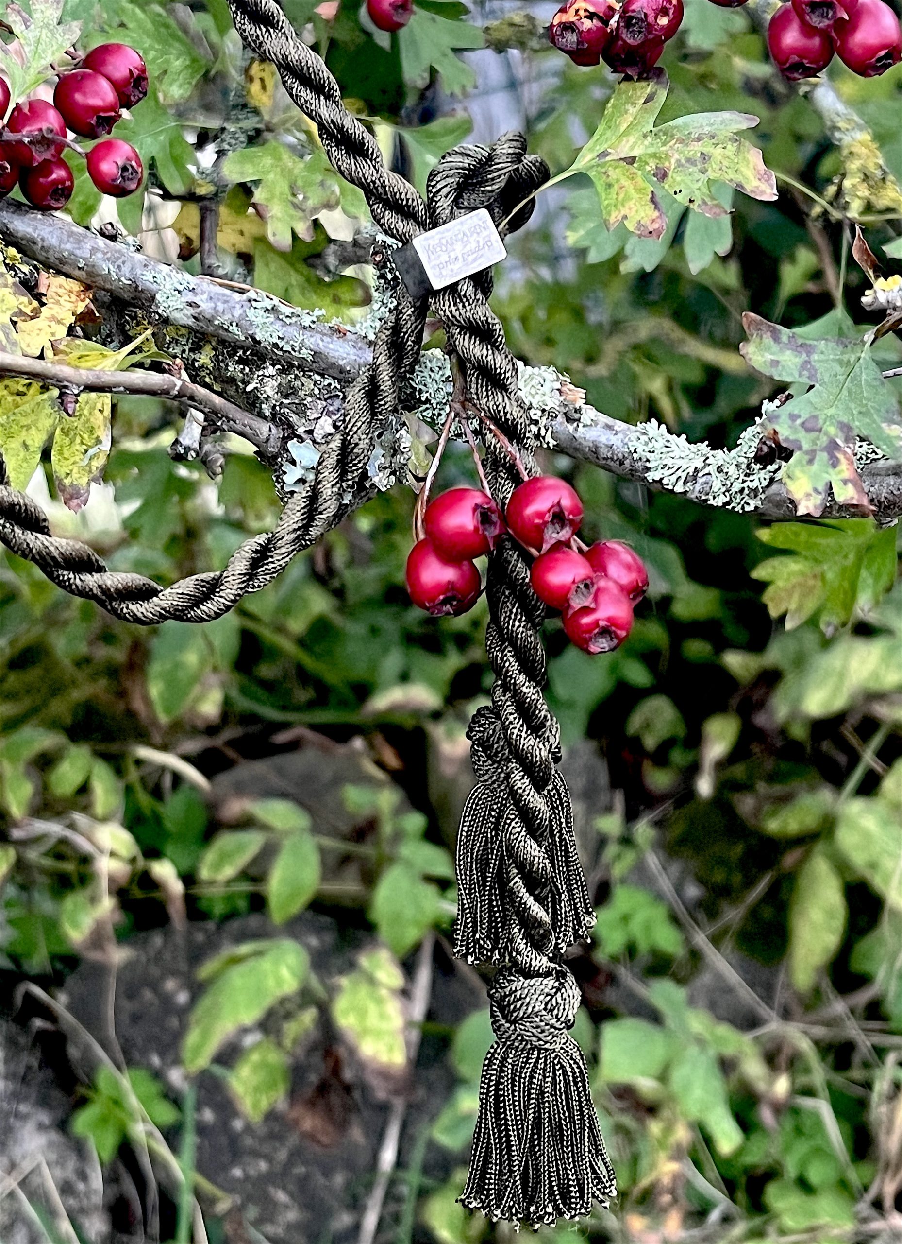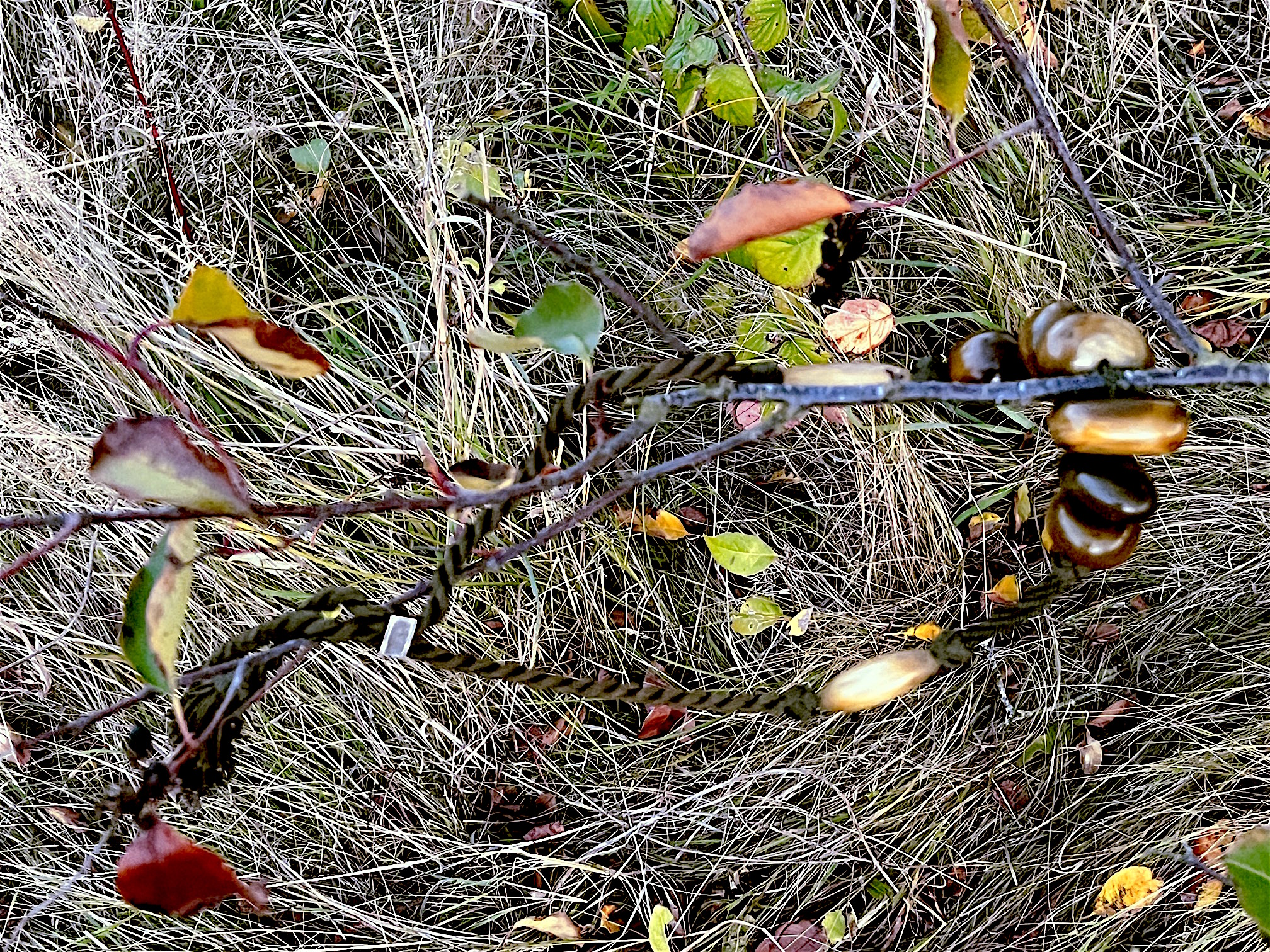 Es könnte hier in diesem Gestrüpp ein Einhorn leben oder eine gute Hexe, eine Fee. Lautlos ziehe ich die nächste Kette aus meiner Tasche, die andere hängt schon um meinem Hals. Psst! Selbst die Vögel halten den Atem an, ich höre nichts, beuge mich vor, um das Schmuckstück auf den moosbewachsenen Ast zu legen. Wieder darf nichts die Unversehrheit der Büsche zerstören. (Muss an Gehard Richters Buch “Wald” denken.)