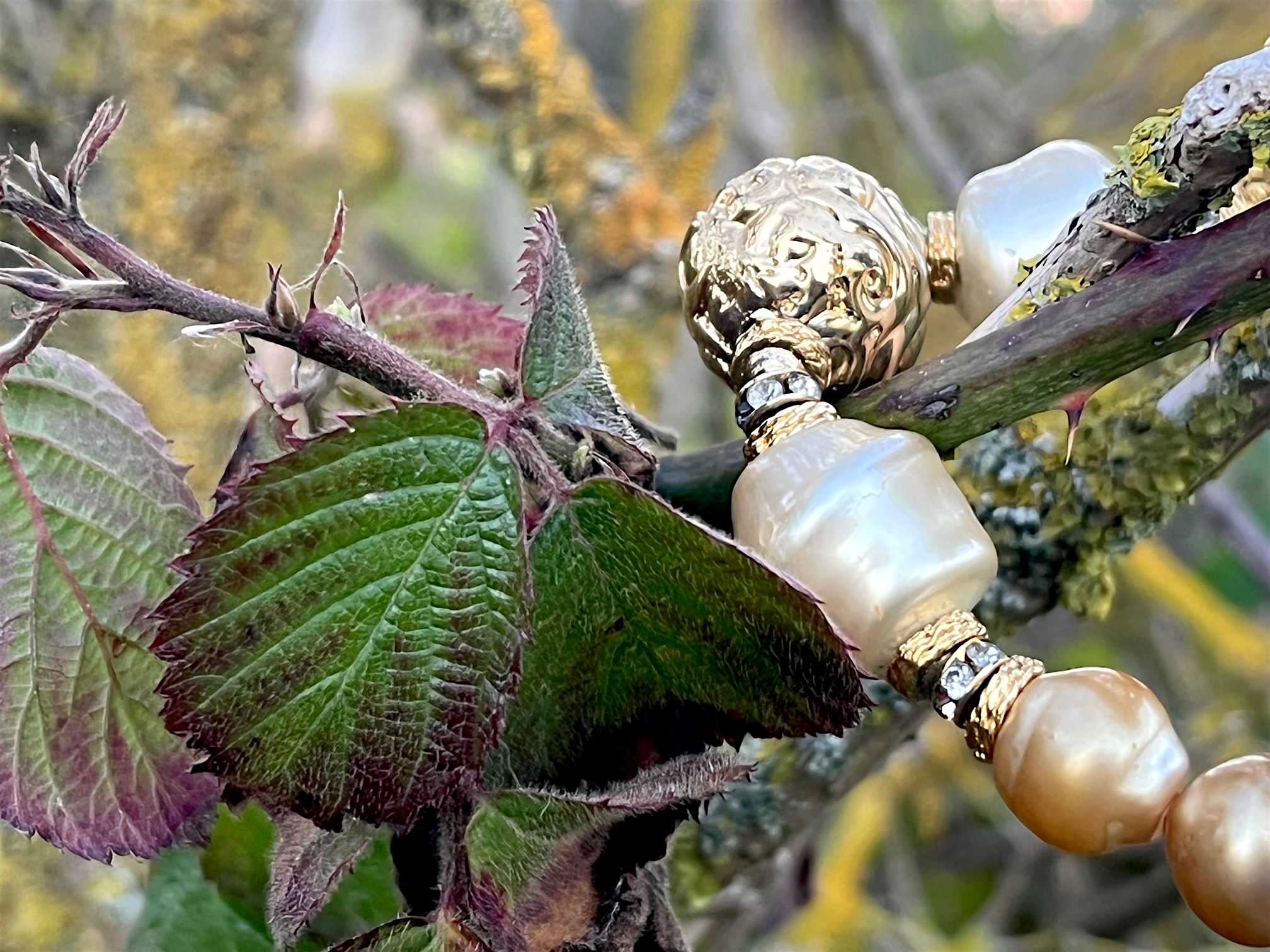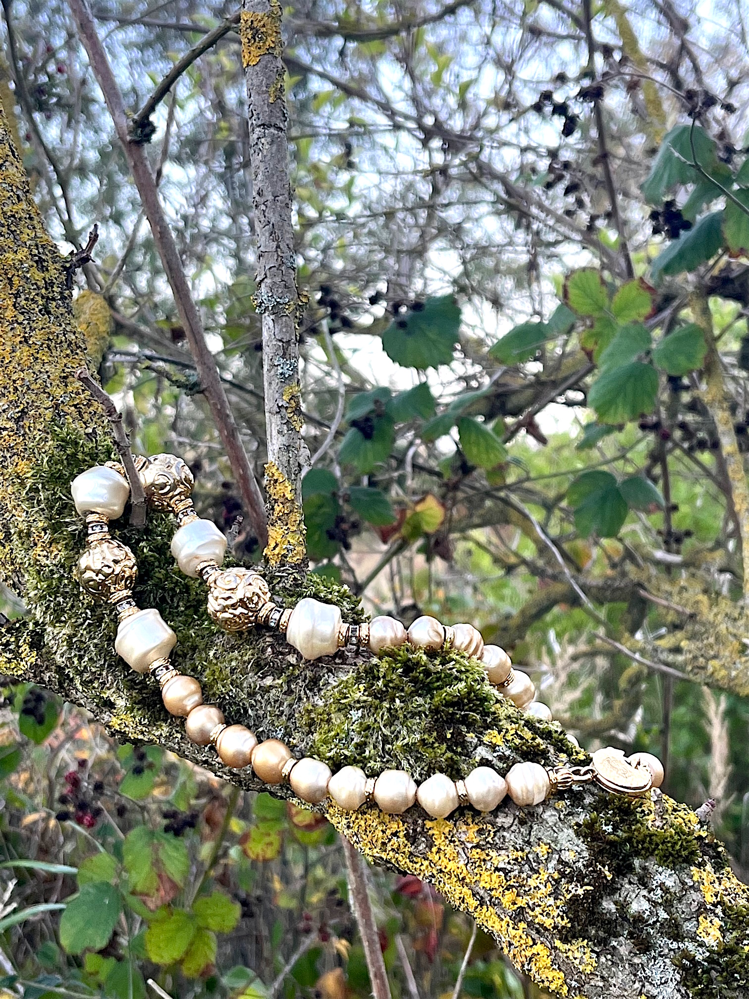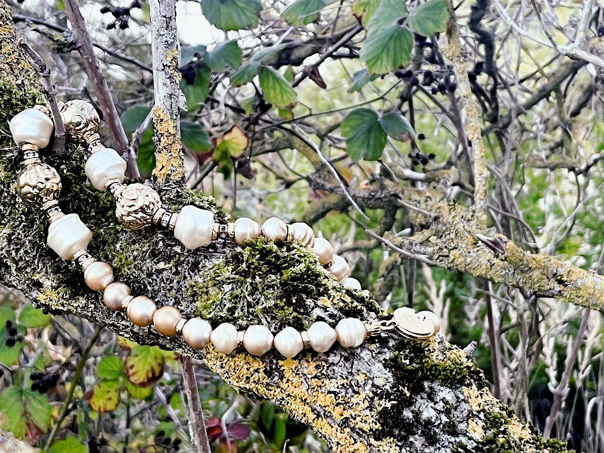Die Perlen liegen da, als hätte eine Prinzessin sie abgestreift, um ein Bad zu nehmen, und hat sie dort vergessen. Ob die Frauen auf Manets Gemälde “Le Déjeuner sur l’Herbe” auch Schmuck trugen? Ich versuche mir die Szenerie aus meiner Erinnerung zu gegenwärtigen.