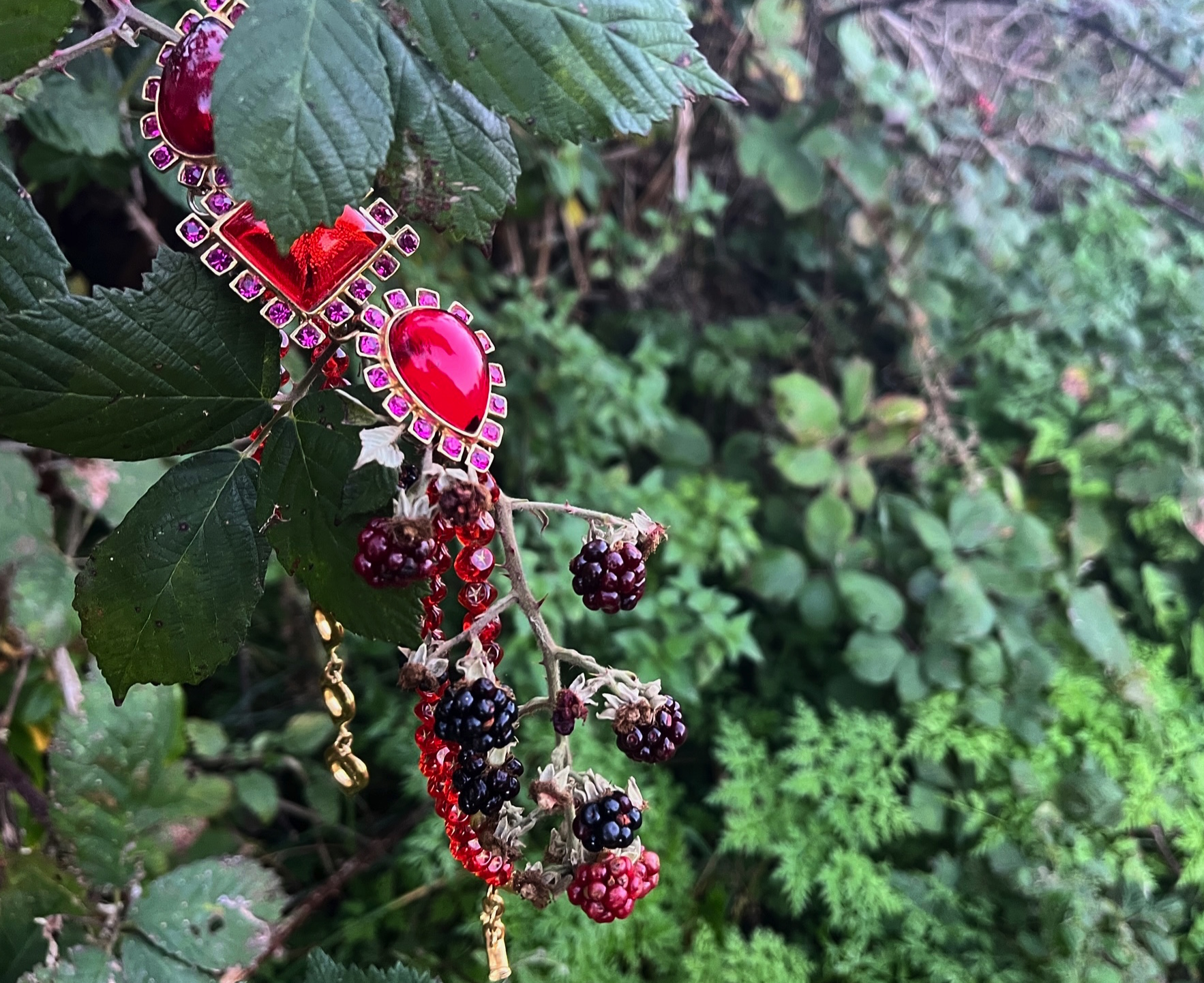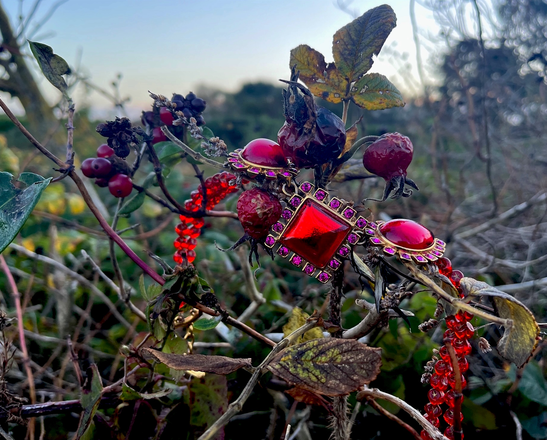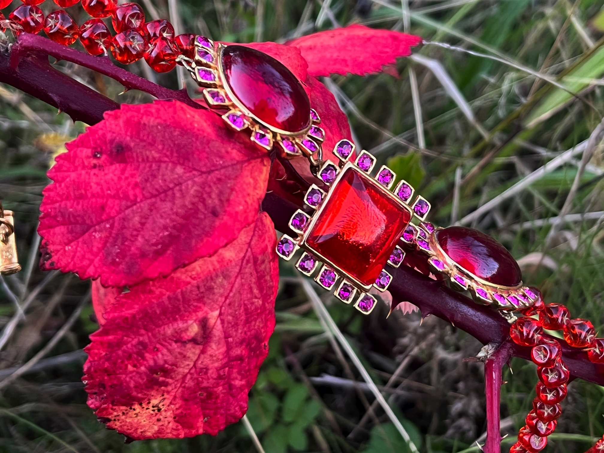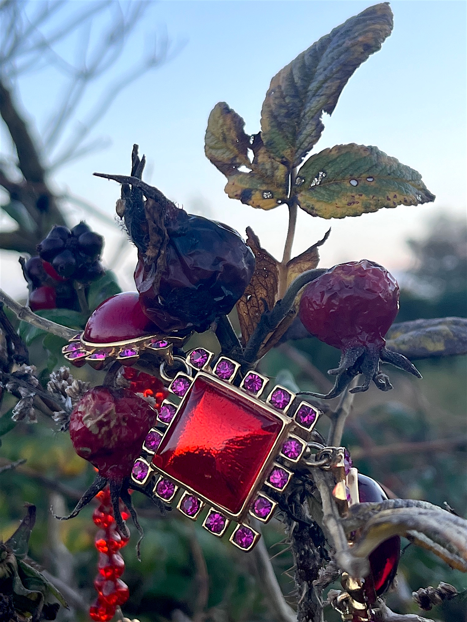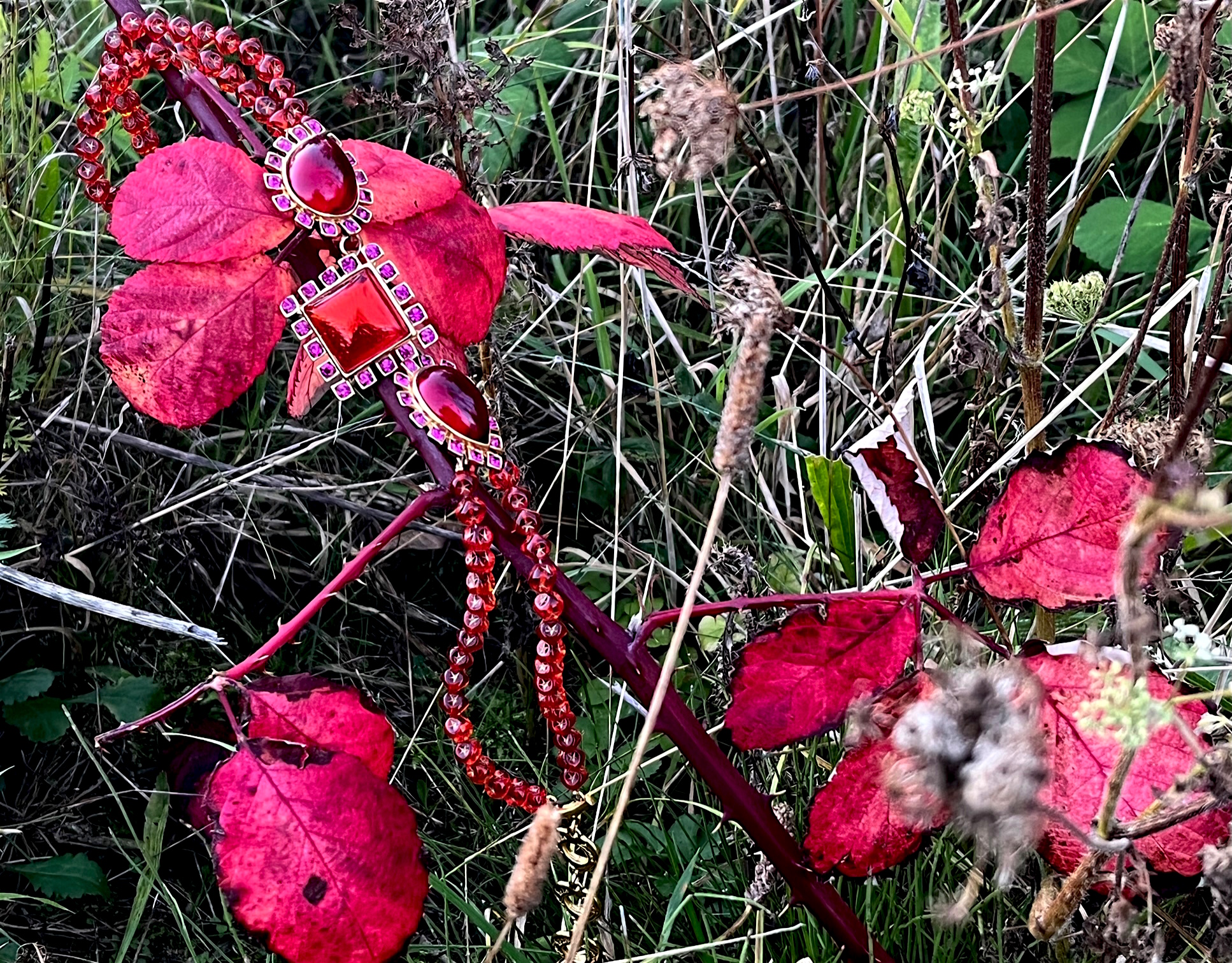 Es ist nicht das Kriegsrot, das Kanonengetöne ist weit weg, heraus aus meinen Gedanken. Nein, es ist das Rot der Rubine, der Früchte und Beeren des Waldes in der anderen Welt, in der es keinen Hunger gibt, keine Not, in der Rot gleich Leben ist, in der man die Bijoux Fantasie trägt ohne Neid und Mißgunst …