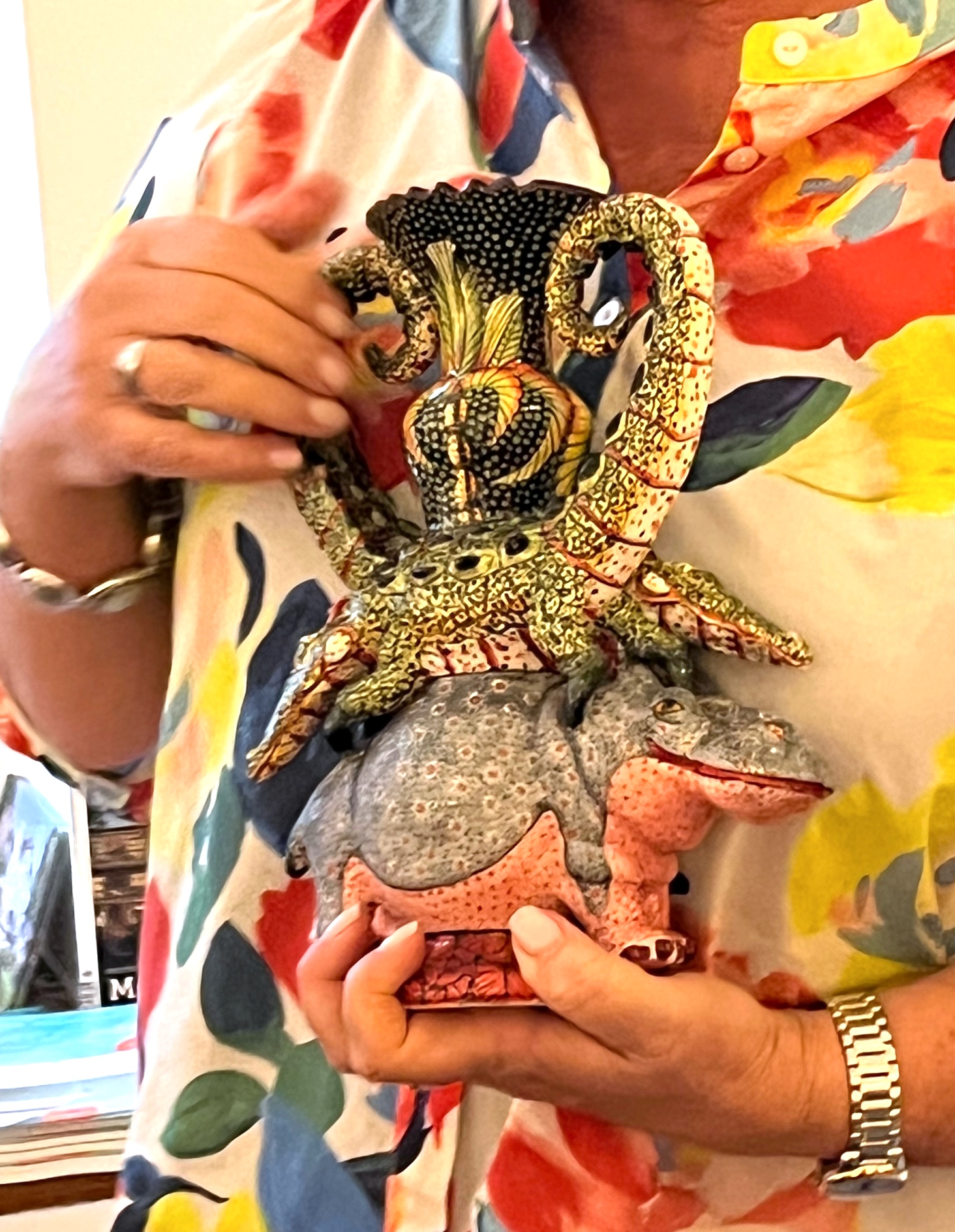 In dem Moment möchte ich Sammlerin werden von diesen Stoffen, diesen Kissen, dieser Keramik, die diesen Geist mit sich tragen. Liebevoll presst Linda die Vase mit dem Nilpferd und den sich verschlingenden Aligatoren an sich. Dieser Künstler liefert mit seinen Objekten immer wieder die Vorlagen für die textilen Dessins.