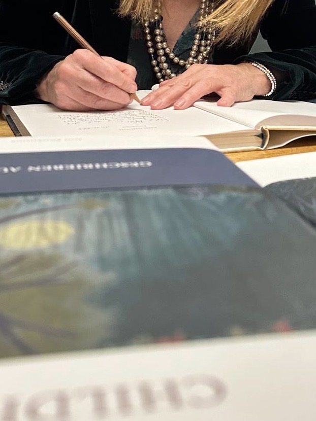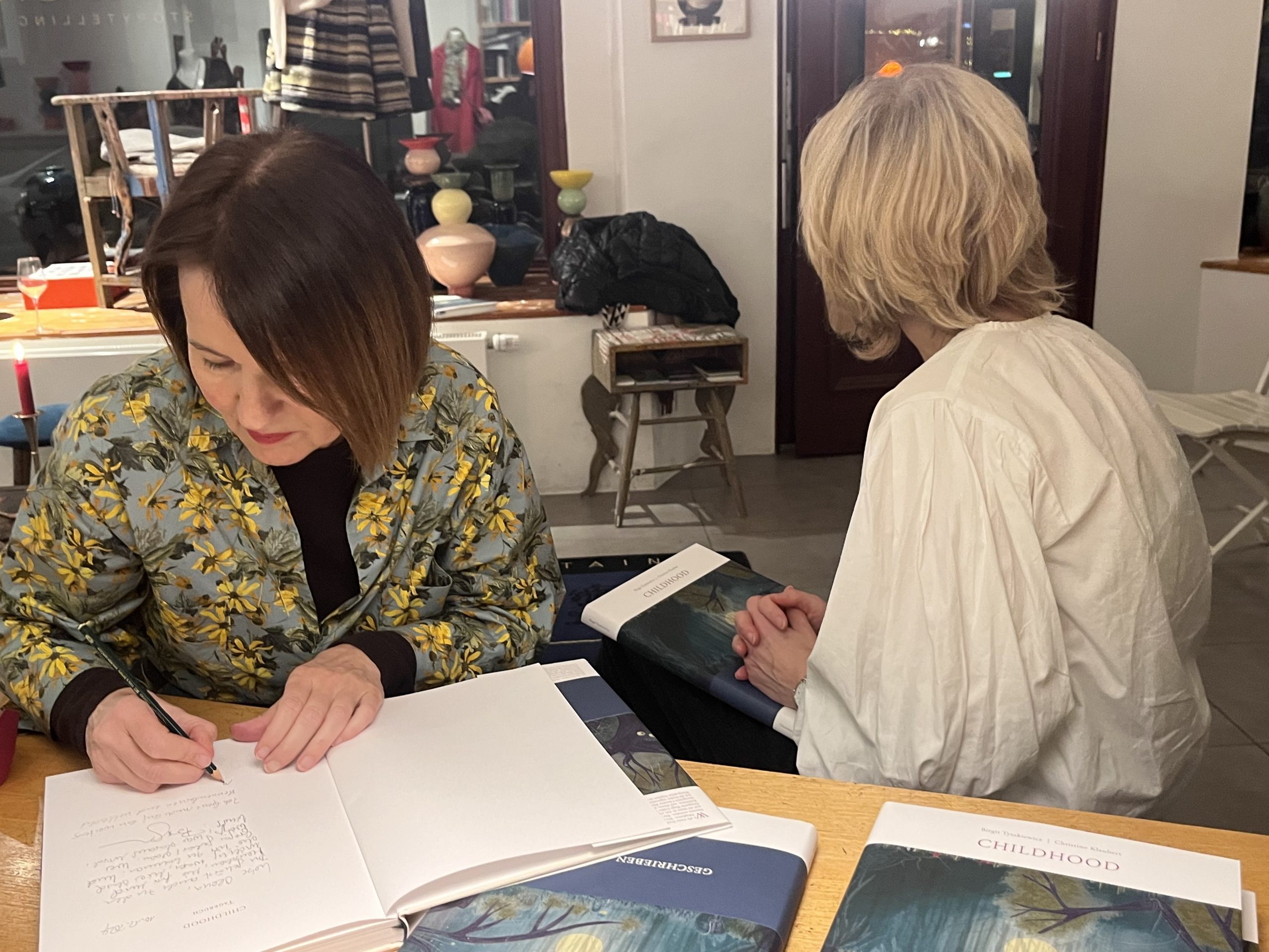 Danach stießen wir an, signierten die Bücher, die normalen Ausgaben, die Sondereditionen. Für jeden ein paar Sätze, das passende Geleit. Dabei will man noch gut aussehen, lächeln und am besten auf Fragen antworten. Hilfe, so etwas muss erst einmal geübt werden. Schon schreibe ich mit Bleistift “Marion” statt “Monika”.