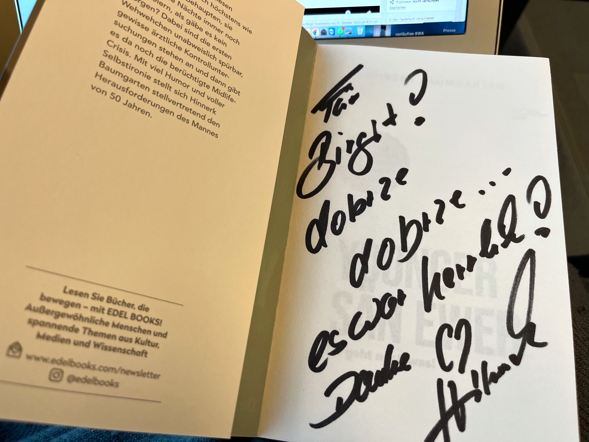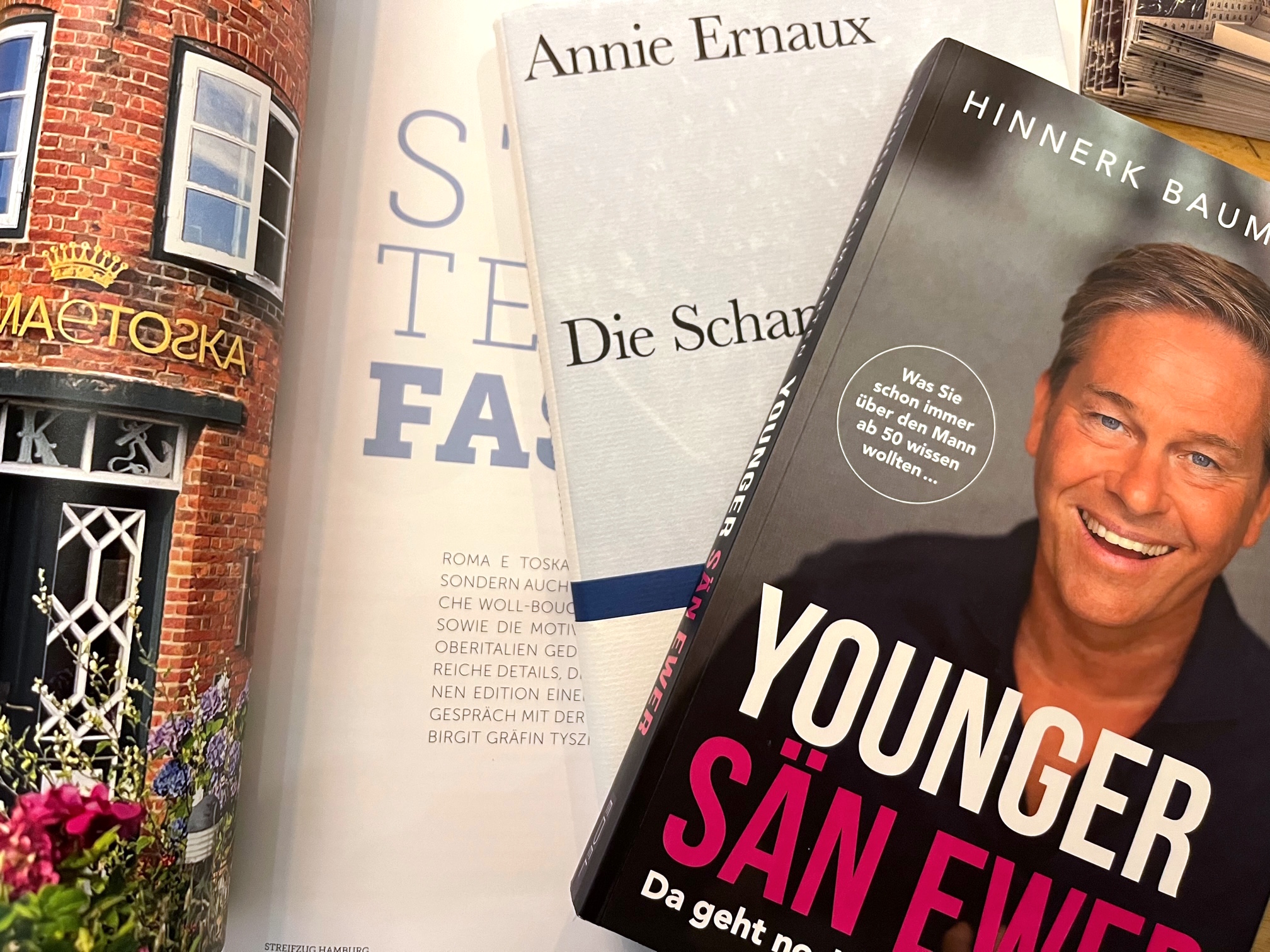 Ein paar Überschriften habe ich ausprobiert, während ich Herbert Grönemeyers Lied “Männer” von 1984 lausche. Ich sitze im Zug, auf der Sitzbank gegenüber liegt die signierte Ausgabe von “Younger sän ewer. Da geht noch was!” (2022) Und wer das nicht gleich versteht, dem hilft der dazugehörige Textbutton: “Was Sie schon immer über den Mann ab 50 wissen wollten …”