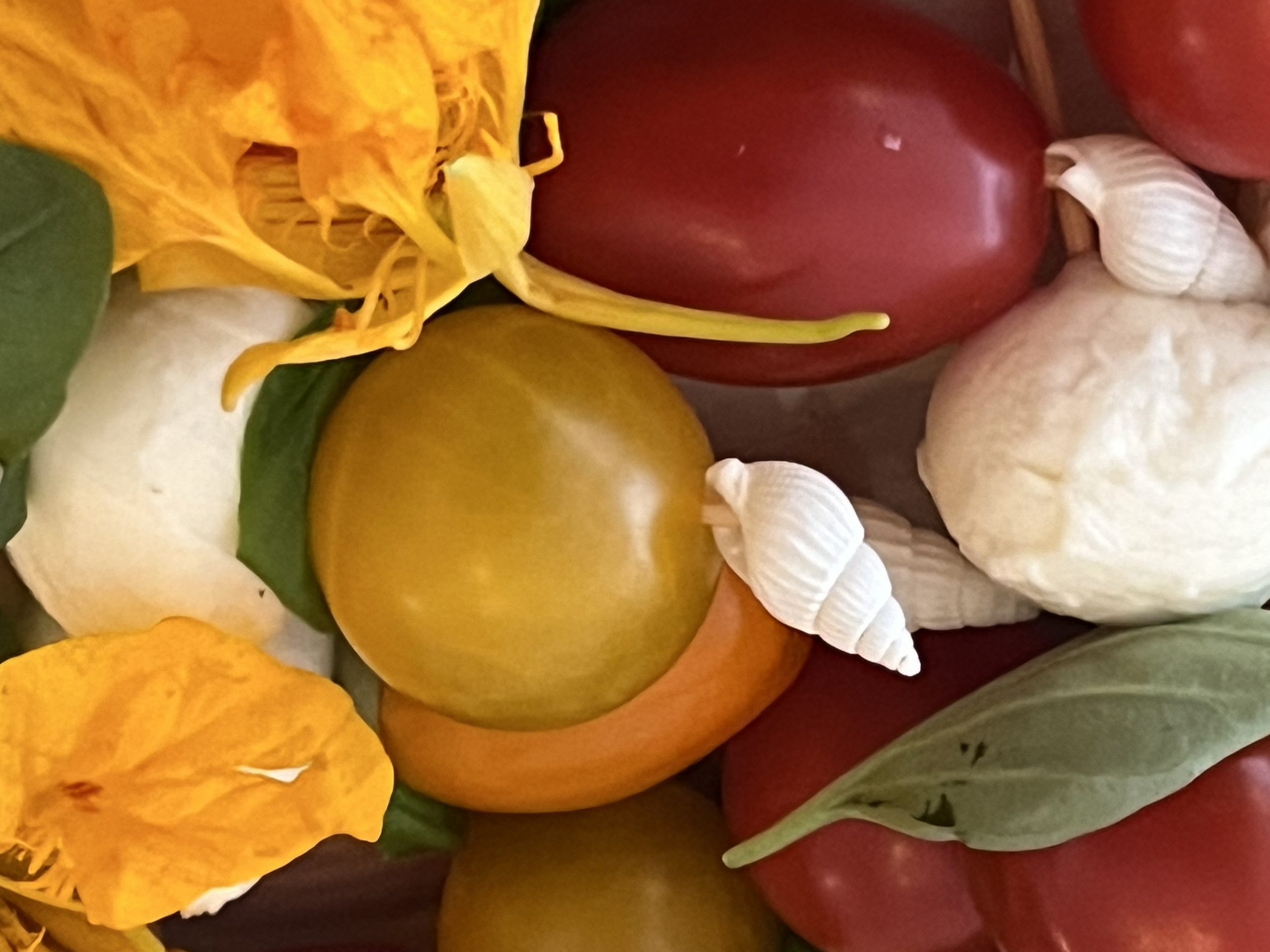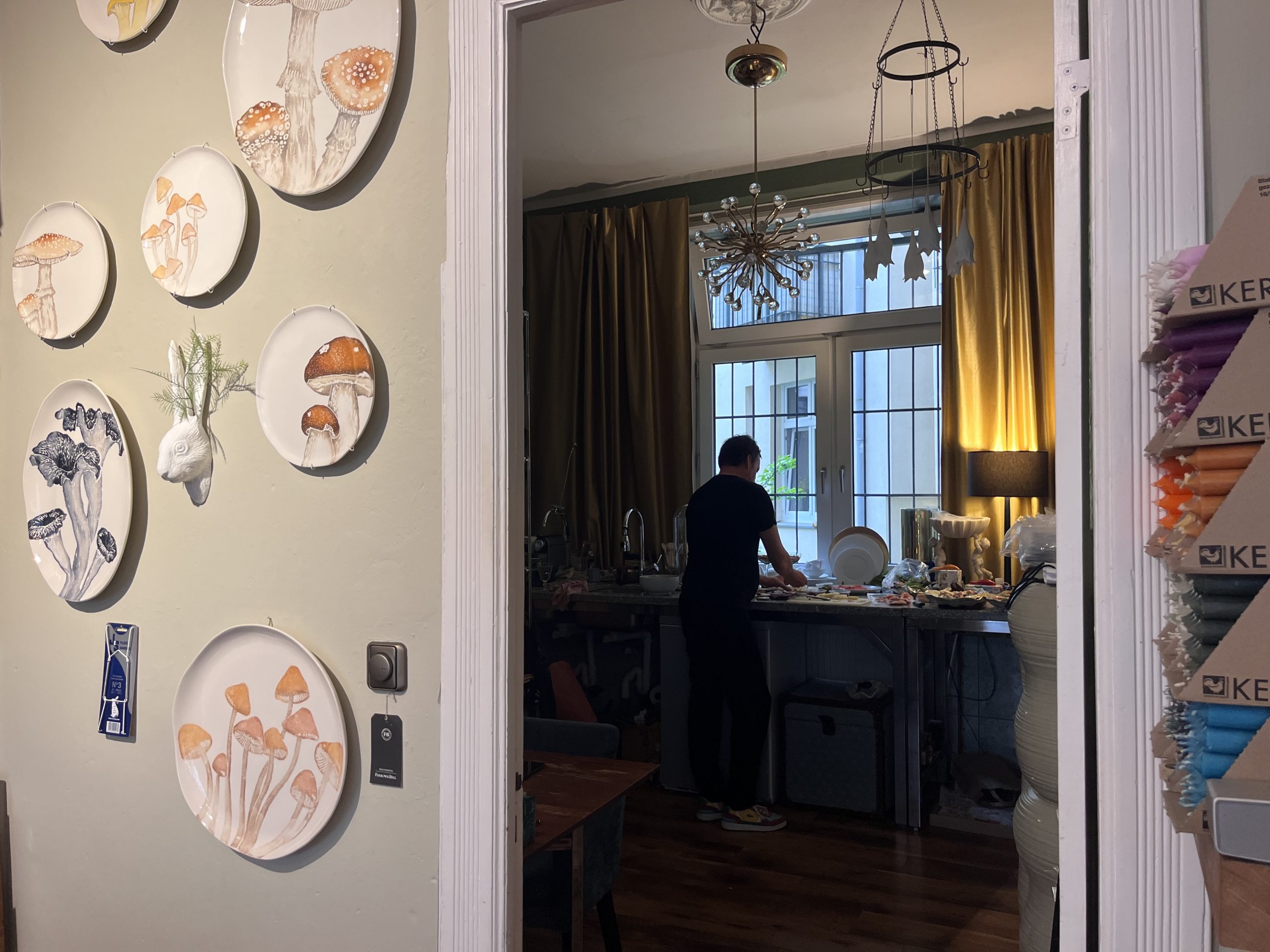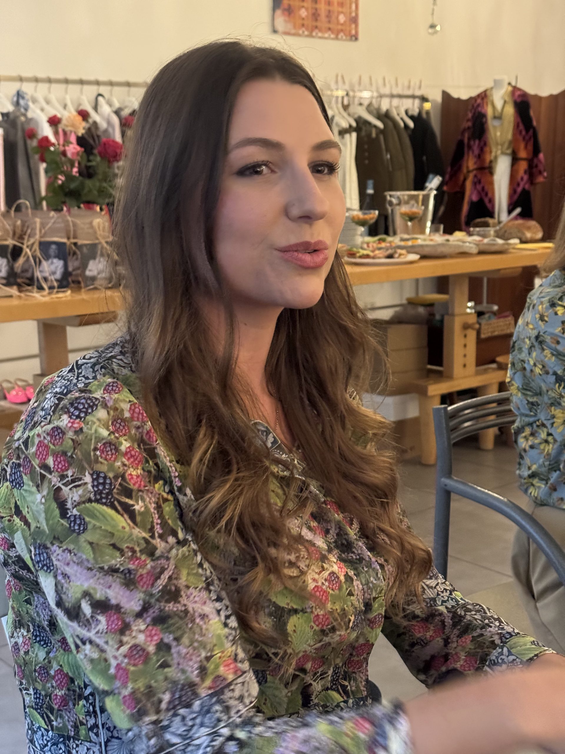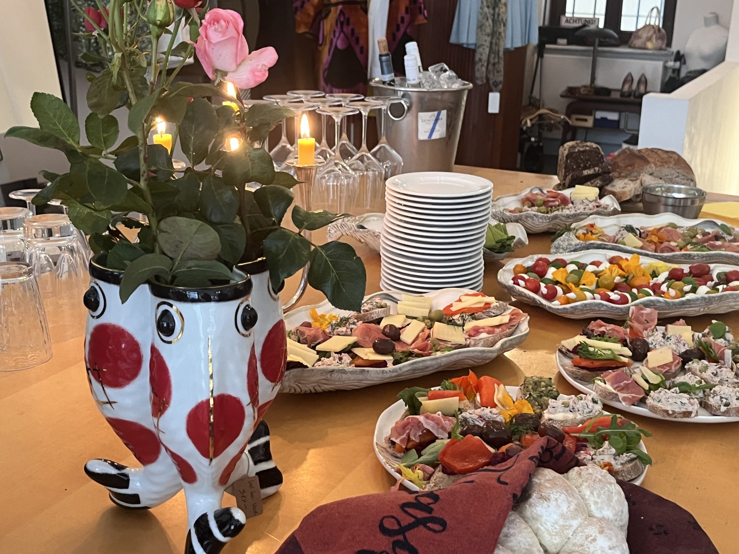 Die Teller mit Austern und Pilz-Motiven gibt es bei unseren Nachbarn zu kaufen, ebenso die kleinen Muschel-Piekser. Geschwind packe ich die neue Rudbecki-Bluse in den Online Shop, die ich an diesem Abend Premiere trug. Ein neues Lieblingsteil.