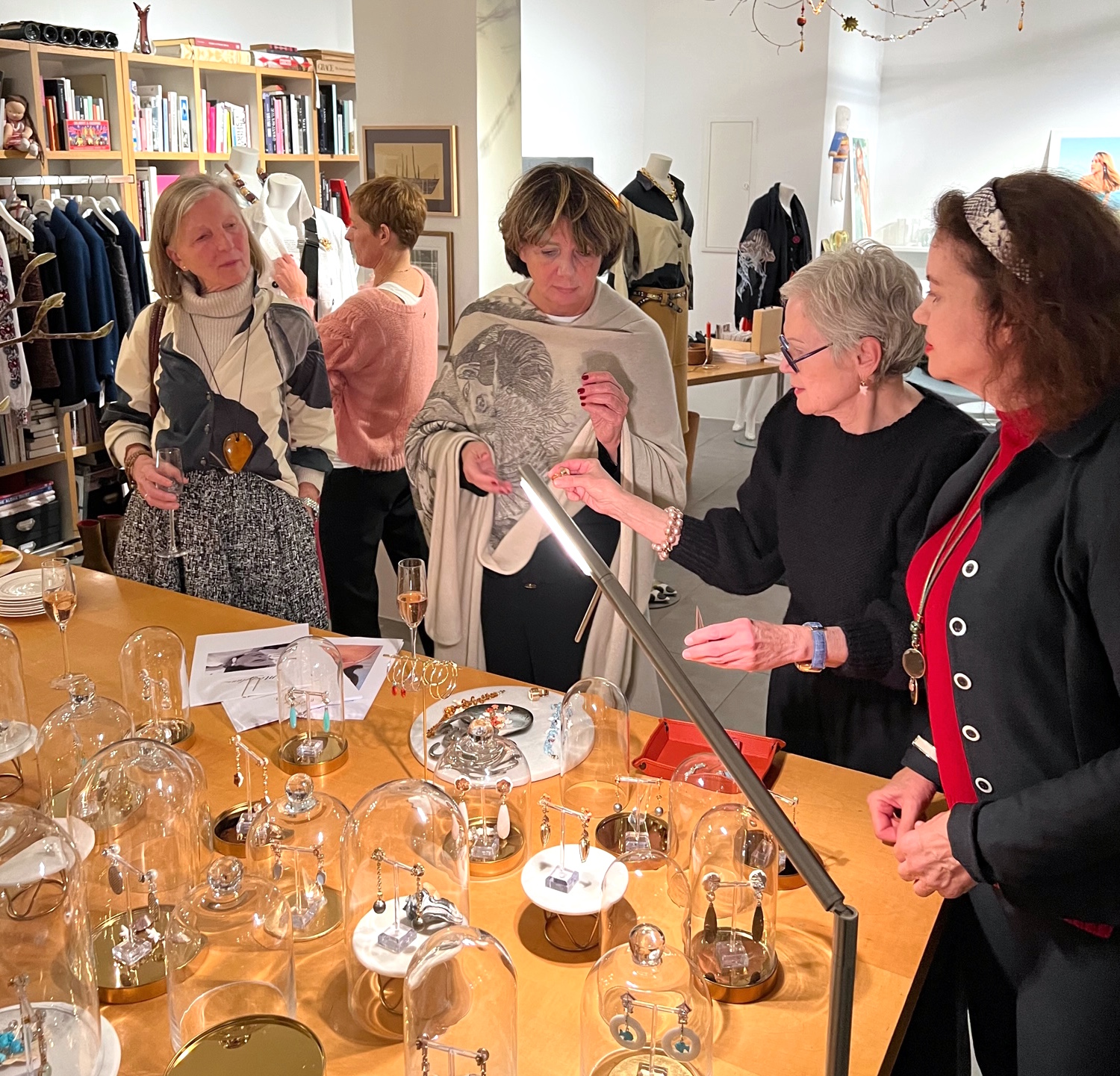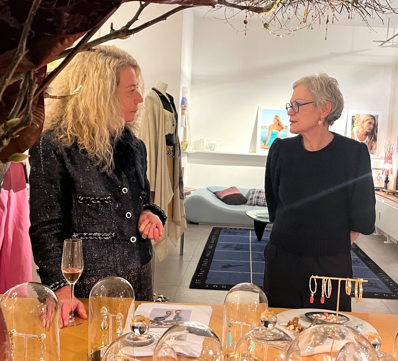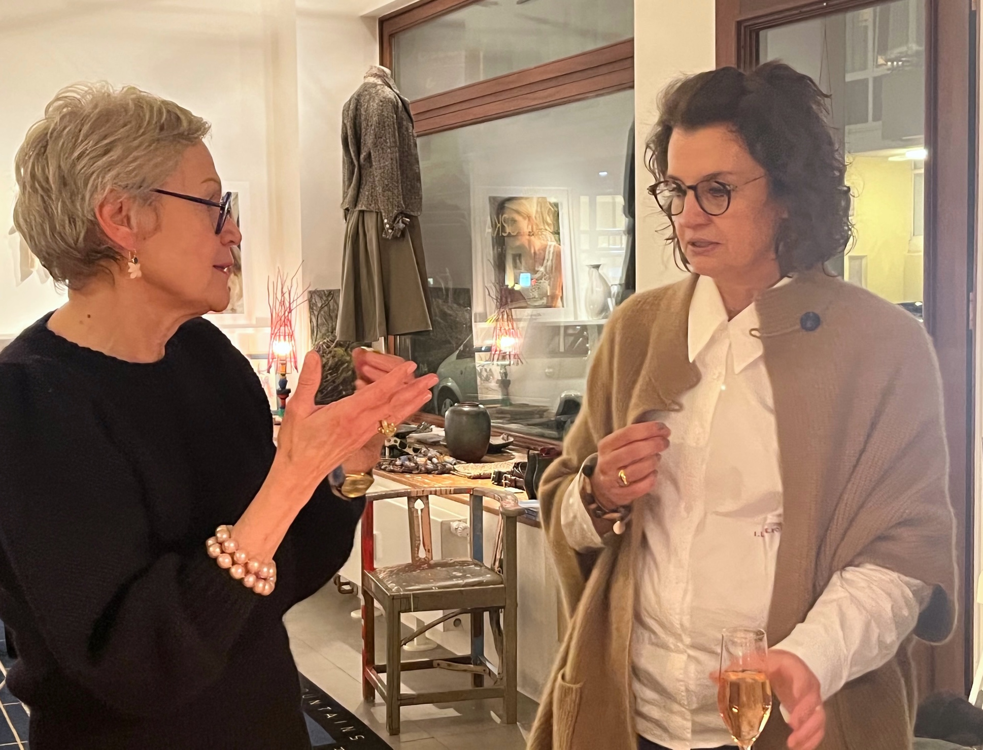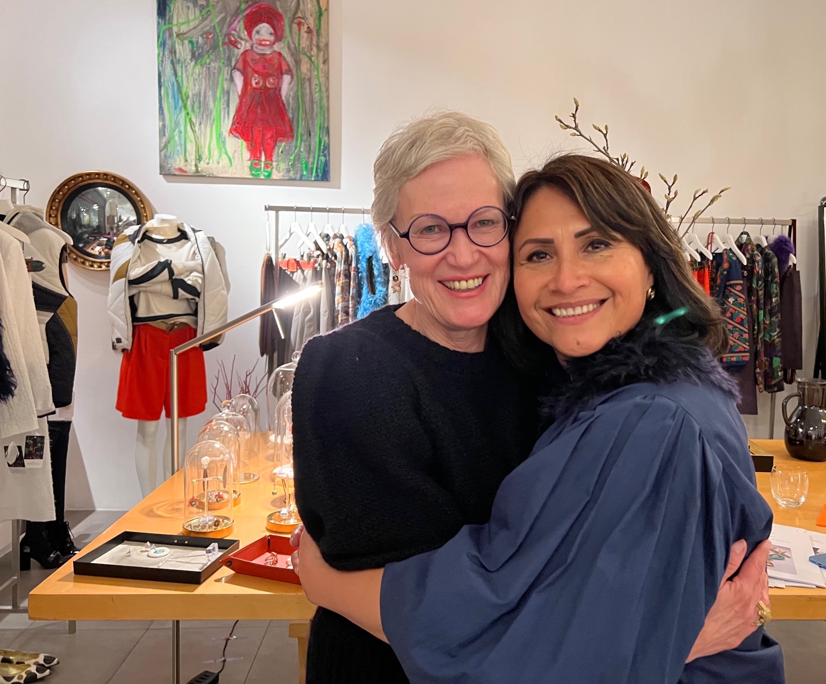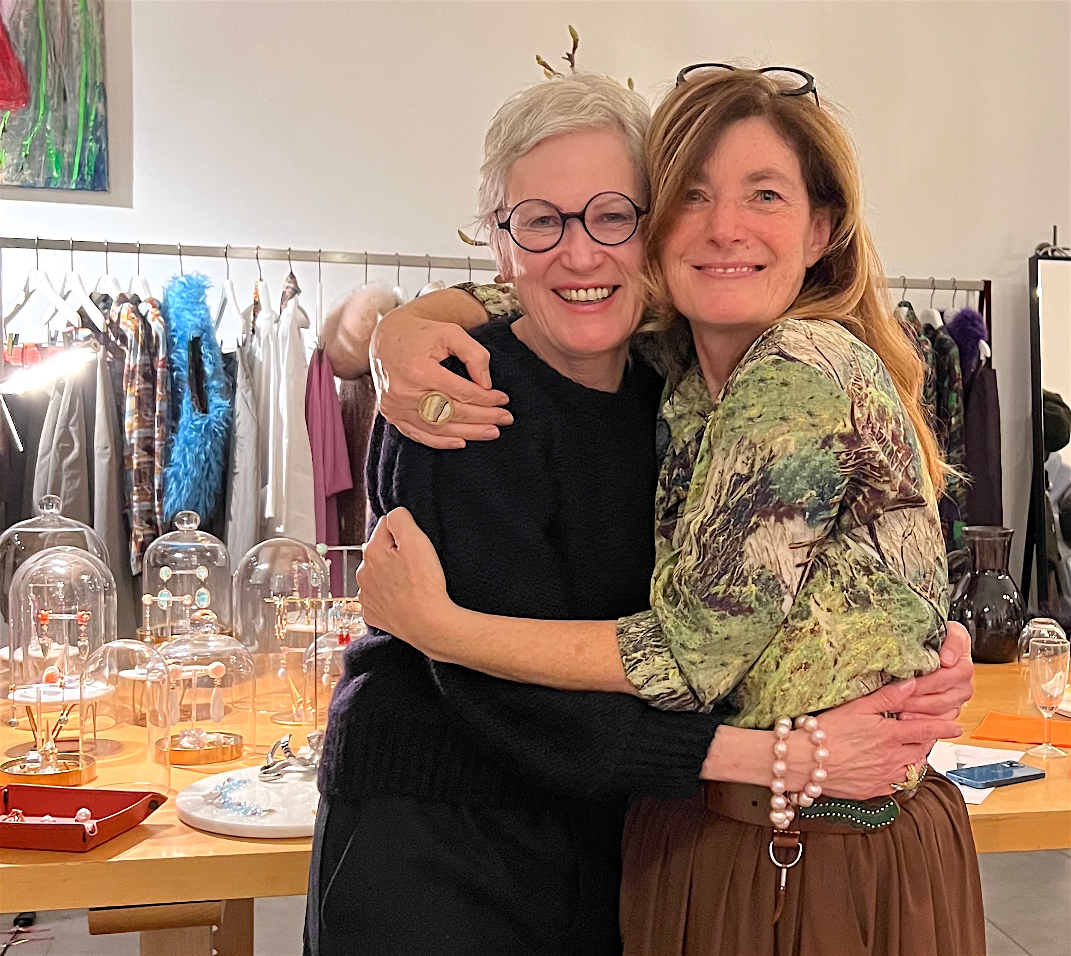 Carmen hat inszwischen schon alles hübsch gemacht, wie es ihr Talent ist, die Kollektionsteile hängen fein säuberlich nebeneinander, das Buffet ist arrangiert. Um sie herum entsteht ein eigener Kosmos von Frohsinn und Optimismus, der Katrin gleichfalls umhüllt. Wir hegen keine Zweifel, es wird ein besonderer Abend, und das wird es auch… – Wieder eine Umarmung.
