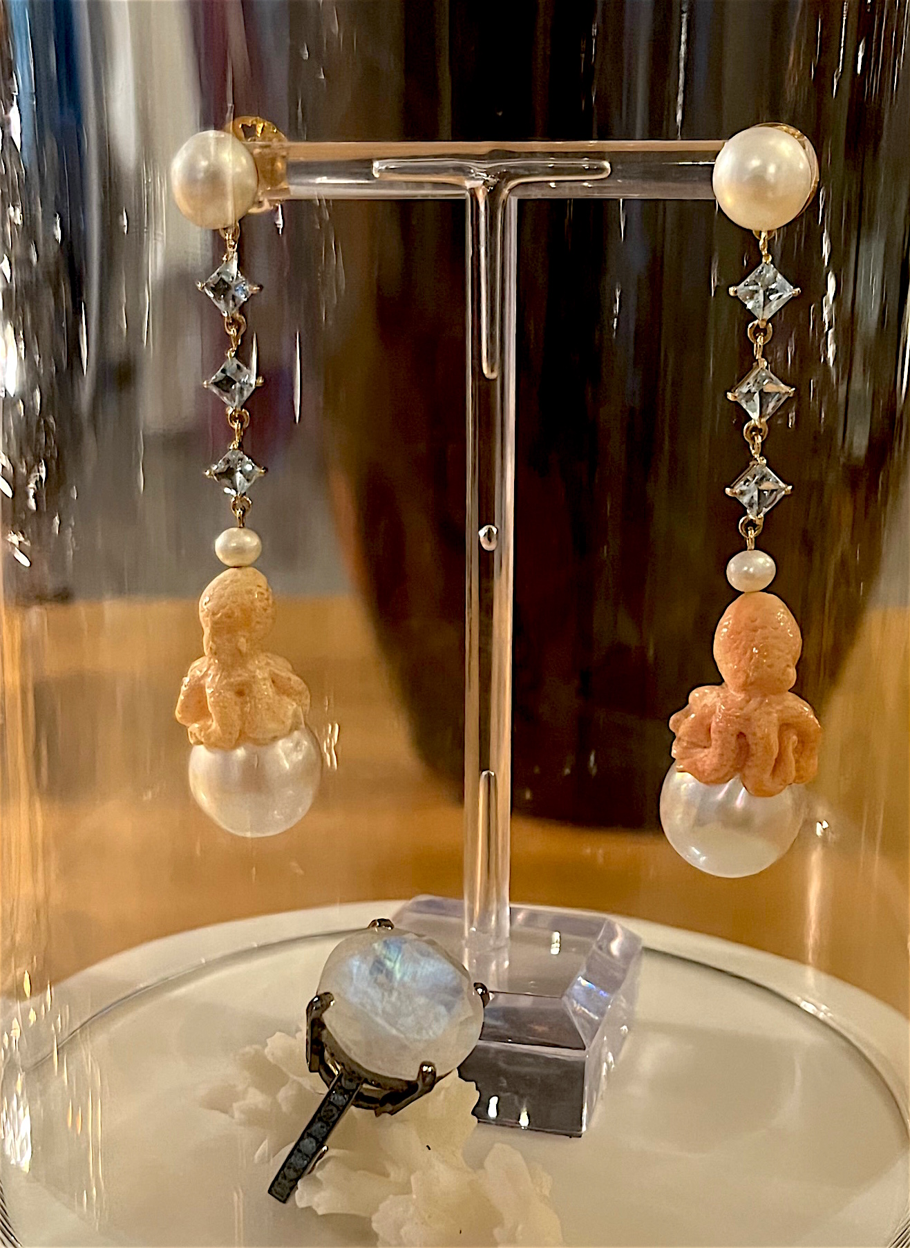 Ohrhänger: Deep Sea Ride, 750 GG, SW Perle, Topase, Corniola Octopusse, Südseeperle, € 4.450. Ring: Magic Moon, 750 PDWG schwarz rhodiniert, Mondstein, Blaue Diamanten, € 5.250