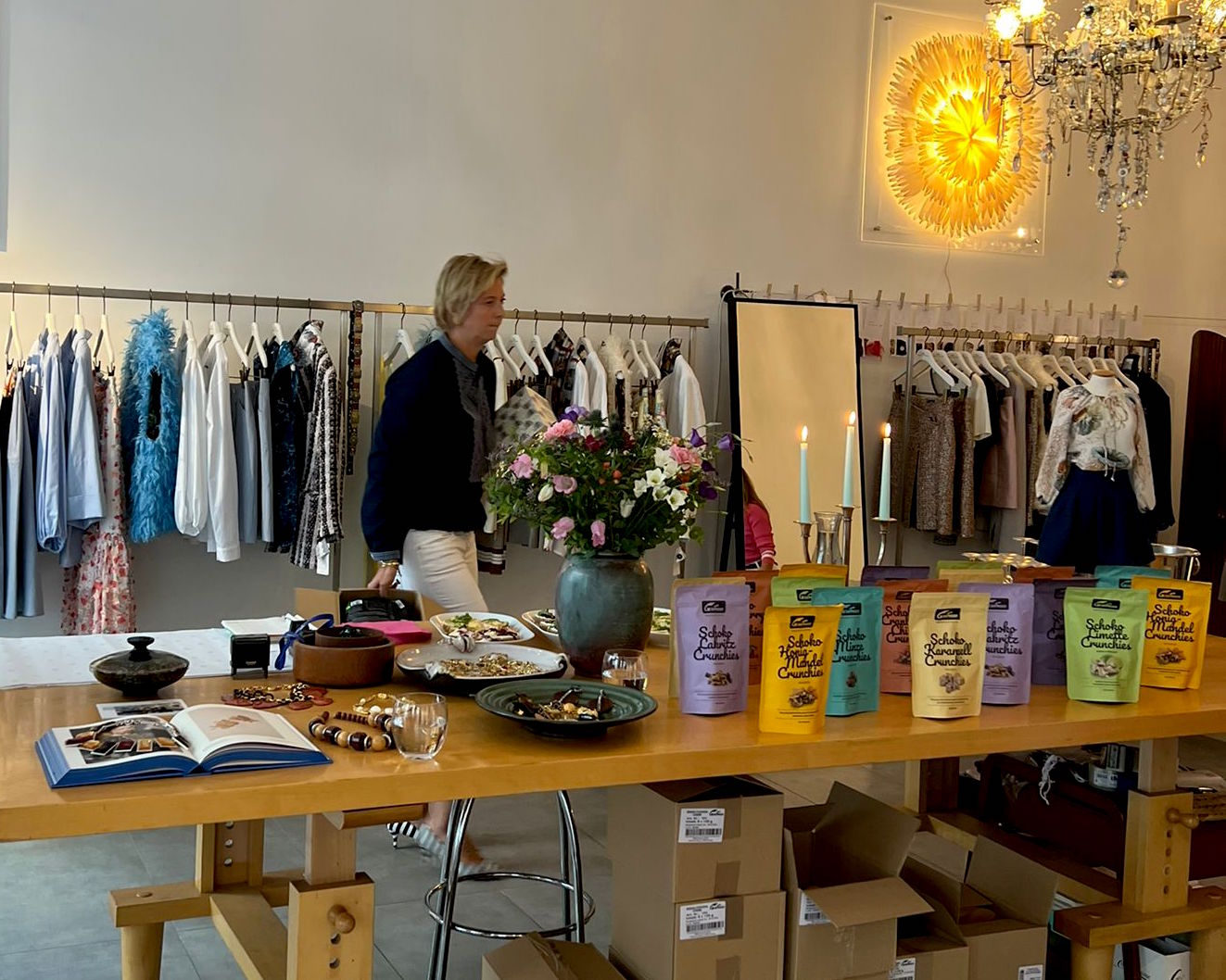 Sie horchte in die Vorlieben ihrer Kindheit hinein: Schoko-Crunchies, und entwickelte daraus mit einem Chocolatier die verschiedenen Sorten: Lakritz-Schoko, Limette-Schoko, Karamell, Honig-Mandel … Während wie plaudern wird probiert, und so manch eine Tüte landet in der eigenen Tasche.