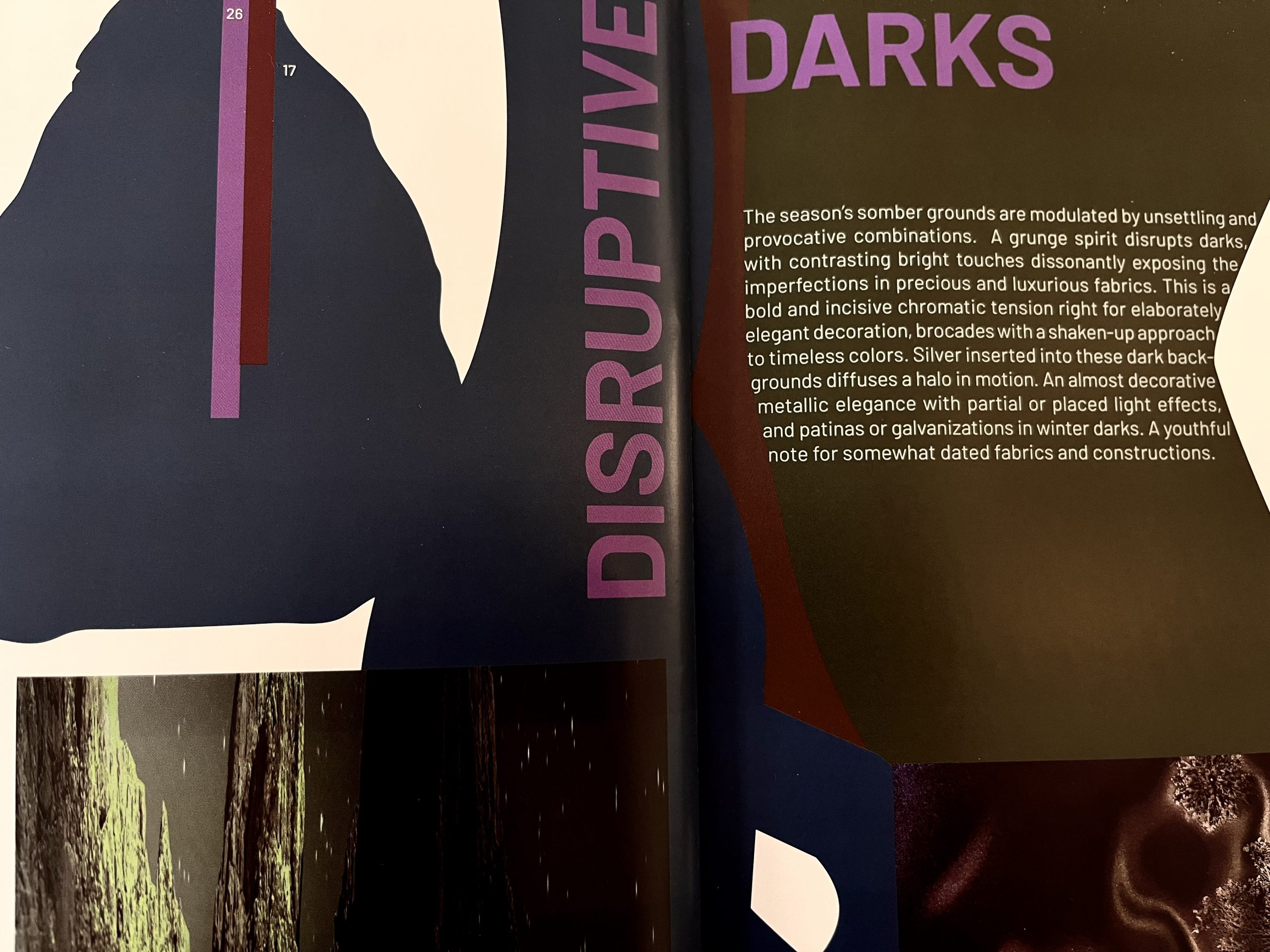 Um mich herum liegen die Farbtafeln, die Doppelseiten mit den Trend-Definitionen, die die Premier Vision in Paris offiziell in die Welt streute, verschlüsselt und gespickt mit Begriffen, die modisch visionär in die Zukunft führen sollen, auslegbar in verschiedene Richtungen. Herbst-Winter 2023/24: “Ernüchtert in der Opulenz” und trotzdem “powerful authentic”.