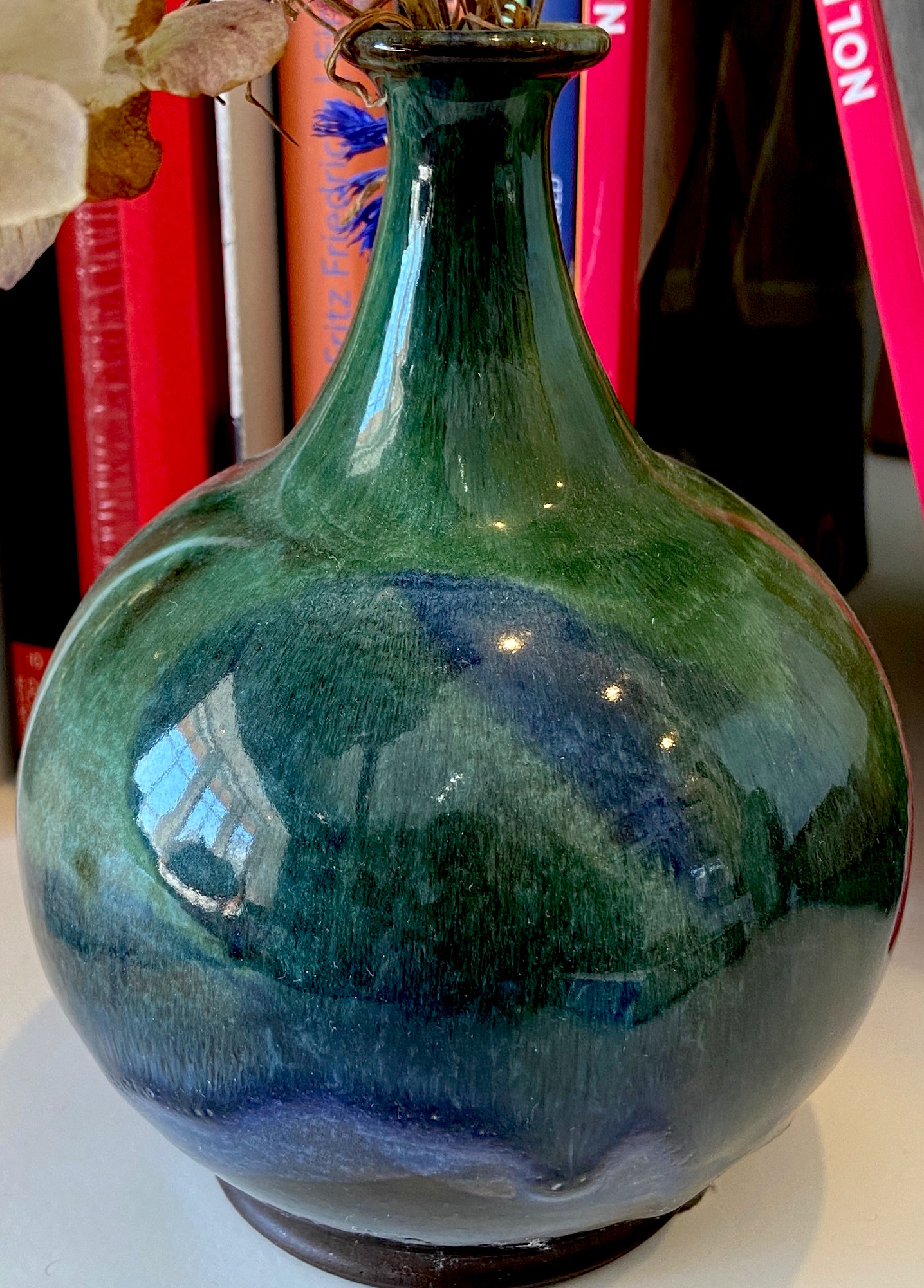 Natürlich, Matisse. Der Katalog liegt hinter mir im Regal. Daneben die Vase von Janne Rückert-Cordua, die ihre Manufaktur in Wenningstedt hatte und mit “Sylt” signierte. Ihre Markenzeichen sind die unnachahmlich schönen Glasuren.