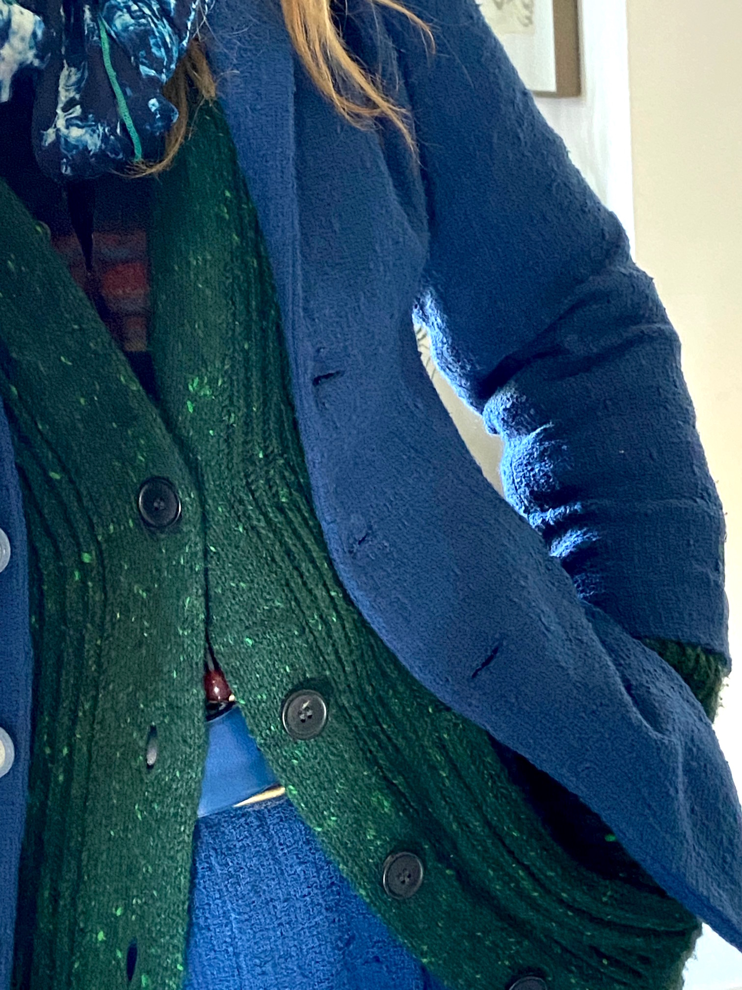 Und das trage ich heute: Die blau kurze Hose samt neuem Blazer, dazu eine Cashmere Wolljacke, eine alte Bluse von Yves Saint Laurent aus den siebziger Jahren, den Prototyp-Gürtel in Royal Blau mit den Medusen und das Waterscape Tuch mit grünem Rand.