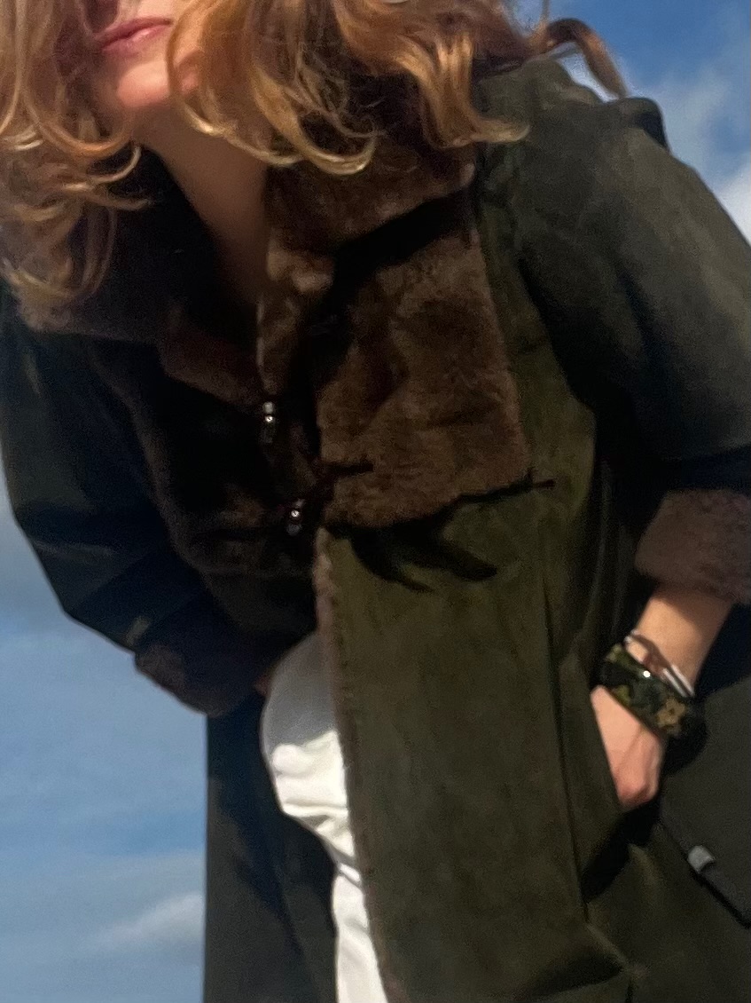 Makelos ist das Stück über die fünfzig Jahre hinweg geblieben. Grünes Wildleder von innen wattiert, gesteppt. Die Taille ist hoch geschnitten, typisch für diese Kollektion. Der Pelz akzentuiert die Passe in der Front und auf dem Rücken.