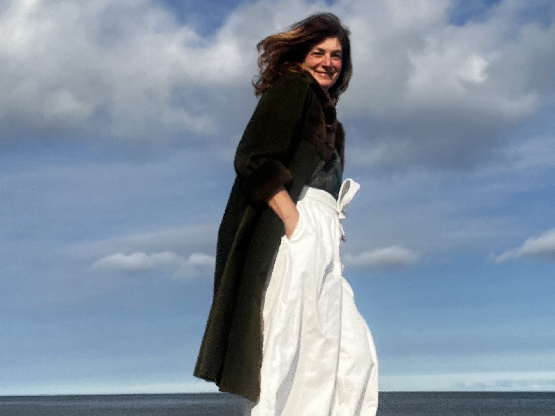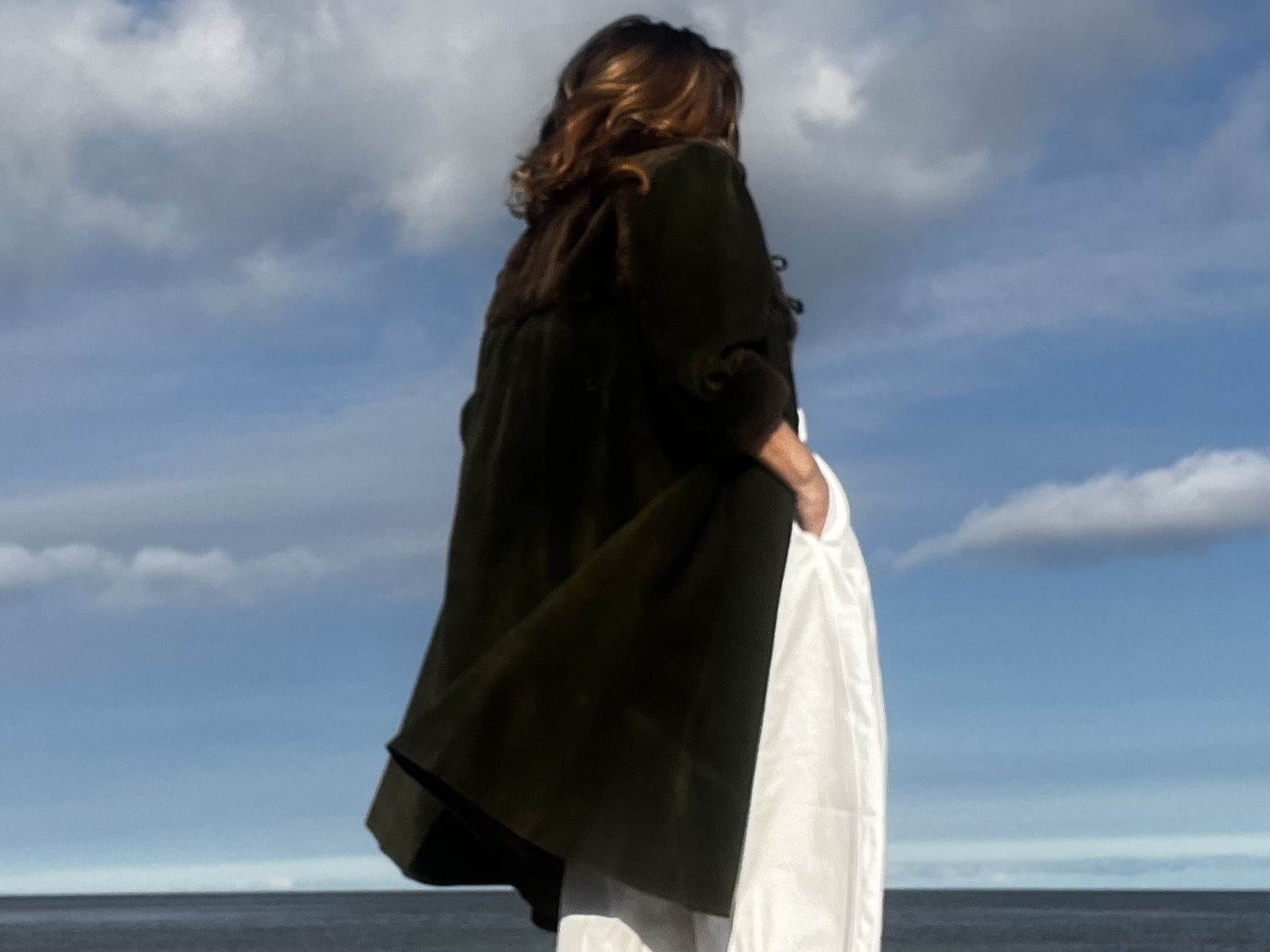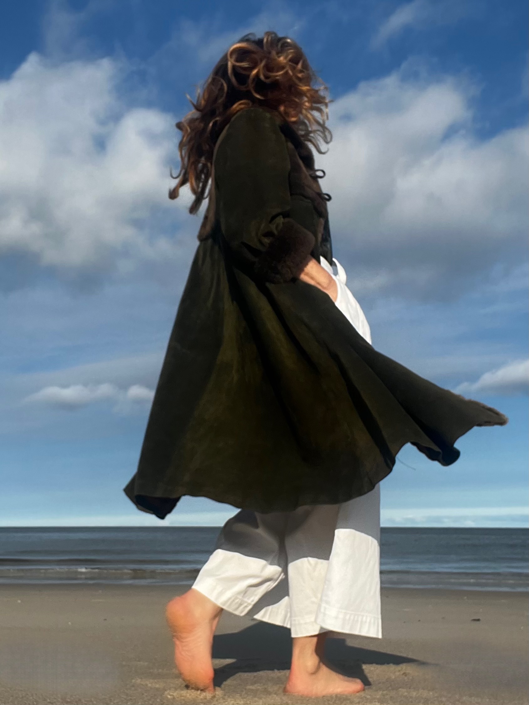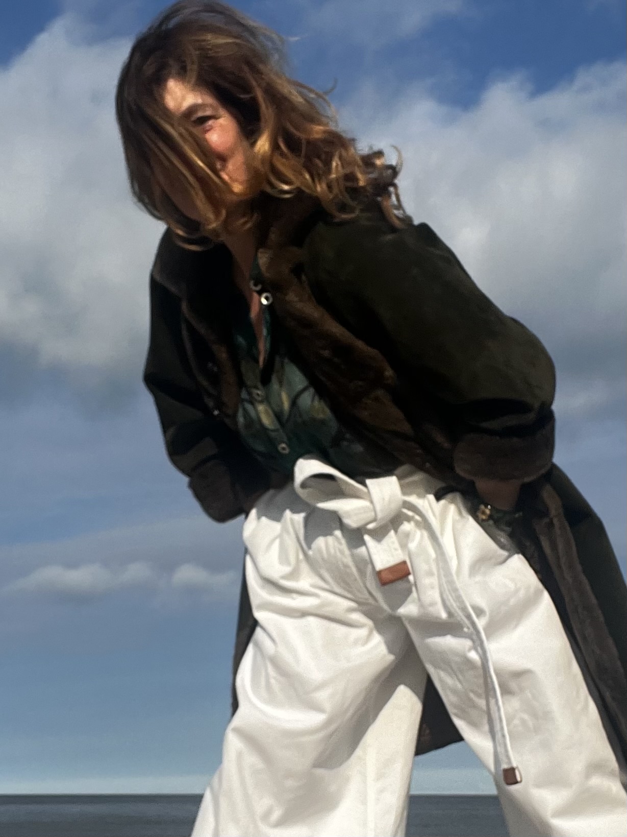 Ein Mantel, ein Sammlerstück, ein One-of-a-Kind. Ich nehm ihn mit den Strand, entführe ihn aus seinem ursprünglichen Kontext von Ballett Russe und dem zaristischen Fin de Siècle. Lasse mich umhüllen von seinem Luxus und seiner zeitlosen Eleganz. Barfuss, mit meiner Bluse und der weißen Jeans von Loewe spüre ich mit jedem Schritt und mit jeder Drehung den Esprit von Freiheit und Schönheit.