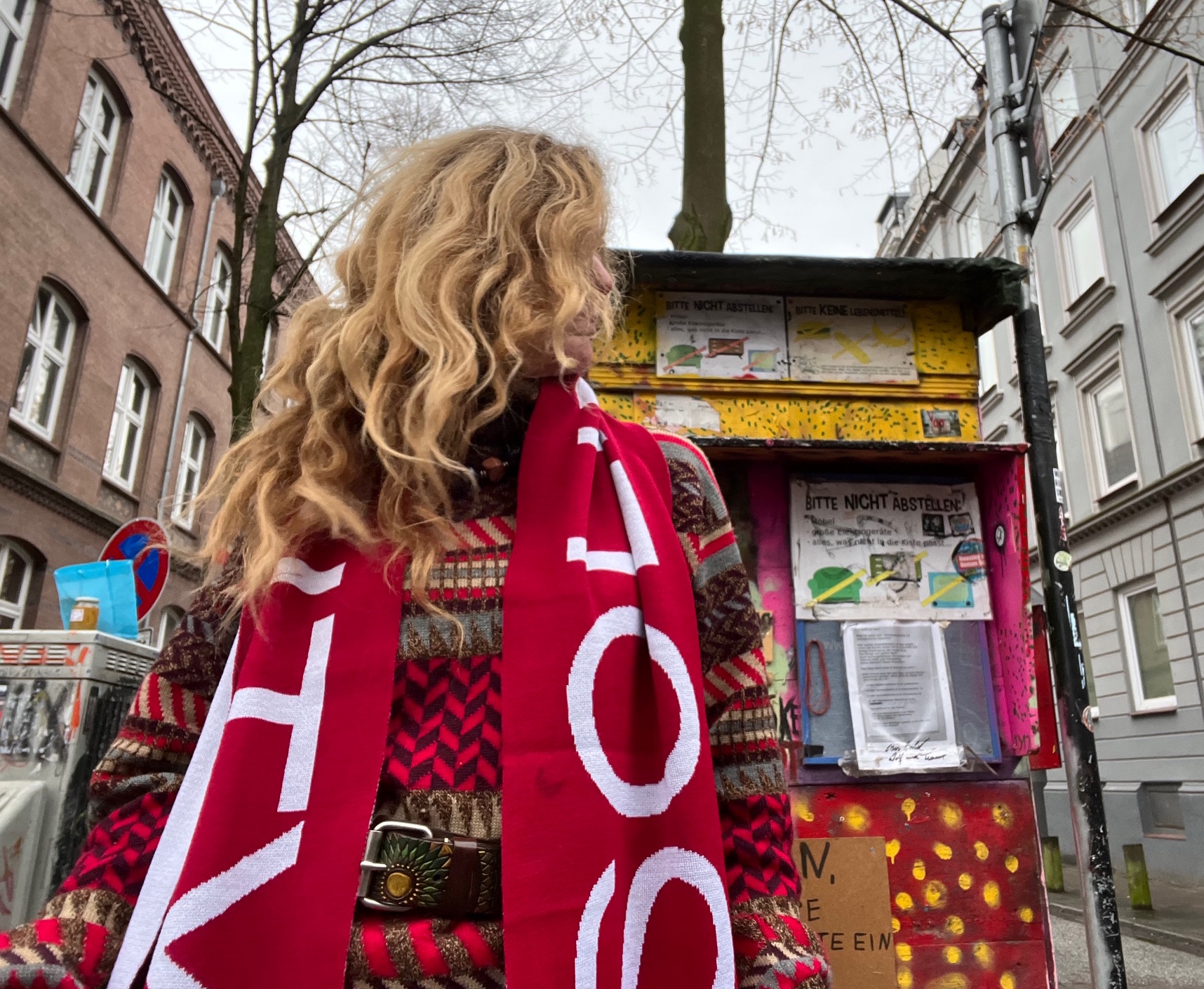Und so fahre ich los durch den Regen, quer durch dieses Multi-Kulti St. Pauli. Während es Klick.Klick macht auf dem Handy, lachen die Leute um mich herum, Menschen, die Brötchen holen und Menschen, die sich gleich an dem nassen gammeligen Stand etwas zum Anziehen suchen. Ein Passant grinst rüber, während er mein Fotoshooting beobachtet: “So kann man es machen”. Ich grinse zurück.
