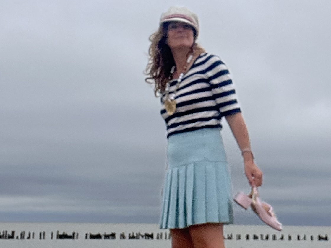 Morgens im Watt. Top YSL, Schuhe Taglia Scarpe, Kette Pierre Cardin, Mütze Chanel, Faltenrock Roma e Toska