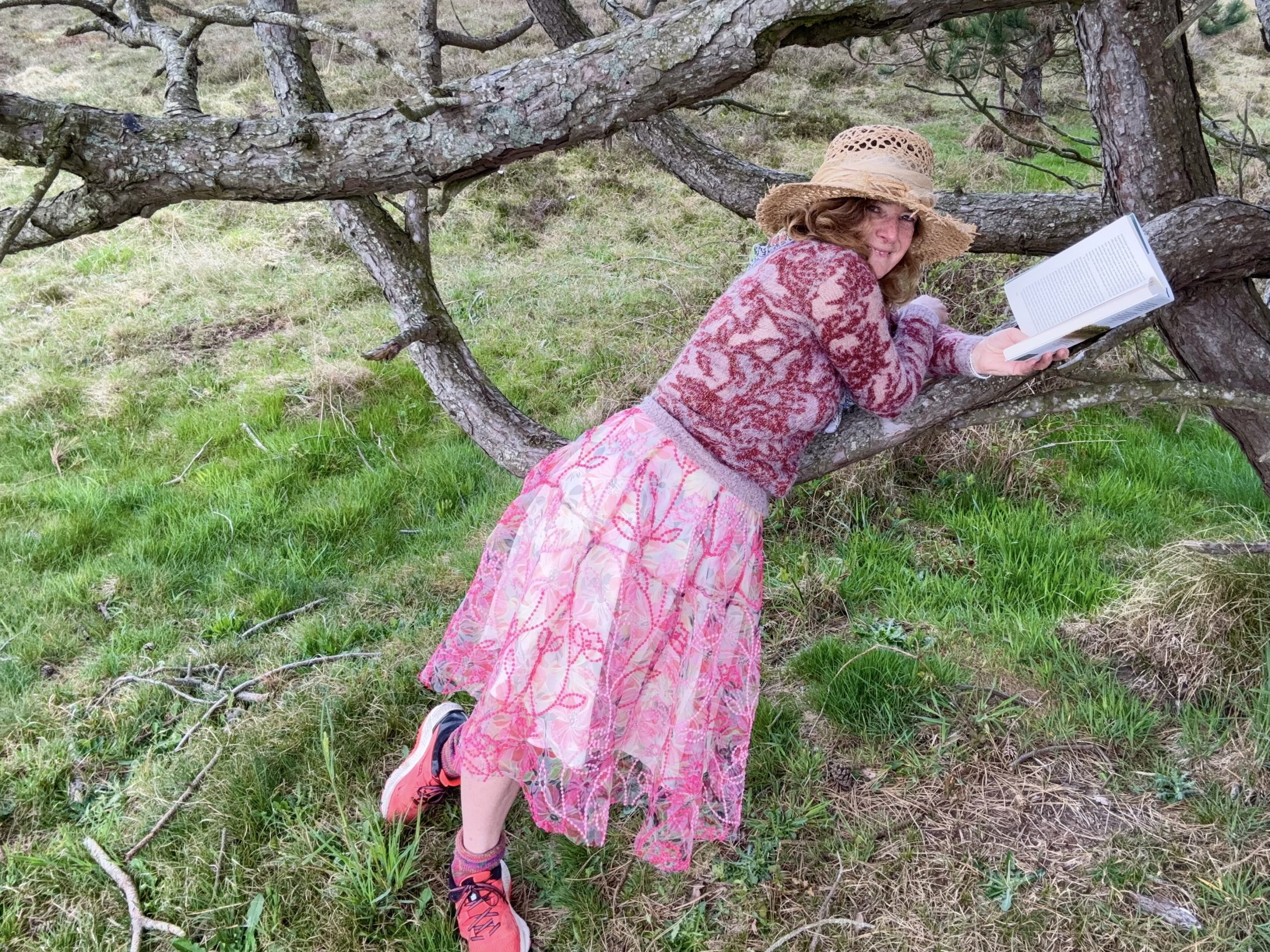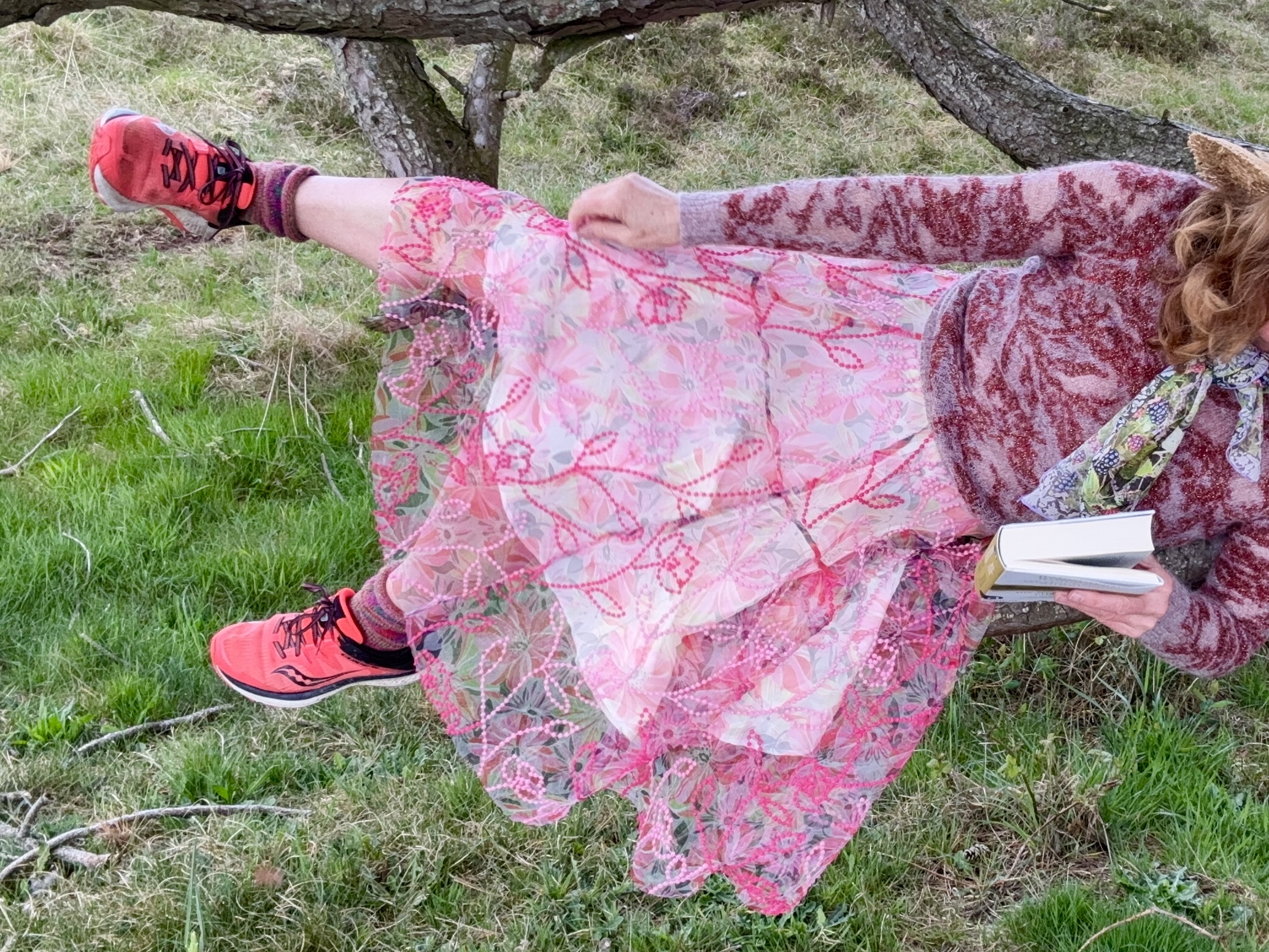 Resolut raffe ich den Blumenorganza Stoff mit der einen Hand, damit er nicht an den Dorner der Sträuchern hängenbleibt. Das Buch unter dem Arm geklemmt. Die Hunde trollen vor oder trotten hinterher. Friedlich wirkt es zauberhaft still.
