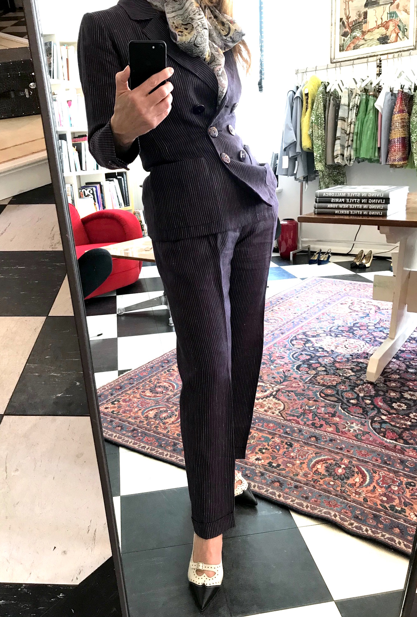 Abb.: Anzug Yves Saint Laurent. Nadelstreifen lila-weiß, Leinen-Seide, Größe 34-36 (€ 850), Seidenchiffon Schal Kopernikus (€198), Empathie-Shirt (€89 inkl. Maske), Schuhe Taglia Scarpe (€390)
