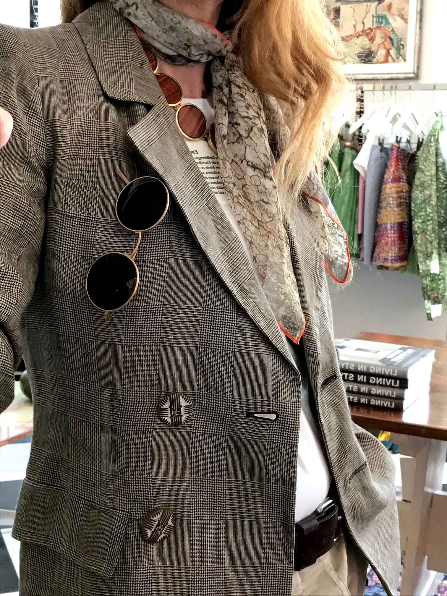 Abb: Vintage Yves Saint Laurent Blazer, Leinen Seide, Größe 36 (€ 750), Empathie Shirt (€89 inkl. Maske), Savanne Tuch , 75 x 75 cm (€ 80)