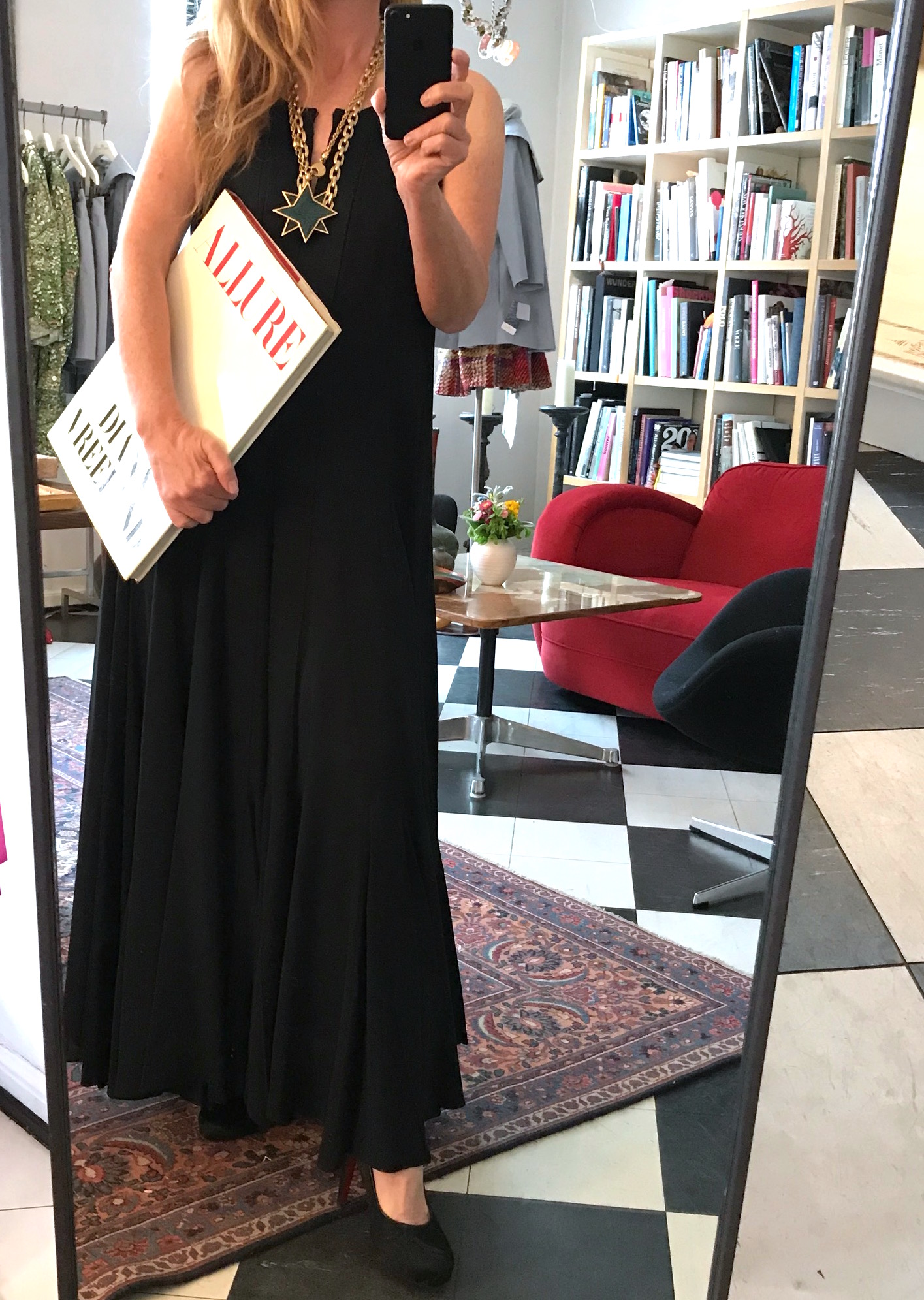 Was für ein Spaß! Ich trage die Vintage Abendkleider, die zum Teil noch aus dem Besitz der legendären Angelica Blechschmidt stammen, ehemalige Chefredakteurin der Vogue Deutschland. Sie wäre sicherlich in diesen Zeiten ebenfalls barfuß in ihre Pumps gestiegen und hätte aus der selbstreflektierenden Langeweile einen Event gemacht.