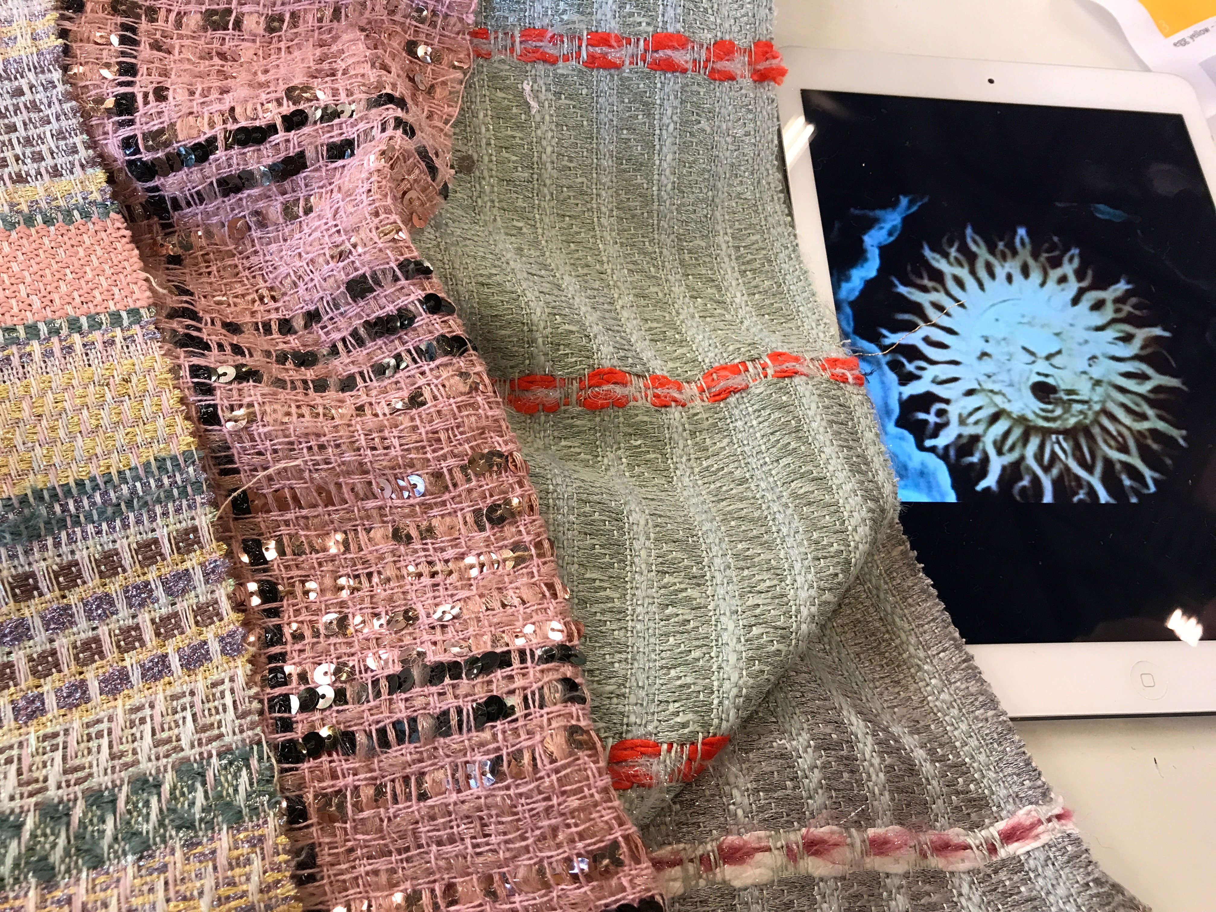Toska und ich arbeiten Hand in Hand, hochkonzentriert, ein Gleichklang mit unterschiedlichen Akzenten: sie die Fokussierte, ich die Spielerische. Wir lachen uns kaputt, als ich mal wieder in die Kitsch-Kiste greife – ja im Ernst, uns stehen wieder Zeiten bevor mit Lurex-Glitter auf Stoff gemalt, ein bißchen Froufrou kombiniert mit Tartan Karo. Bordüren erleben ein Revival und die Farben zelebrieren endlich wieder ein Wald-Grün. Aber keine Angst, daneben haben die Trend-Gurus auch das Neon-orange und das rauchige Rot gepackt, damit wir locker offen bleiben für unsere Orakel-Themen.