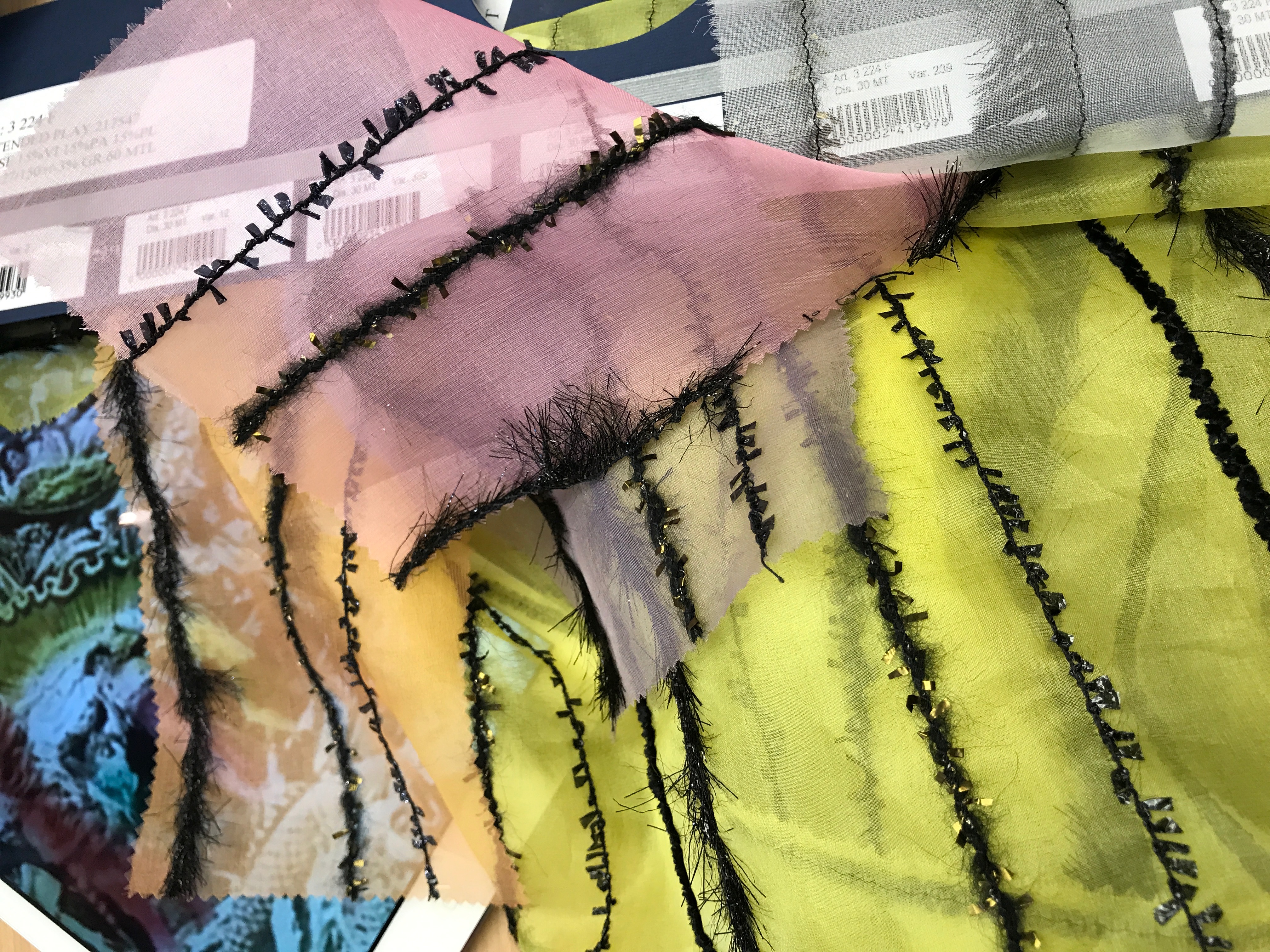 Es wird poetisch, fabulös, surreal. Wenn wir die Welt nicht mehr verstehen, müssen wir Platz machen für die Illusionisten. Wer mich kennt, weiß, dass nun die Zeit für den Vortrag gekommen ist. Die Stoff-Designer lauschen und verstehen, die Franzosen verstehen sogar am besten, denn meine Inspirationen kommen aus ihrem Land, aus ihrer Vergangenheit. Mitgebrachte Bilder liegen neben Stofflaschen. Es passt! Es wird aufregend! Eine neue Welt öffnet sich – ohne Übertreibung. Das ist der Thrill des Designers: jede Saison sich eine neue Geschichte zu erzählen mit den Mitteln der Mode.
