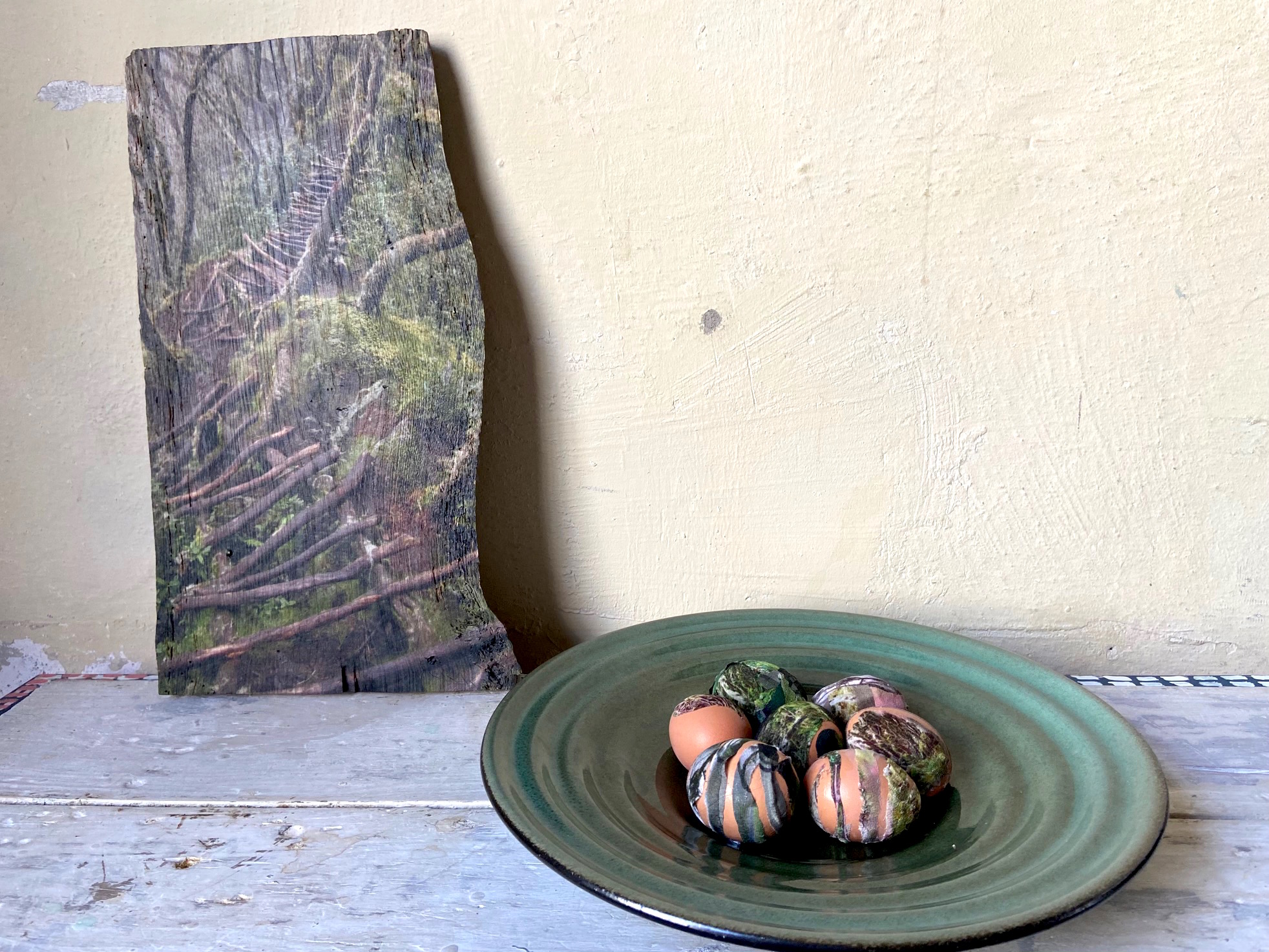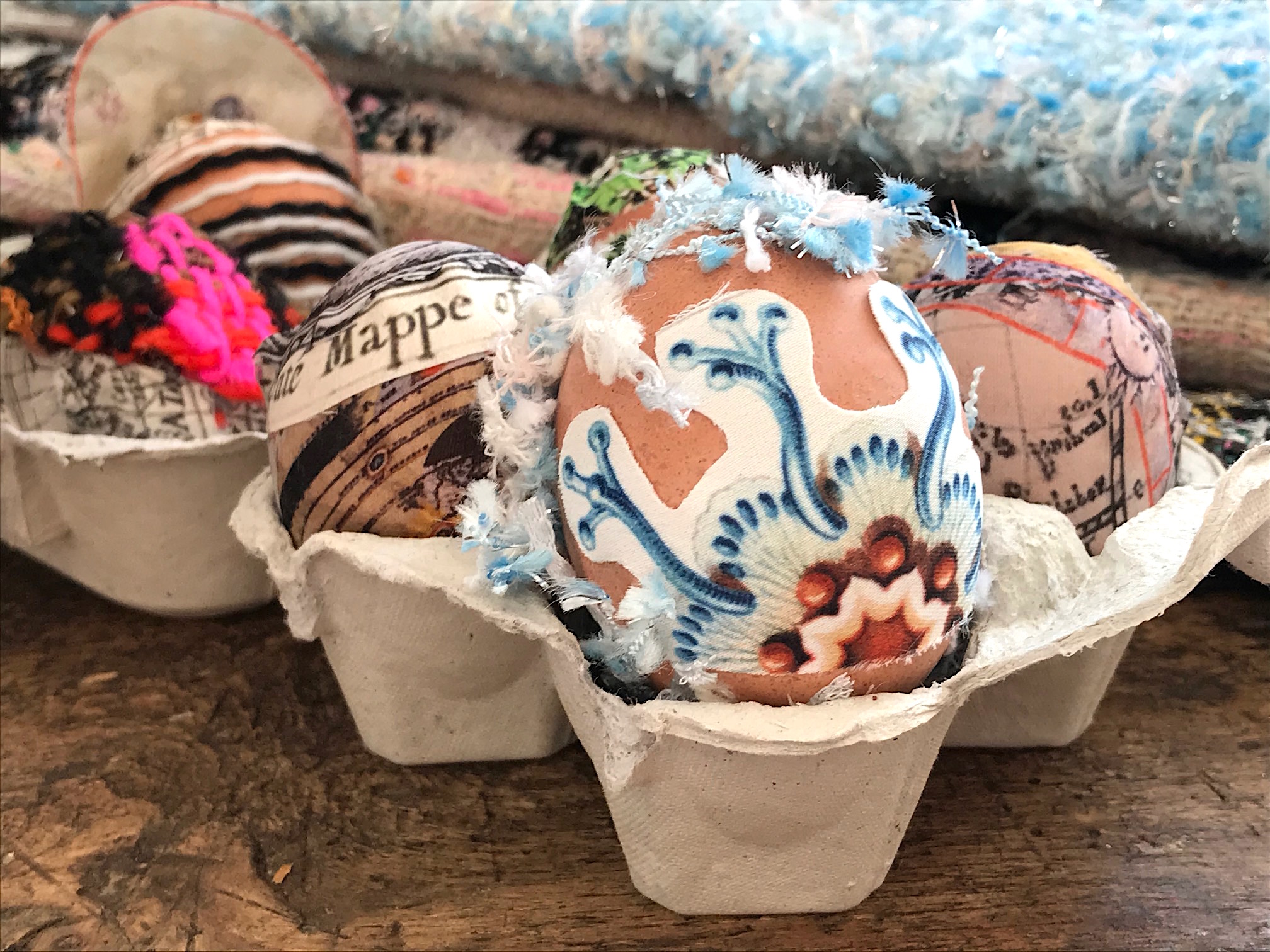 Ostern steht wieder vor der Tür und beinahe habe ich es vergessen, verdrängt die schönen kleinen Vorbereitungen, die Bastelübungen mit gekochten oder ausgepusteten Eiern, mit Kleber an den Fingern und Schnipsel von Stoffen und Papieren auf dem Boden … Letztes Jahr im ersten Lockdown (verrückt hört es sich an), da hatte ich mehr Muße, saß hinter verschlossenen Türen in der MILCHSTRASSE 11 und beklebte die Ostereier.